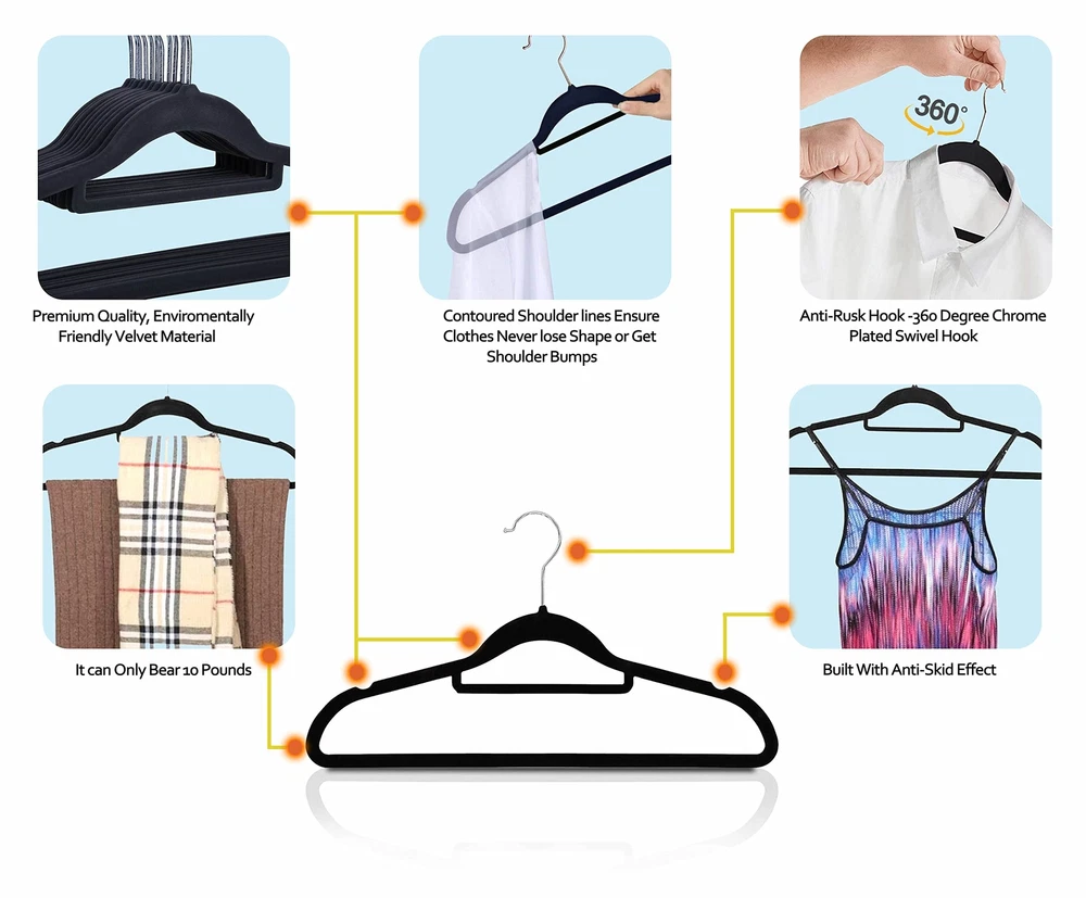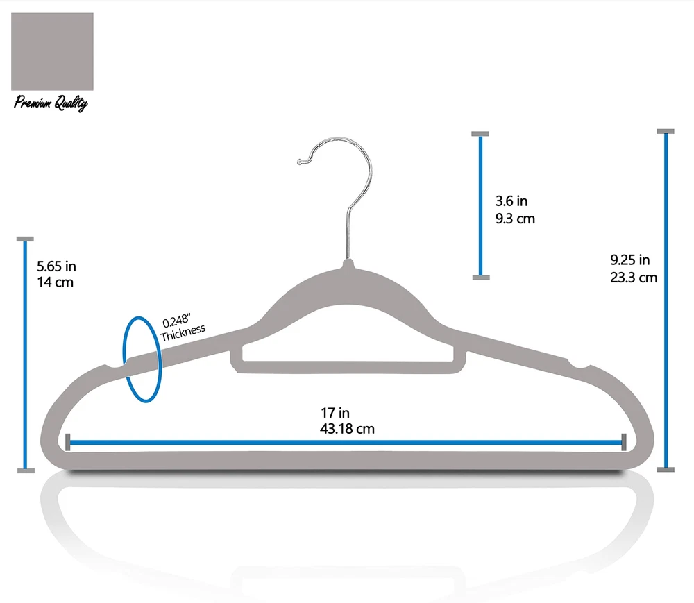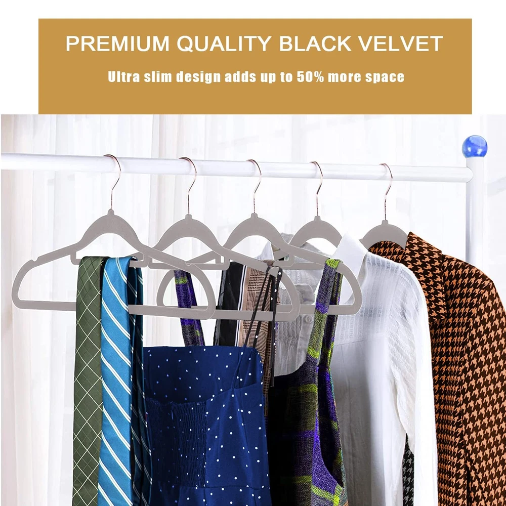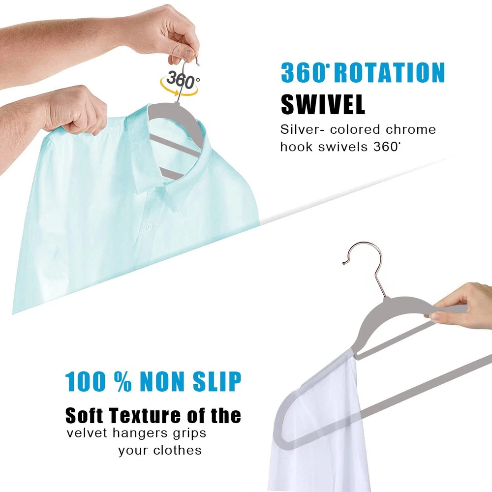 【Velvet Hanger 50 Pack】: These elegant velvet hangers add class to your wardrobe with each hanger measuring 44.5*23.5*0.5 cm making it oddly pleasing to the eyes. Velvet non slip hangers having 360 degree swivel, shiny hooks and notched shoulders that will make hanging clothes a simple pleasure. 【Velvet Hanger 50 Pack】: These elegant velvet hangers add class to your wardrobe with each hanger measuring 44.5*23.5*0.5 cm making it oddly pleasing to the eyes. Velvet non slip hangers having 360 degree swivel, shiny hooks and notched shoulders that will make hanging clothes a simple pleasure. 【High Quality】: With a thickness of only 0.5 cm, these slim hangers save space in Closet. Ultra-thin construction allows you to hang ties, shirts and jackets at once on hanger to keep your closet organized in less space having 360 degree Swivel Hook rotate feature. 【Crease Free】: The soft velvet flocking leaves no crease on your pants or blouses when you fold them over and gives you crease-free, ready-to-wear closet option every day. 【Space Efficient】: Our slim and sleek velvet hangers will help maximize your closet space so you no longer have to deal with crammed wardrobes ideal for hanging heavy garments such as coats, pants, trousers & Skirt. The shoulder line is contoured to help preserve cloth shape and features precisely-cut notches for keeping straps in place. 【Anti Slip】: The velvet coated surface of the hangers keeps your suits, pants, and delicate blouses from falling or sagging. This Set of non-slip hangers are gentle and having non-slip velvet surface holds on to clothes tighter than you do, so that nothing, not even a silk blouse slips off. It's great for your tank tops, dress, bars, tie, belts, nightgowns, shawls, skirts overalls tightly without slip.