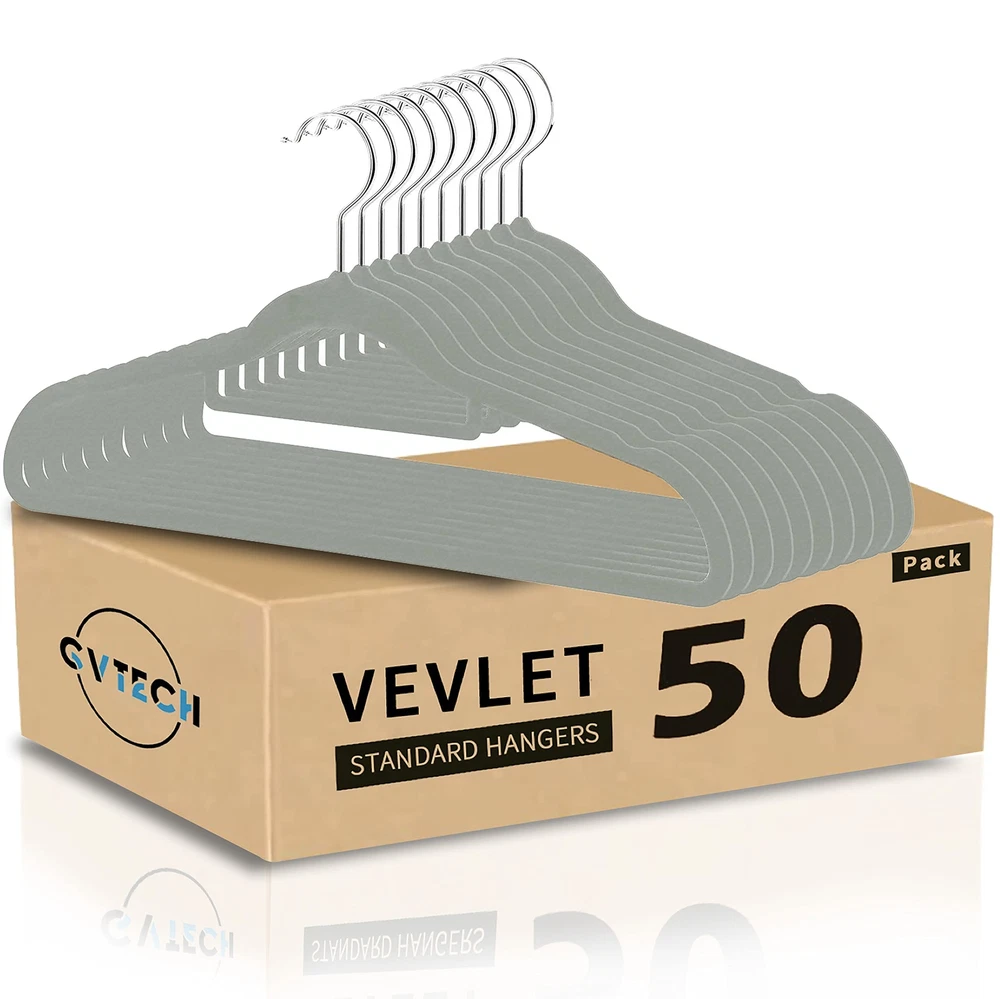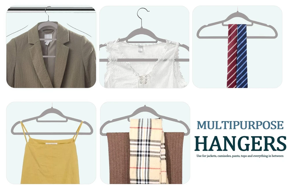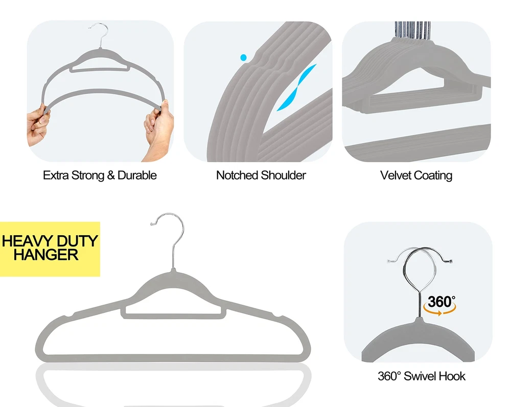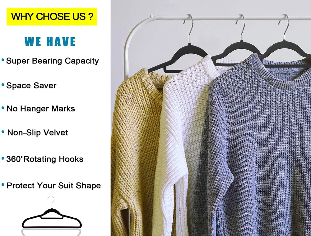 【Velvet Hanger 50 Pack】: These elegant velvet hangers add class to your wardrobe with each hanger measuring 44.5*23.5*0.5 cm making it oddly pleasing to the eyes. Velvet non slip hangers having 360 degree swivel, shiny hooks and notched shoulders that will make hanging clothes a simple pleasure. 【Velvet Hanger 50 Pack】: These elegant velvet hangers add class to your wardrobe with each hanger measuring 44.5*23.5*0.5 cm making it oddly pleasing to the eyes. Velvet non slip hangers having 360 degree swivel, shiny hooks and notched shoulders that will make hanging clothes a simple pleasure. 【High Quality】: With a thickness of only 0.5 cm, these slim hangers save space in Closet. Ultra-thin construction allows you to hang ties, shirts and jackets at once on hanger to keep your closet organized in less space having 360 degree Swivel Hook rotate feature. 【Crease Free】: The soft velvet flocking leaves no crease on your pants or blouses when you fold them over and gives you crease-free, ready-to-wear closet option every day. 【Space Efficient】: Our slim and sleek velvet hangers will help maximize your closet space so you no longer have to deal with crammed wardrobes ideal for hanging heavy garments such as coats, pants, trousers & Skirt. The shoulder line is contoured to help preserve cloth shape and features precisely-cut notches for keeping straps in place. 【Anti Slip】: The velvet coated surface of the hangers keeps your suits, pants, and delicate blouses from falling or sagging. This Set of non-slip hangers are gentle and having non-slip velvet surface holds on to clothes tighter than you do, so that nothing, not even a silk blouse slips off. It's great for your tank tops, dress, bars, tie, belts, nightgowns, shawls, skirts overalls tightly without slip.