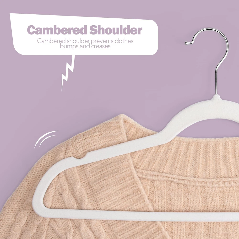 White Velvet Hangers 20 Pack Durable and Sturdy: Crafted from velvet and ABS Plastic; Steadily hold heavy clothing of up to 11lbs; As strong as wooden suit hanger but much thinner and lighter; Durable hanging bar with black velvet to hold your shirt, jeans and pants Space Saving: The ultra-thin design with an optimal size of 17.5"L x 1/4"W x 9"H; Each hanger maximizes the storage space and makes full use of your wardrobe and room to make it clutter-free; Increases closet space by up to 75%, good for clothing sorting Non Slip Design: The specially developed shoulder line help to promise worry-free preservation of the clothing's shape; The groove on shoulder could be used to hang clothes with thin shoulder strap, great without slipping off for clothes on closet storage Stylish Finish: Soft and luxurious velvet, unlike plastic or metal hangers; The finest velvet material for all our velvet hangers help to keep the fuzz from shedding off and stain your clothing; Prevents clothes from slip-off the velvet flocked hangers Daily Use 20 Pack: Galvanized 360° swivel metal hook meets different hanging angle needs; A perfect combination on college back to school supplies bulk items for girls boys; Premium quality hangers, popular in individuals and businesses in global markets