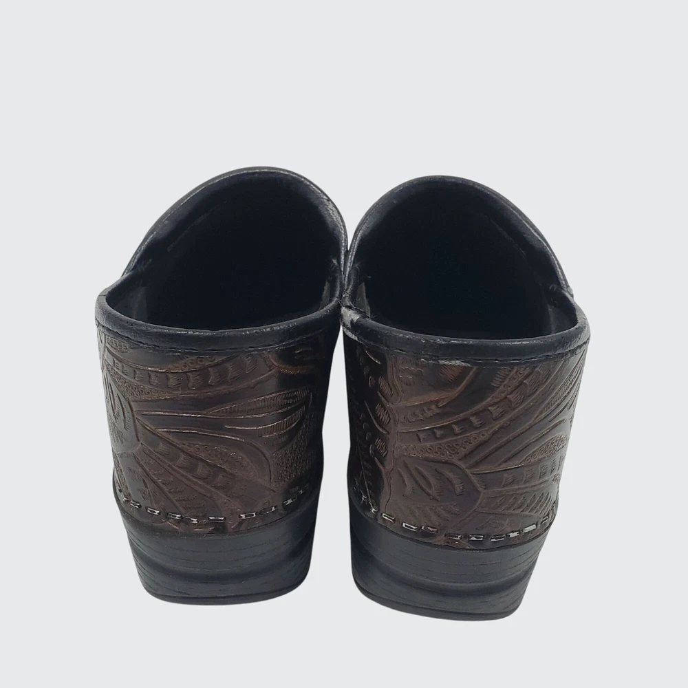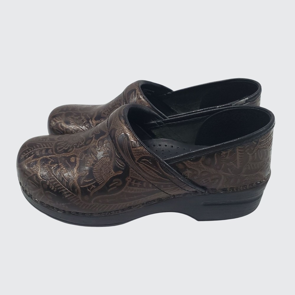 These Dansko clogs offer a blend of comfort and style with embossed leather detailing. Designed for durability and support, they are ideal for professionals needing long-lasting comfort during extended wear. The intricate design adds a unique touch to any professional attire. • Embossed leather detailing • Slip-on design • Supportive footbed • Rubber sole for traction • Professional look Size 41(US 10.5-11) Features: • Clog Size: Womens 41 Condition: Pre-Owned Good Excellent preowned condition from a pet and smoke free home. All shoes are cleaned and sanitized prior to selling. Please refer to pictures for condition. Wear noted on rim material of shoe. All offers considered!