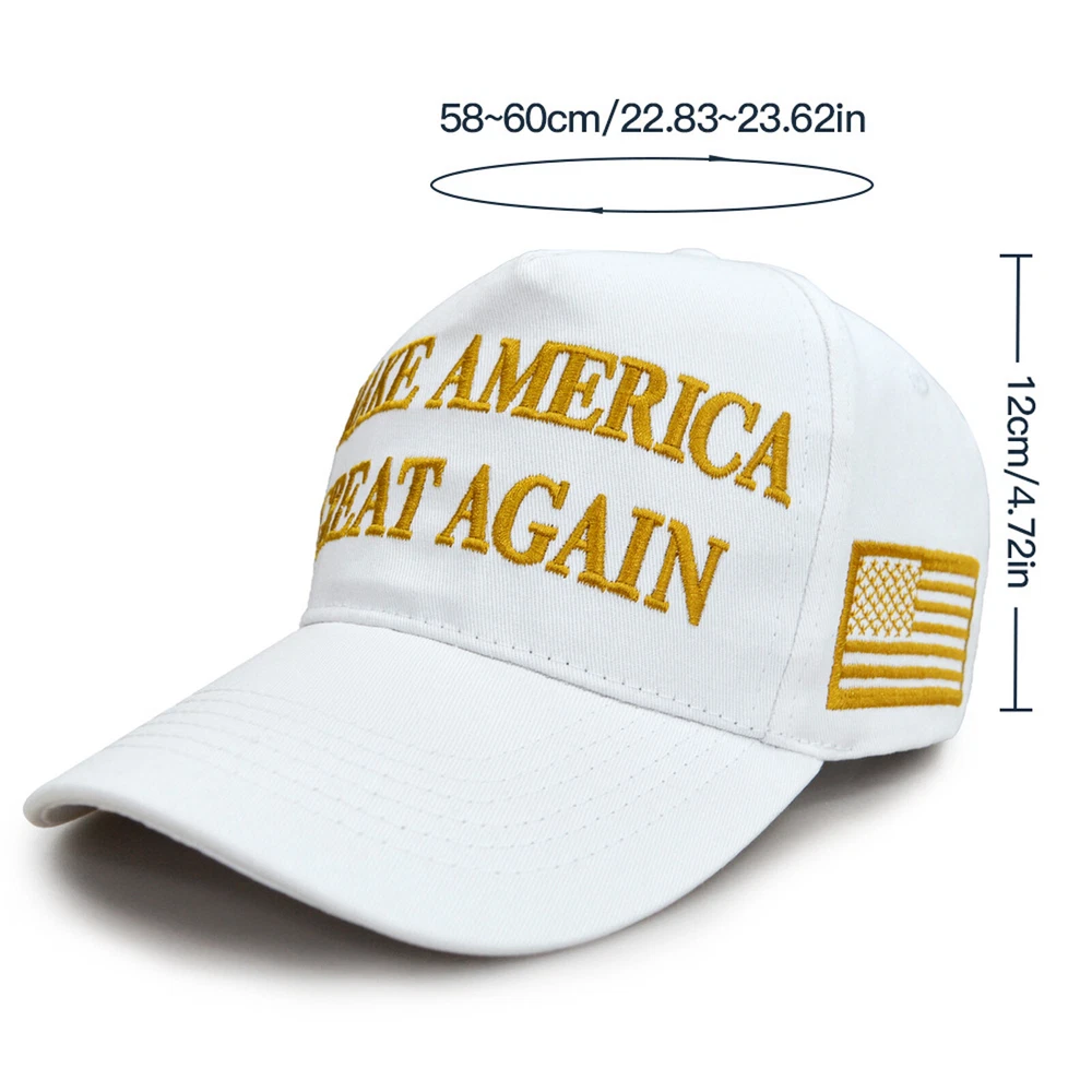 Features 1. The Trump 2024 MAGE hat is made of 65% cotton and 35% polyester, with high-quality embroidery that is easy to clean. Don't worry about fading. 2. Embroidery design, "Make America Great Again", inspirational quotes, and beautiful embroidered American flags on the side will be loveds by people. 3. One size fits all: Adjustable Velcros buckle that can be adjusted to perfectly fit almost any head shape. 4. As you wish, 'make America great again'. Purchase it as a collectible. The MAGA hat and KAG will become a part of American history. 5. Put on our 'Make America Great Again' hat and express your support for America loudly and proudly. Embroidered with the American flag and inspirational slogans makes this adjustable baseball cap the perfect choice for daily wear. Very suitable for Donald Trump fans who want patriotic and inspiring accessories. Specification Material: Cotton Color: Red, Black, Blue, Gold Weight: 75 g Package Include: 1x baseball cap