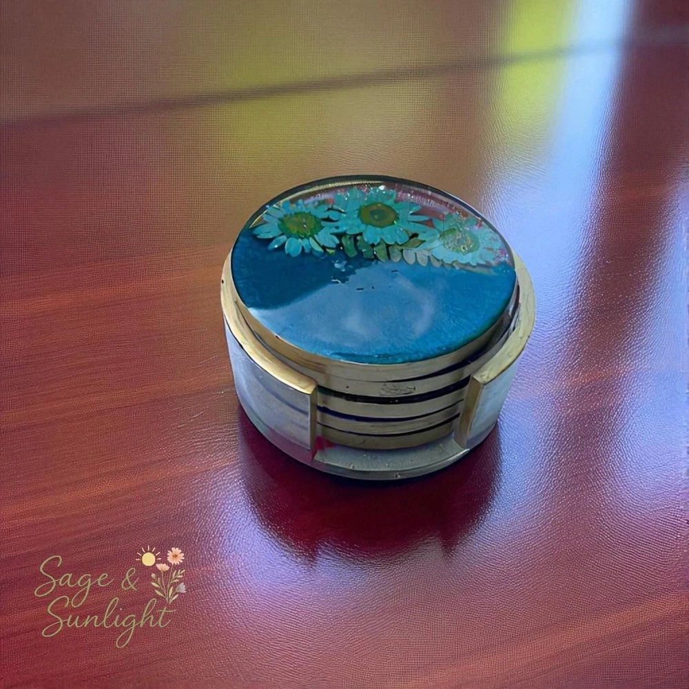 🌼 Colorful Pressed Daisy Resin Coaster Set 🌈 Bring a pop of color and nature’s charm to your home with this unique set of handmade resin coasters. Each coaster features a striking half-and-half design: one side in a vibrant hue (your choice of purple, yellow, blue, pink, or red), the other adorned with real dried pressed daisies and your choice of gold or silver trim. It also comes with a matching coaster holder. Whether you prefer a matching set or a mix of all five colors, these coasters add the perfect blend of modern color and natural elegance to any space. ✨ Highlights: Customizable: Choose a single color or one of each for a vibrant set Real pressed daisy flowers preserved in clear resin Made with premium epoxy resin for durability and shine Includes non-slip bumpers to protect surfaces Handmade with care — each coaster is one of a kind 🎁 Perfect For: Housewarming gifts Nature and flower lovers Spring or summer table décor Unique gifts for friends, moms, or bridesmaids 🌸 Add a little flower power to your coffee table — or gift a set to someone who loves color and creativity!