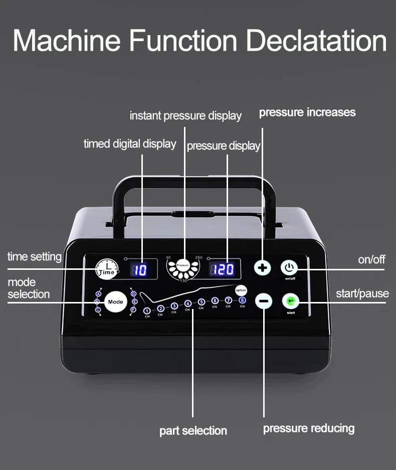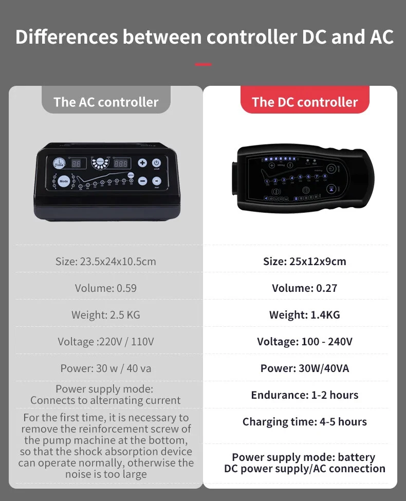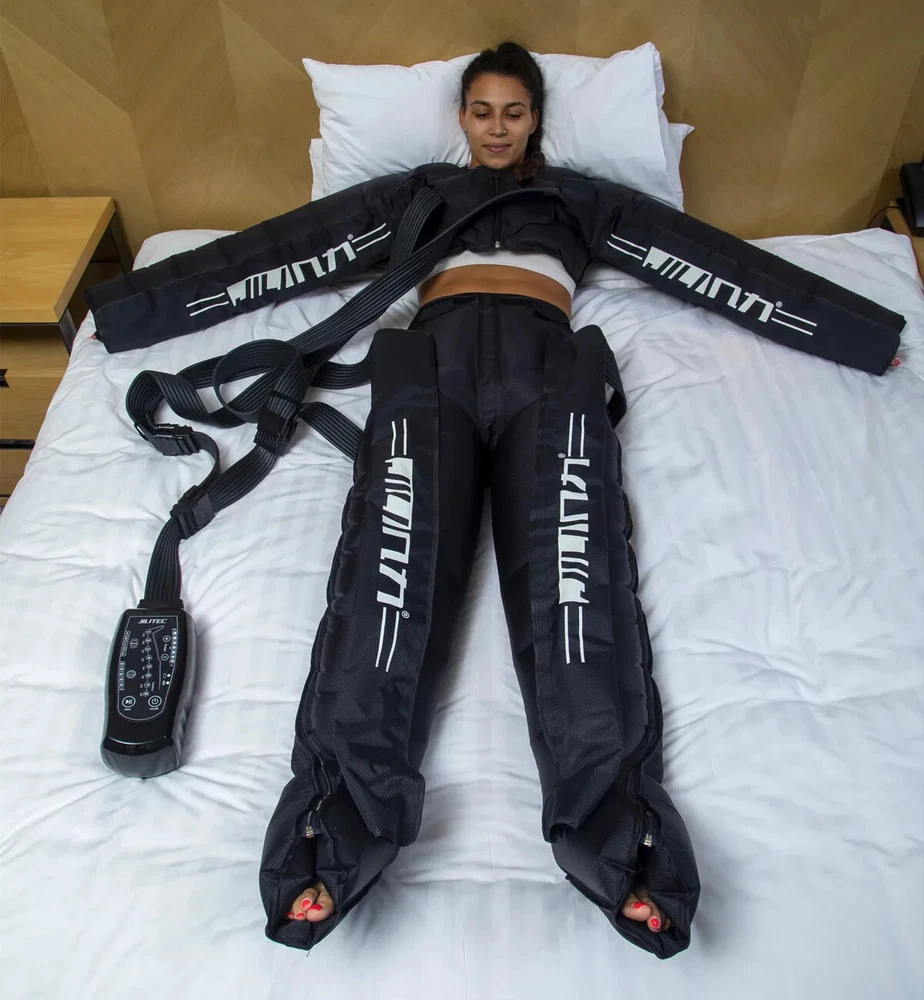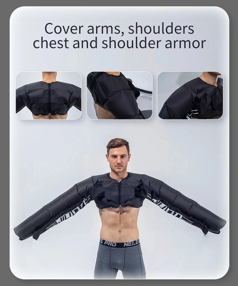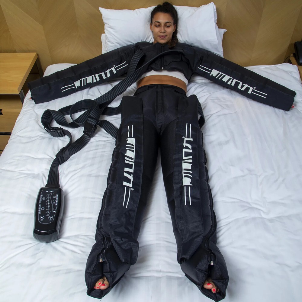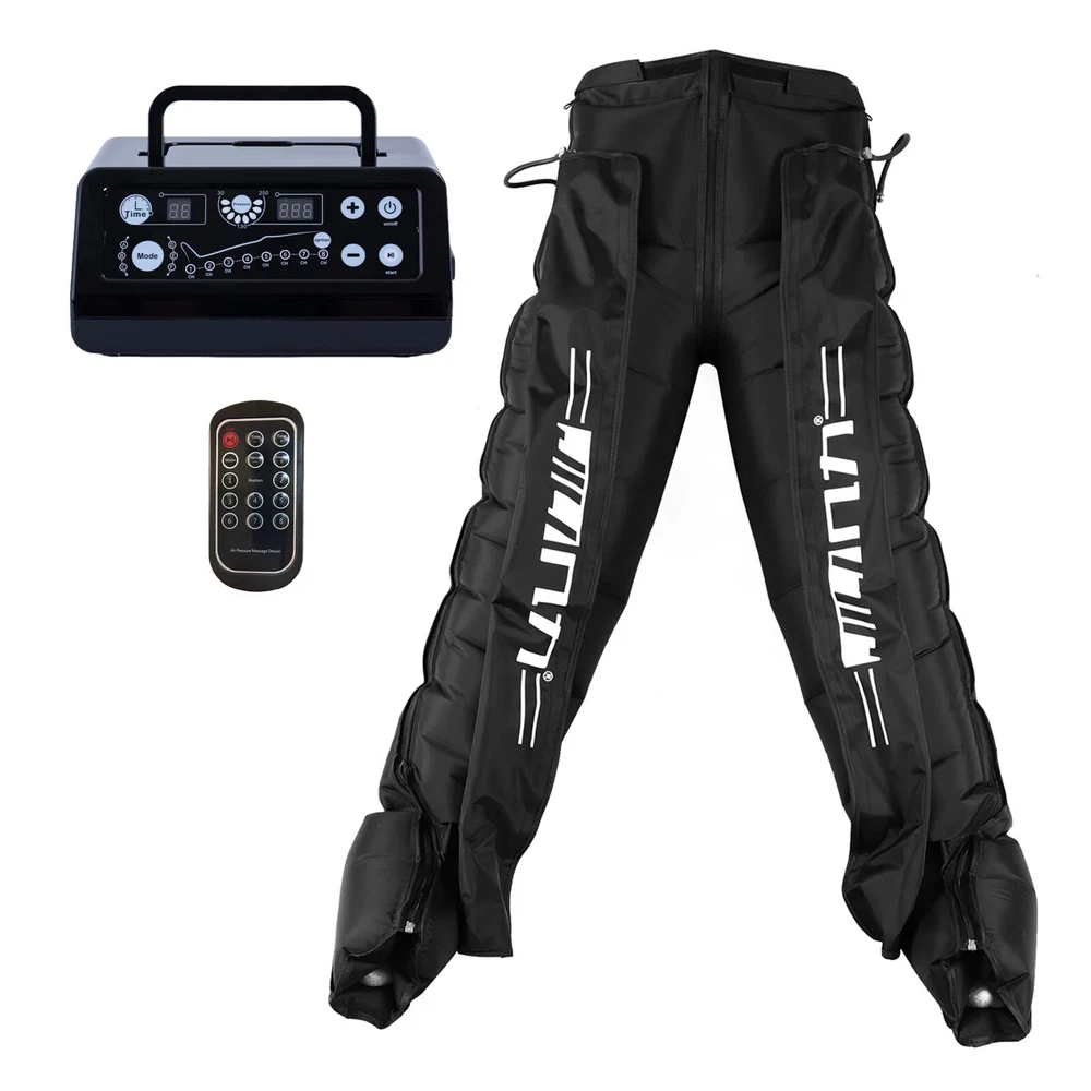 Due to European policy, European countries need to provide their individual value Added Tax (VAT) number to send, please contact customer service Pneumatic compression is a form of pressure massage in which a garment completely covering the limb (legs or arms) inflates and deflates in a cyclical pattern over a period of time. The process flushes fluids containing metabolic waste and ushers in fresh, nutrient-rich blood to the limbs, improving circulation and blood flow. This increased circulation will reduce muscle pain and soreness, decrease swelling, and offer greater pain relief and recovery. BOOST CIRCULATION Speed up cellular repair by providing more oxygen and nutrients to the muscles while removing lactic acid and other by-products caused by exertion. INCREASE LYMPHATIC FUNCTION Dramatically aid the body’s natural process of removing toxins and waste through the lymphatic system. RELIEVE MUSCLE TENSION Increase flexibility, improve muscle response and decrease the likelihood of injury by targeting tight, tense muscles and fascia. With more sizes, more features, more control, and more power than the competition.There are eight air chambers from the foot to the thigh, and each section can be opened and closed independently. Compared with 4-5 air chambers, it can promote blood flow more thoroughly About the AC controller, Weight:2.5KG, Size:23.5*24*10.5cm voltage: 100-110V/220-240V, power: 30w/40va, remote control distance: 5m Five kinds of loop programs A.take turns B.Increment C.Take turns in pairs D.all E.A+B rotation Pressure range 30-250mmhg,There are 7 levels of addition and subtraction Size S , suitable for height <155cmSize XL , suitable for height 155-173cm Size XXL, suitable for height 174-185cm Size XXXL, suitable for height >185cm Size trousers XL,suitable for height 160-185cm Size trousers XXL,suitable for height 185-205cm Voltage 100-240V, all over the world, plug has European plug and artist plug, we will choose the appropriate plug for you in the destination country The arms and trousers of the whole body can be inflated at the same time. Since there may be some overlap between the waist and trousers, it is recommended to use the waist alone. The product is equipped with three adapters to ensure that the arms and trousers are connected to the machine at the same time