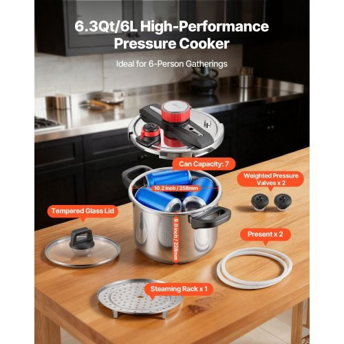 VEVOR Pressure Cooker, 6.3Qt Pressure Cooker Stainless Steel,Pressures Canner with Steaming Rack, Tempered Glass Lid, ThreePressures Settings for Meat, Beans, Rice, Soup, Sauces, Cook up to100 kPa Full Meals, Less Effort Premium Cooking Choice Triple-Layer Heating Quality Build and Comfort Everyday Cooking Upgrade Multiple Sizes Available Capacity: 6Qt/6L ,Item Model Number: 22cm/6L,Pot Depth: 6.4inch/163mm,Can Capacity: 7,Product Dimensions: 14.4 x 9.4 x 9.6/9.3inch (365 x 240 x 245/235mm),Net Weight: 8.2 lbs/3.72 kg,PotDiameter: 8.7 inch/220mm