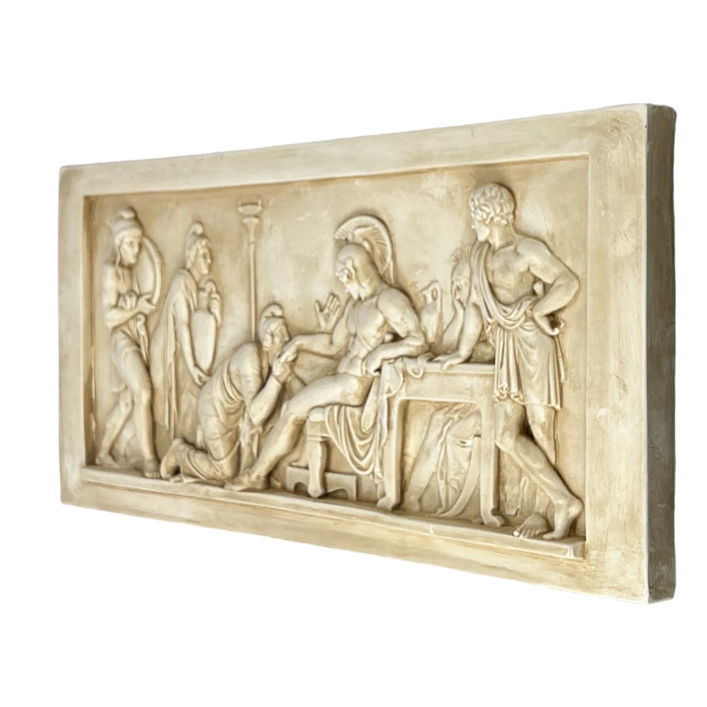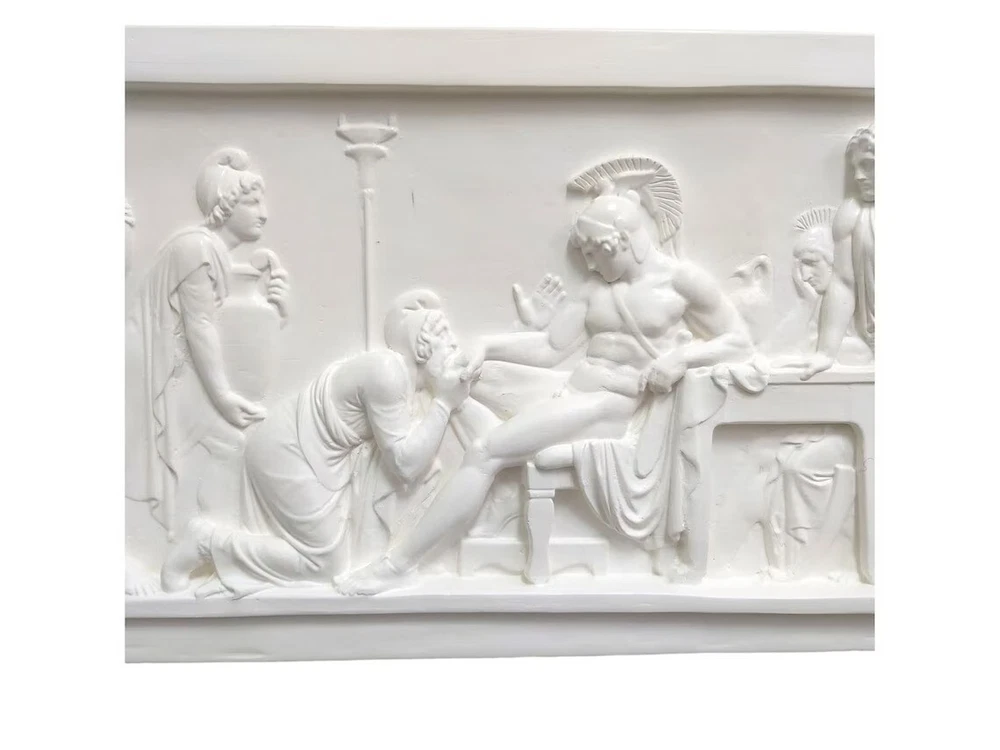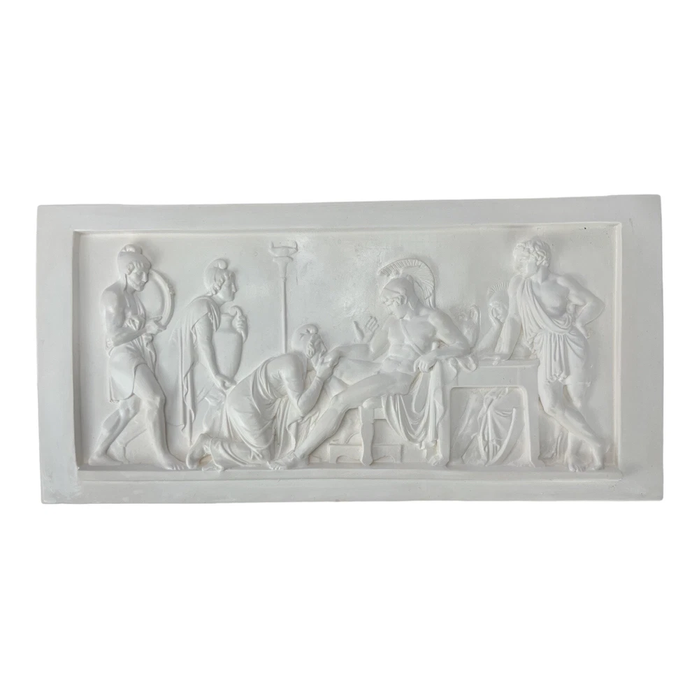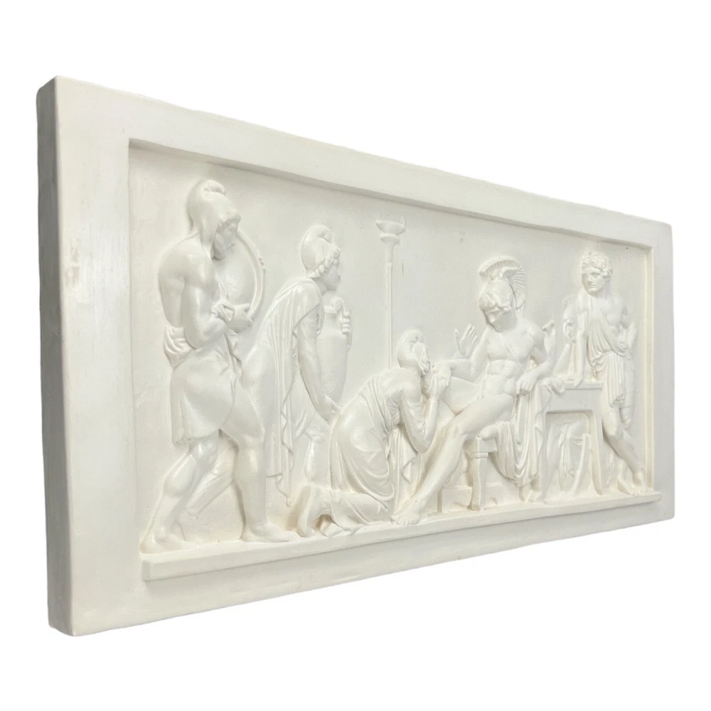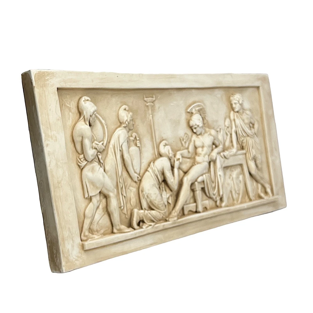 Priam Pleads with Achilles for Hector's Body Iliad Homer Relief Greek Sculpture Wall Decor Plaque Museum Copy During the siege of Troy Achilles’ friend Patroclus was killed by Hector, the Trojan king Priam’s son. As revenge Achilles therefore killed Hector. The relief depicts how the old king Priam begs Achilles on his knees to turn over the body of his son. The relief is unique with its rhythm of the three figures on the left that like in a filmic sequence ends in the kneeling figure of Priam, and also the distance – physically and mentally – which exists between the elevated Greek hero and the old king. The themes of the relief are on a general level humility and mercifulness. Achilles in the end gives in to the plea of the father and hands over the body of the son. HANDMADE IN GREECE - HAND PAINTED Dimensions (approximately) : Height : 25 cm (9.84 inches) Width : 50 cm (19.7 inches) Depth : 3 cm (1.18 inches) Weight : 3,14 Kg (6.92 lb) Material : Cast Stone - Hard Plaster The plaster we use is a 100% natural non-toxic Greek product and a material without any chemical additives. **The relief comes into 2 different versions. White and Patina (Aged) colour. Please write to us inbox which colour you prefer. Otherwise, the selection will be random. Thank you!** Professional packing - We take extra care in safely packing our fragile items to ensure safe delivery. HANDLING TIME We ship our orders within 1-2 business days after receiving your verified payment (Excluding Weekends and Public Holidays). ESTIMATED DELIVERY TIME In-stock items - We ship the product directly from our warehouse. The estimated delivery time given by the carrier is within 3 to 8 business days after the postal date. Express Delivery (1-3 business days) - For an additional charge available only for EUROPE buyers. RETURN POLICIES Our return policy is 14 days return or exchange. All returns must include all original items, original packaging, undamaged, unused and in re-saleable condition. Customers are responsible for return shipping costs. Shipping and handling fees are absolutely non-refundable. If 14 days have gone by since the delivery of your purchase, unfortunately we can’t offer you a refund or exchange. To be eligible for a return, your item must be unused and in the same condition that you received it. It must also be in the original packaging (outer and inner protections). In cases we are unable to identify you as the buyer, in order to complete your return, we require a receipt or proof of purchase. Please do not send your purchase back before we have reviewed your return case. In many cases, courier companies only require pictures of the damaged package and item in order to close a damage claim in our favor. There are certain situations where only partial refunds are granted (if applicable): CUSTOM DUTIES International Buyers – Please Note: a. Import duties, taxes and charges are not included in the item price. These charges are the buyer’s responsibility. b. Please check with your country’s customs office to determine what these additional costs will be prior to buying. c. There are not import taxes for transactions between E.U. countries. PROFESSIONAL PACKING We take extra care in safely packing our fragile items to ensure safe delivery. We ship decades of packages daily. We can ensure you that you will receive your order intact as so many other buyers of ours internationally. If nevertheless the item will be damaged in transit a replacement will be provided . RETURN SHIPPING You will be responsible for paying for your own shipping costs when returning your item. Shipping costs are non-refundable. Items sent as "Free Shipping" will also require you to pay for return shipping. If you receive a refund and the return was paid by us, the cost of return shipping will be deducted from your refund. In the cases of being our company at fault, please contact us as soon as possible in order to start the claim process with the shipping insurance. CANCELLATIONS (IF APPLICABLE) Please contact us as soon as possible if you would like to cancel your order. In the majority of cases cancellations are free of charge and eligible for a full refund. Cancellation is not possible if: -Item was shipped including pre-transit period in which shipping company is given the order to pick up and custody. -Item is customized (including any bespoke customization such as material, color, size or form). WRONG ADDRESS & UNDELIVERABLE PACKAGES - All items will be shipped to buyer's registered shipping address. Please double-check your shipping address before you place your order. - If your item was shipped to the wrong address, it would be returned to us and return shipping costs will be charged. Shipping costs are paid by receiver, except for items sent as "Free Shipping" for which receiver only pays for return cost. We can ship the item out again for you upon receiving the item back in the mail but we will need to charge the Standard shipping rates to post the order again -Unclaimed packages will not be refunded. FEEDBACK 1. If you are dissatisfied for any reason, please do not be quick to leave negative/neutral feedback. We work hard to make sure EVERY CUSTOMER 100% SATISFIED and resolve any problem for you. 2. If you are satisfied with the product you received, please leave us positive feedback and 5 stars of DSR. CONTACT US We are always ready to help. Send us your inquiry once and we will reply within 24 hours.