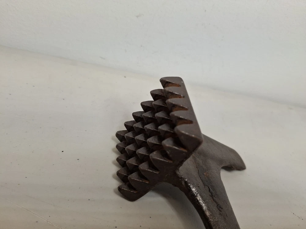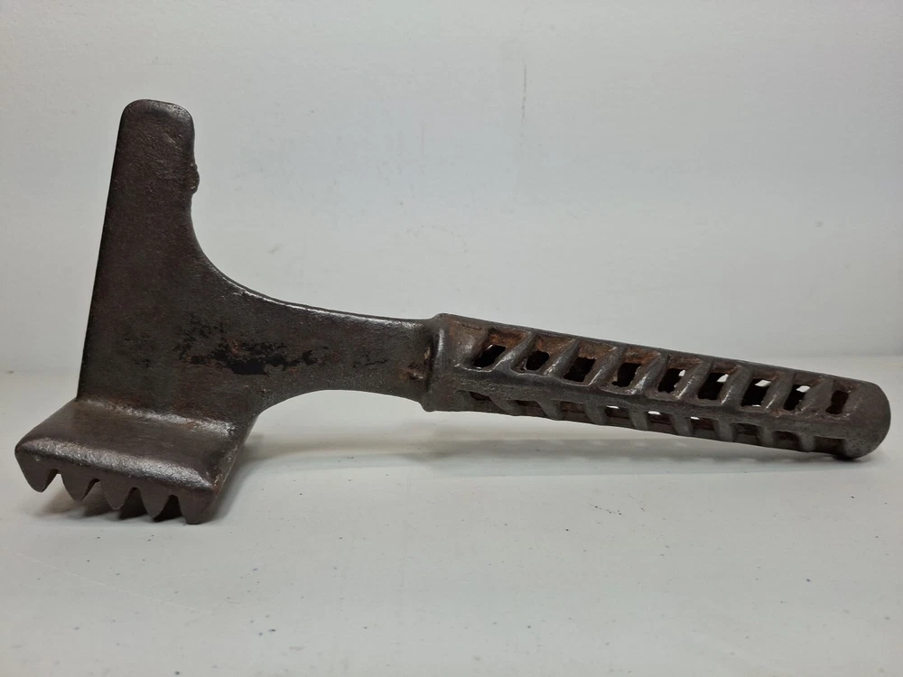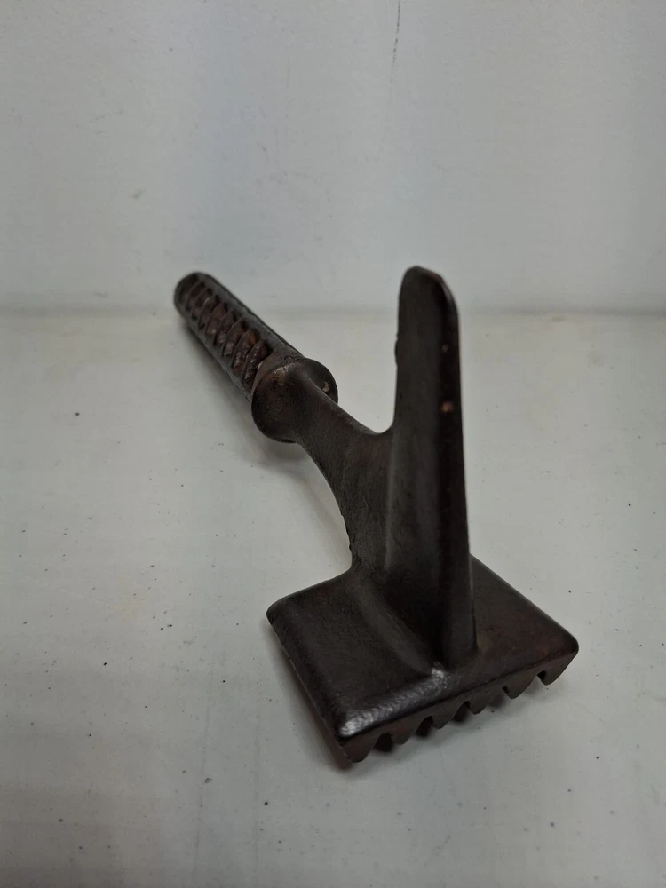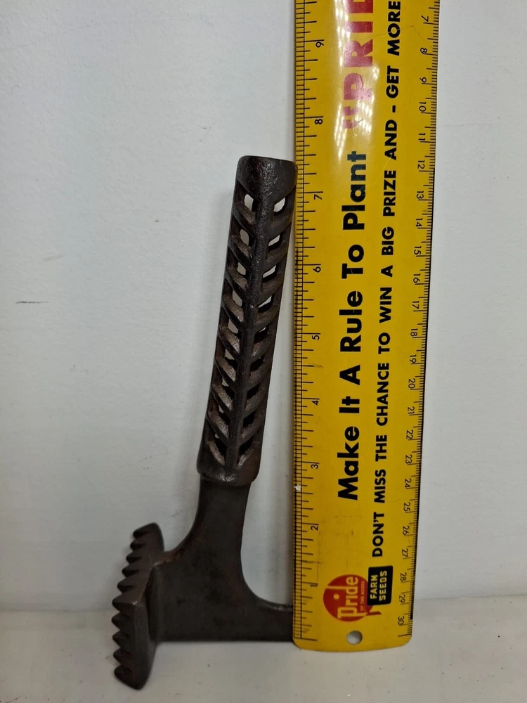 This primitive solid metal meat tenderizer tool is a must-have for any kitchen enthusiast. Its unique design and style make it a great addition to any collection of kitchen equipment. The tool is made of high-quality metal and has a sturdy construction that ensures it will last for years to come. While the date of creation and region of origin are unknown, this original piece is sure to impress any collector of antiques and primitives. Whether you're using it to tenderize meat or simply displaying it in your kitchen, this tool is sure to be a conversation starter. Add it to your collection today!