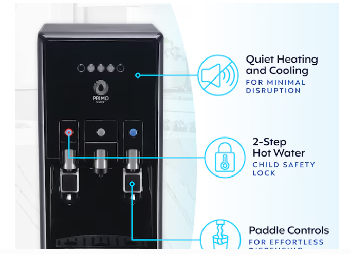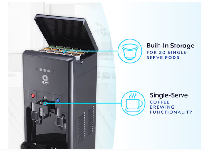 Primo Bottom Load hTrio Single-Serve Coffee Maker Black Water cooler 601258-C Get the best of both worlds with a sleek 5 gallon water dispenser that offers premium hydration and fresh-brewed coffee at the push of a button. The bottom-loading water dispenser design means no heavy lifting, flipping, or spilling. Just load your Primo Water bottle and start pouring or brewing. With single-serve coffee functionality for 6-, 8-, or 10-oz. drinks and a reusable pod included, you can customize each cup. Built-in storage also keeps up to 20 pods neatly organized for your convenience. Start your hydration journey with no plumbing, tools, or extra effort required. Plus, enjoy free water coupons with your water cooler purchase. Dispenses 2 temperatures: cold and hot water Single-serve brewing: Select 6, 8, or 10-ounce serving size Reusable coffee pod included, along with built-in storage for 20 single-serve pods Bottom loading design, no lifting, flipping or spilling. Quick and easy set-up, no plumbing or tools required. Easy-to-use paddle controls for effortless dispensing FREE water coupons included with dispenser purchase Quiet heating and cooling for minimal disruption All water contact parts are BPA-Free