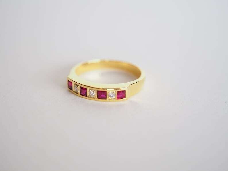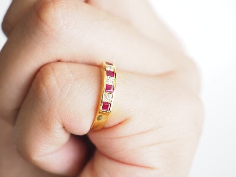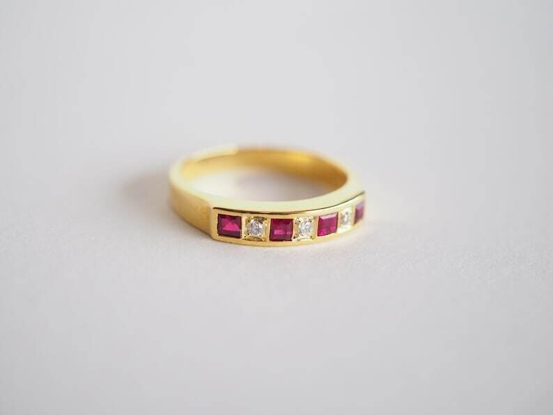 Ring Size: All Size Available Secondary Stone: Simulated Diamond Vintage: No Metal Purity: 925 Occasion: Anniversary, Birthday, Christmas, Engagement, Father's Day, Graduation, Mother's Day, Valentine's Day, Wedding Sizable: Yes Brand: sp_jewels Personalize: Yes Color: Yellow Main Stone: Simulated Ruby Material: Gemstone, Stone, metal Type: Ring Country of Origin: India Main Stone Color: Pink Seller Warranty: No Features: Engraved Setting Style: Prong gtin13: Does Not Apply Main Stone Creation: Simulated Seller Notes: ““Freshly made on order with quality and buyer satisfaction. No old stocks.”” Antique: No Cut Grade: Excellent UPC: Does Not Apply Number of Gemstones: Multi Wholesale: Yes Theme: Beauty Handmade: Yes Materials sourced from: Unknown Base Metal: Yellow Gold Plated Shape: Round Metal: Sterling Silver Main Stone Shape: Princess Style: Band, Eternity