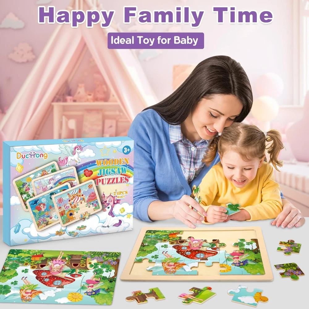 Engaging Themes for Girls: This wooden puzzle set features 4 exciting themes unicorns, princesses, mermaids, and fairies. Each contains 24 durable wooden pieces, let them try to complete the 24-piece puzzles, assembled to show 4 different appealing themes. Safe and Durable Construction: Crafted from high-quality wood, precisely cut for the perfect interlock without swollen edges, not too tightly or too loosely. Each piece is carefully polished so that the child can grasp it safely. These puzzles are durable enough to be used repeatedly by children. Easy to Complete: With a finished size of 11.8 x 8.8 inches. Each puzzle comes with a removable paper illustration for fun reference, and a wooden frame keeps pieces in place while assembling. Let little ones easily match up puzzles by themself without help. Educational Fun: These puzzles for toddlers encourage creativity, enhance hand-eye coordination, and foster problem-solving and spatial reasoning skills, keeping children engaged and providing parents with more free time. Perfect Gift Choice: Ideal for Birthdays, Christmas, Easter, and more, this wooden puzzle set is an excellent gift for girls aged 3-8. You can enjoy your family time with our travel puzzles toy and bring positive emotions to everyone. Product Description