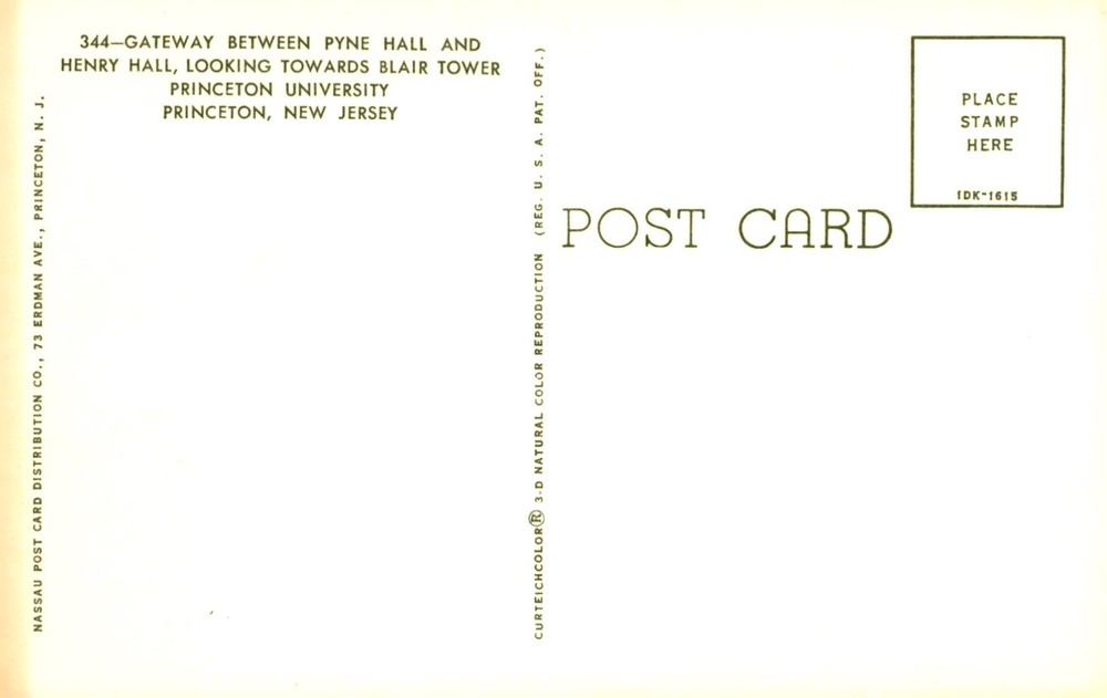 View of Henry Hall looking towards Blair Tower, with the gateway between Pyne Hall and Princeton University. This postcard captures the scenic beauty of the campus.