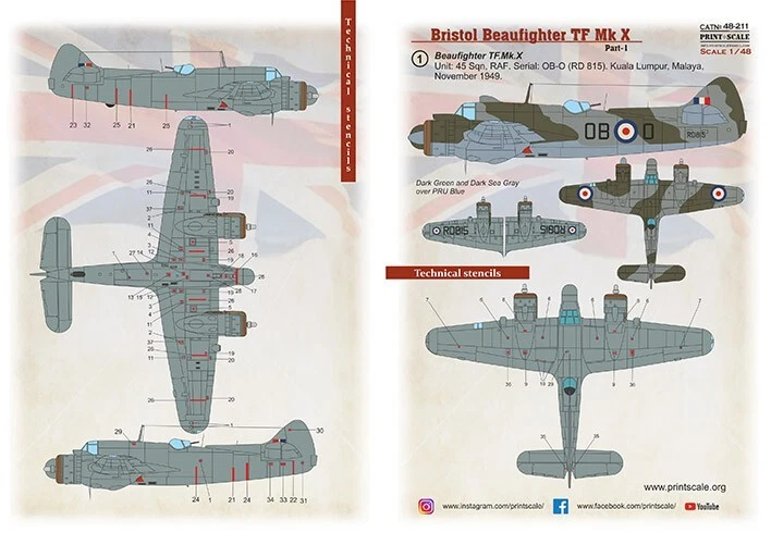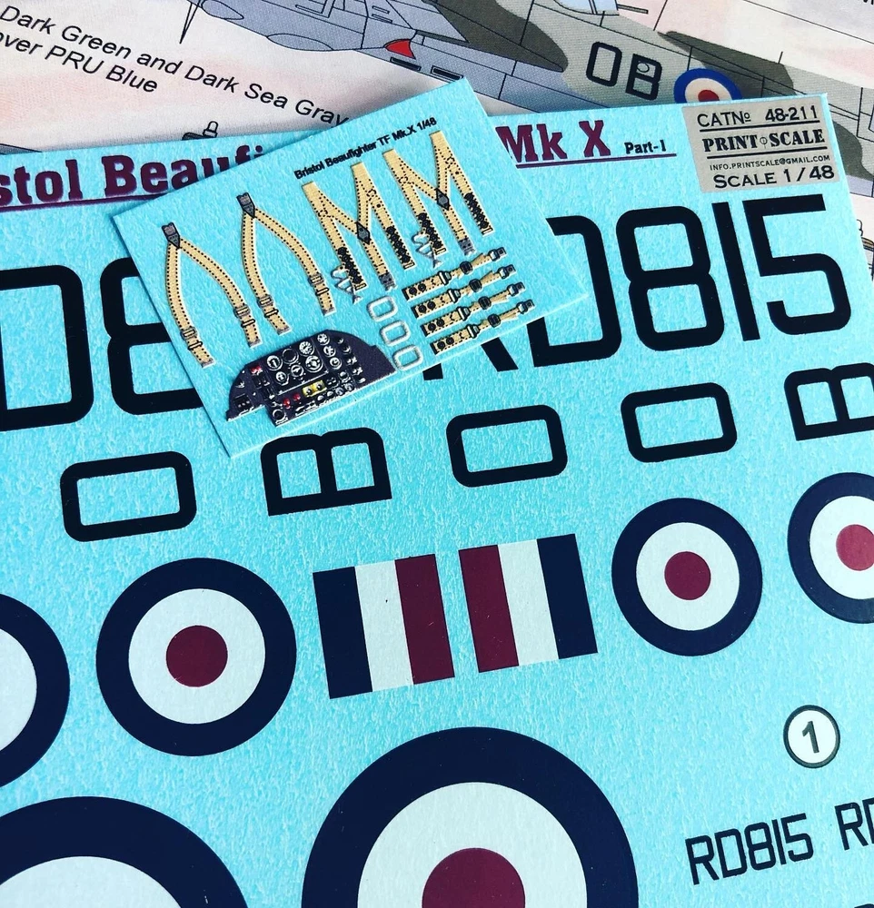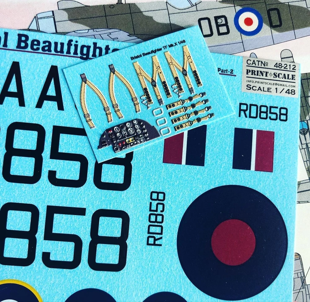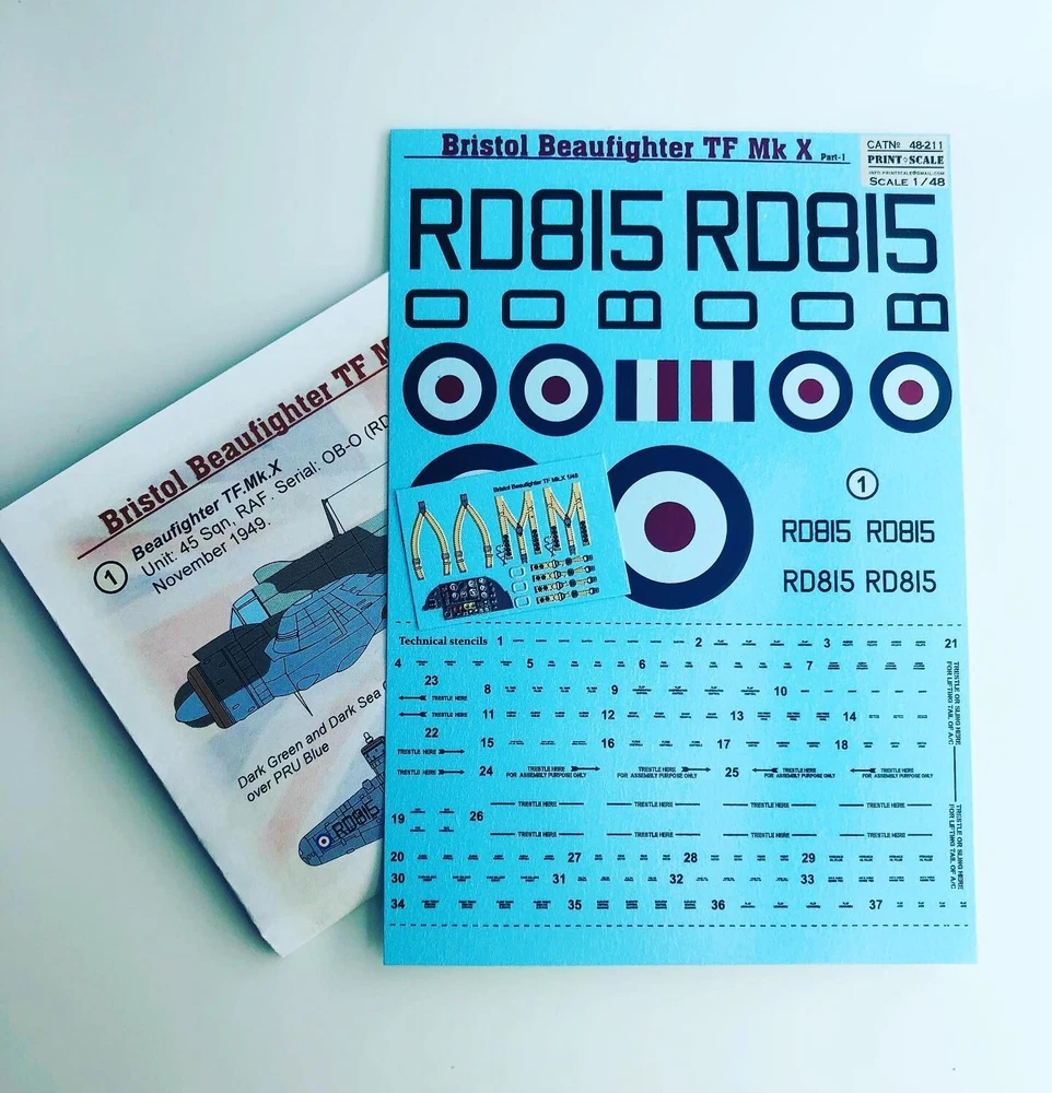 Scale: 1:48 Manufacturer: Print Scale Decals (Ukraine) Country/Region of Manufacture: Ukraine Material: Decal Condition: New in Box Features: Kit (with 3D decal Instrument panel) 1. Beaufighter TF.Mk.X. Unit: 45 Sqn, RAF. Serial: OB-O (RD 815). Kuala Lumpur, Malaya, November 1949.