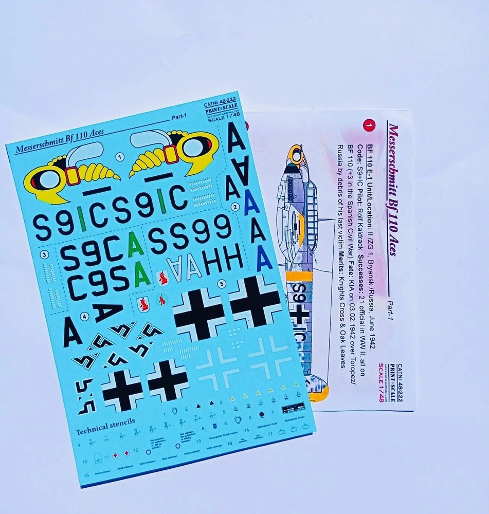 Scale: 1:48 Manufacturer: Print Scale Decals (Ukraine) Country/Region of Manufacture: Ukraine Material: Decal Sheet Condition: New in Box Features: Kit 1. BF 110 E-1. Unit/Location: II./ZG 1, Bryansk /Russia, June 1942. Code: S9+IC Pilot: Rolf Kaldrack. Successes: 21 official in WW II, all on BF 110 (+3 in the Spanish Civil War).Fate: KIA on 03.02.1942 over Toropez/Russia by debris of his last victim.Merits: Knights Cross & Oak Leaves. 2. BF 110 F-2. Unit/Location: ZG 1, Byelgorod/Russia, June 1942. Code: S9+AA Pilot: CO Ulrich Diesing. Successes: 15 official in WW II, all on BF 110. Fate: Killed in a car accident on 17.04.1945 near Boitzendorf/Germany. Merits: Knights Cross. 3. BF 110 F-2. Unit/Location: II./ZG 1, Byelgorod/Russia, June 1942. Code: S9+IC Pilot: CO Günther Tonne. Successes: minimum 15 official in WW II, all on BF 110. Fate: KiFa at Reggio Calabria/Italy on 15.07.43. Merits: Knights Cross & Oak Leaves. 4. BF 110 G-2/Trop. Unit/Location: II./ZG 1, Trapani/Italy, May 1943. Code: S9+AC Pilot: CO Heinz Nacke. Successes: 14 official in WW II, all on BF 110. Fate: Survived. Merits: Knights Cross. 5. BF 110 E-2. Unit/Location: 1./SKG 210, Sechinskaya/Russia, August 1941. Code: S9+AH Pilot: Wolfgang "Bombo" Schenck. Successes: 18 official in WW II, all on BF 110. Fate: Survived. Merits: Knights Cross & Oak Leaves.