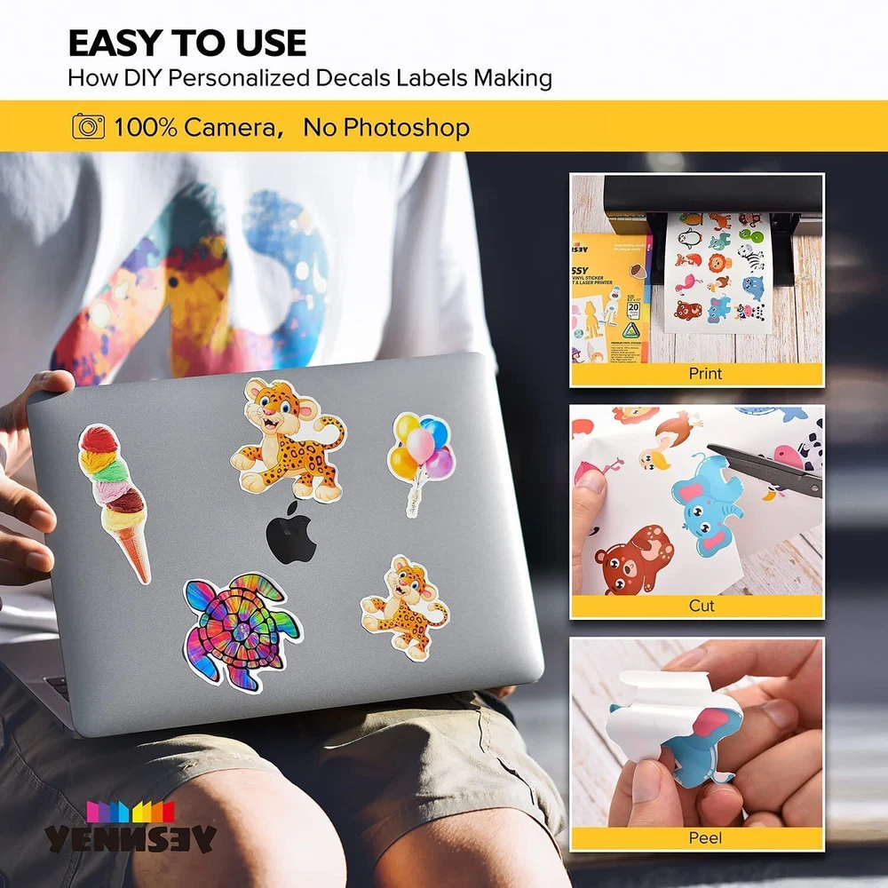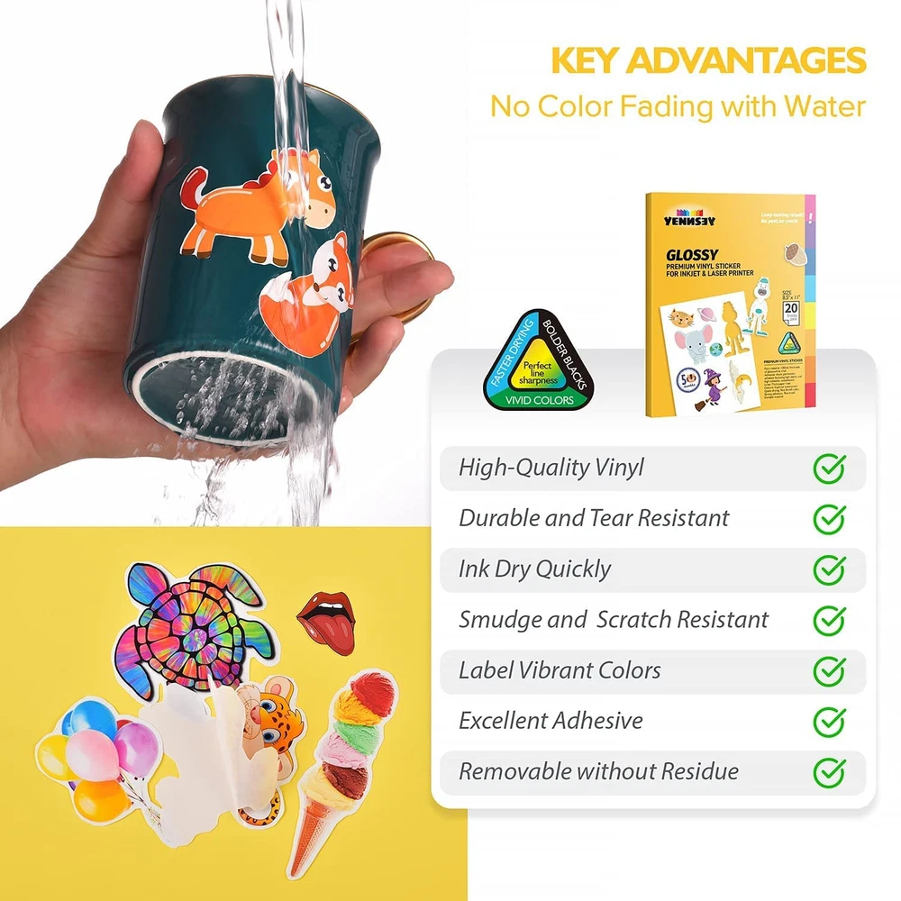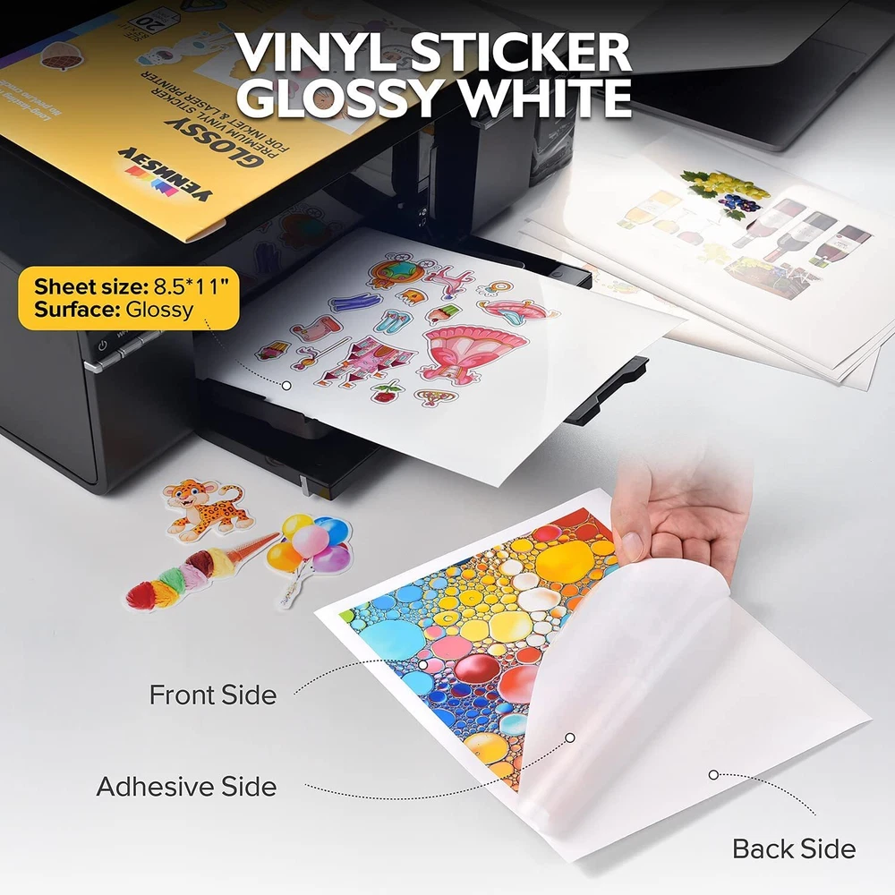 ✨· 【WATER-RESISTANT】: With The printable vinyl sticker paper Sheets You Can Create Gorgeous Water-Resistant Labels for Multi-Purpose Use both Indoors & Outdoors; Simply Add a Clear Layer of UV Resistant Sealer Spray to Boost Waterproofness & Durability if Use for Long Time. ✂️ · 【INK DRY QUICKLY】Our Inkjet glossy sticker paper Absorbs Ink Beautifully And No Smudges.Ink Seeps Deeply Into Inkjet Vinyl sticker paper Within Two Minutes.It Will Be Better to Print it with Original Ink.For Long-Lasting Protection,Seal with a Clear Acrylic Spray.Or You’d have To Add some UV Protection. 💡 · 【HIGHLY DURABLE】 Our sticker paper for printer Absorbs Ink Beautifully,This Printable Sticker Paper For Cricut Endures Minor Scratches And Is Nearly Impossible To Tear. 🖨️ · 【EASY RELEASE & NO RESIDUE】This Glossy Printable vinyl sticker paper for inkjet printer Can be Removed Without Any Sticky Residue, Keeping The Surface Clean. Moreover, The Backing Sheet is High Quality With Special Adhesive,Which Allows That You Can Re-apply the Printable Vinyl Sticker Paper with The Placement. 🎃 · 【COMPATIBLE WITH INKJET & LASER PRINTERS】These Printable Vinyl Sticker Paper Are Compatible With All Laser And Inkjet Printers, Such As Epson, Hp, Brother, Canon And Many More, Using Normal Waterbased Dye/Pigment Ink(Pigment Ink For Longer Life).What’s More,The Printable Sticker Paper Can Also Work With All Craft Cutters. 📚 · 【PRODUCT SPECIFICATIONS】: Pack Contains 20 Blank Printable Glossy White Sticker Paper Sheets, 8.5”X 11" Which Works Well With Most Inkjet Printers, Won't Jam, Prints Smoothly,Full Sheet Printable Adhesive Paper Gives You The Freedom to Design Decals In Different Sizes and Shapes. Perfect for Customizing Stickers for Car Bumpers, Tumblers, Bottles, Notebooks, Laptops (They Also Weather Resistant Label and May Be Exposed To The Elements, But Saturation Or Submersion Is Not Recommended.) 🎨 · 【WIDE APPLICATION】Glossy Vinyl Stickers for Laptops, On Coffee Mugs, Bottles,Home Decor, Scrap-Booking, Lettering, Graphics, Stickers, Decals, Glass, Mirrors, Tiles, Windows, Banners, Signs, Stripping, Wraps. .And The Sticker Labels Look Superb As Unique Wall Murals, Vinyl Decals for Cars, Bumper Stickers, If Your Printable Vinyl Sticker Paper Does Not Perform to Your Expectations, Please kindly to Contact us, We Will Try Our Best to Solve for You.