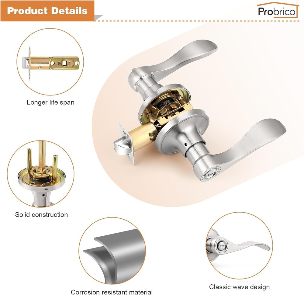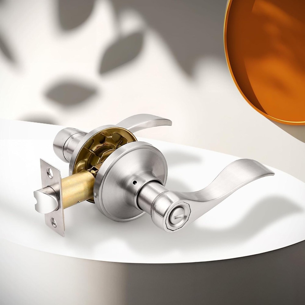 Privacy Door Levers Wave Style Handles Keyless Lock Bed Bath Door Lockset, Satin Nickel 6 Pack 6 Pack per package(for 6 doors) : privacy door levers with modern nickel finish for bathroom or bedroom door. Confirm with ANSI Grade 3, Exceeds 200,000 cycles. Privacy Function(without keys) : The latch bolt can be locked by thumb turn button on the inside lever. An emergency release tool can unlock the door from the outside Steel Adjustable Latch : It has adjustable universal latch - 2-3/8" or 2-3/4", Fits doors 1-1/4 inch to 1-3/4 inch Easy Installation : Easy to install with all accessories included. The easy installation makes for a one-person project. It fits both right and left handled doors. Dimensions : Lever Length: "(120mm) , Rosette Diameter: "(65mm). Note : The square plate of the latch is unremovable