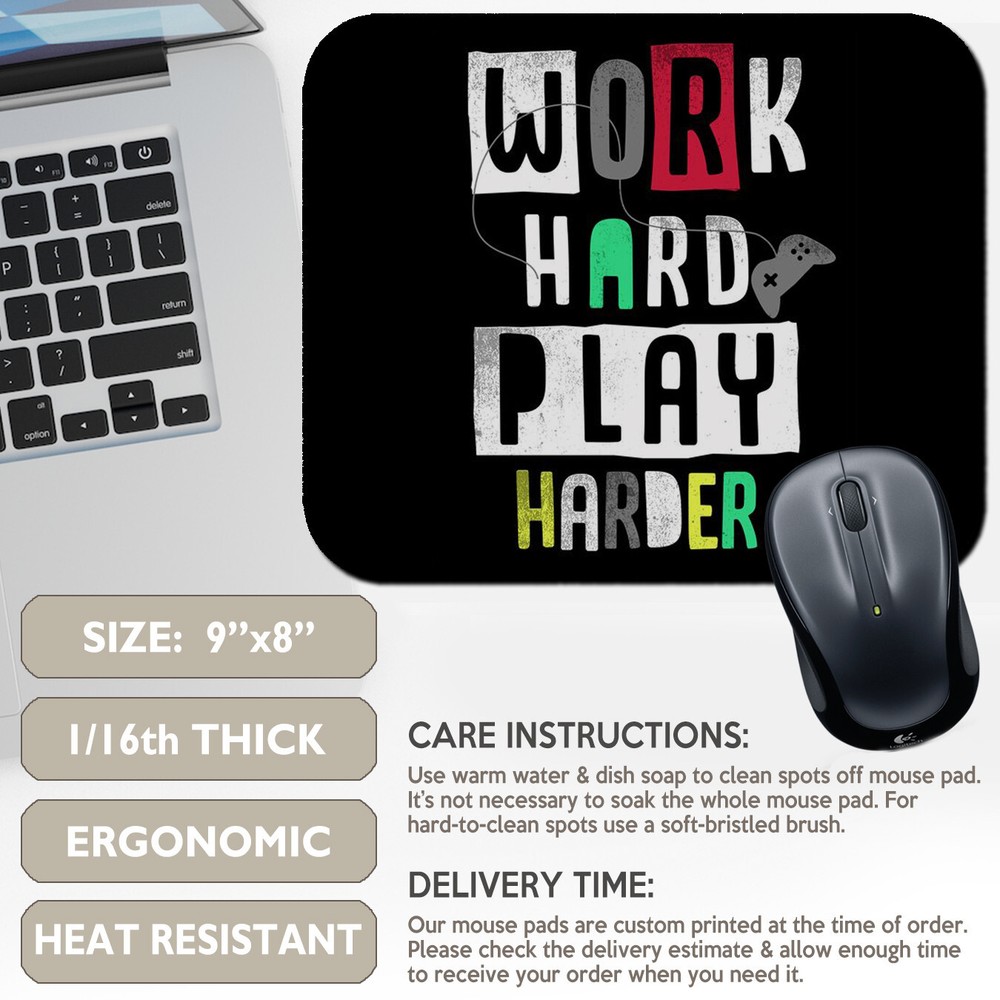 Level up your workspace with this awesome "Work Hard, Play Harder" mouse pad! Featuring a bold video game controller design, this desk mat is perfect for gamers who give their all — both at work and in the game. With vibrant colors and a sleek, durable surface, it offers smooth mouse movement and adds personality to any gaming setup or office. Whether you're grinding through work or gaming through the night, this mouse pad keeps your style on point. A perfect gift for gamers and anyone who lives by the work hard, play harder motto! Keywords : gamer mouse pad, work hard play harder, gaming desk mat, video game decor, controller design, gift for gamers, gaming office accessories, cool desk setup, gaming lifestyle, video game gifts, gaming room decor, stylish mousepad, gamer gear Measuring 9.25"x7.75", these cloth top / neoprene backed mousepads are ergonomically correct at 1/16" thick for wrist comfort. Perfect for any type of mouse. Created to enhance anyone’s online browsing and gaming experience, this mousepad has both style and comfort. Thanks to the rubber base, your mouse pad has a firm grip on the desk, while your design goes on the stain-resistant cloth top side. You’ll find this mouse pad delivers smooth mouse sliding action for both working and playing. Description: Size: 9.25"x7.75" 1/16" thick Ergonomically correct Durable heat resistant fabric top Non-slip neoprene rubber backing Will not fade or peel Machine-washable Handmade to order in the USA ********************* WHEN WILL I GET MY ORDER? • Please check the delivery estimate on each item listing. • Everything in my store is made to order. This means that the item is custom made just for you very shortly after you place your order. • I do not sell any in-stock, “ready to ship” products. • I cannot rush an order or promise delivery by a specific date. Please check delivery estimate & allow enough time to get your order when needed. COLORS / SIZING / CUSTOMIZATION: • Actual colors may vary slightly. Every computer monitor displays colors slightly differently. I make every effort to display colors as accurately as possible. • A size chart is included on each listing, if applicable. If you are between sizes, follow the guidance on the size chart. Sizes & styles are standardized. I cannot customize the sizing, style, cut, length, etc. SHIPPING / CUSTOMS CHARGES / IMPORT TAXES • Carefully check your shipping address. If your shipping address is incorrect, you are responsible for the cost of reshipment (when/if the item is returned to the seller by the postal service.) • Buyer is responsible for Customs Charges and Import Taxes required by your country. CANCELLATIONS / RETURNS / EXCHANGES / DAMAGED ITEMS • ALL SALES ARE FINAL . I am not able to accept cancellations, returns or exchanges. Because your item is made to order, I have assumed all the production costs. As an artisan, it is not feasible for my small business to accept returns like the “Big Box” stores that do millions in sales to offset their losses. • If you receive a damaged or defective item or the wrong item, please contact me right away. I will work with you to make it right. THANK YOU FOR YOUR PURCHASE! I APPRECIATE YOU!!