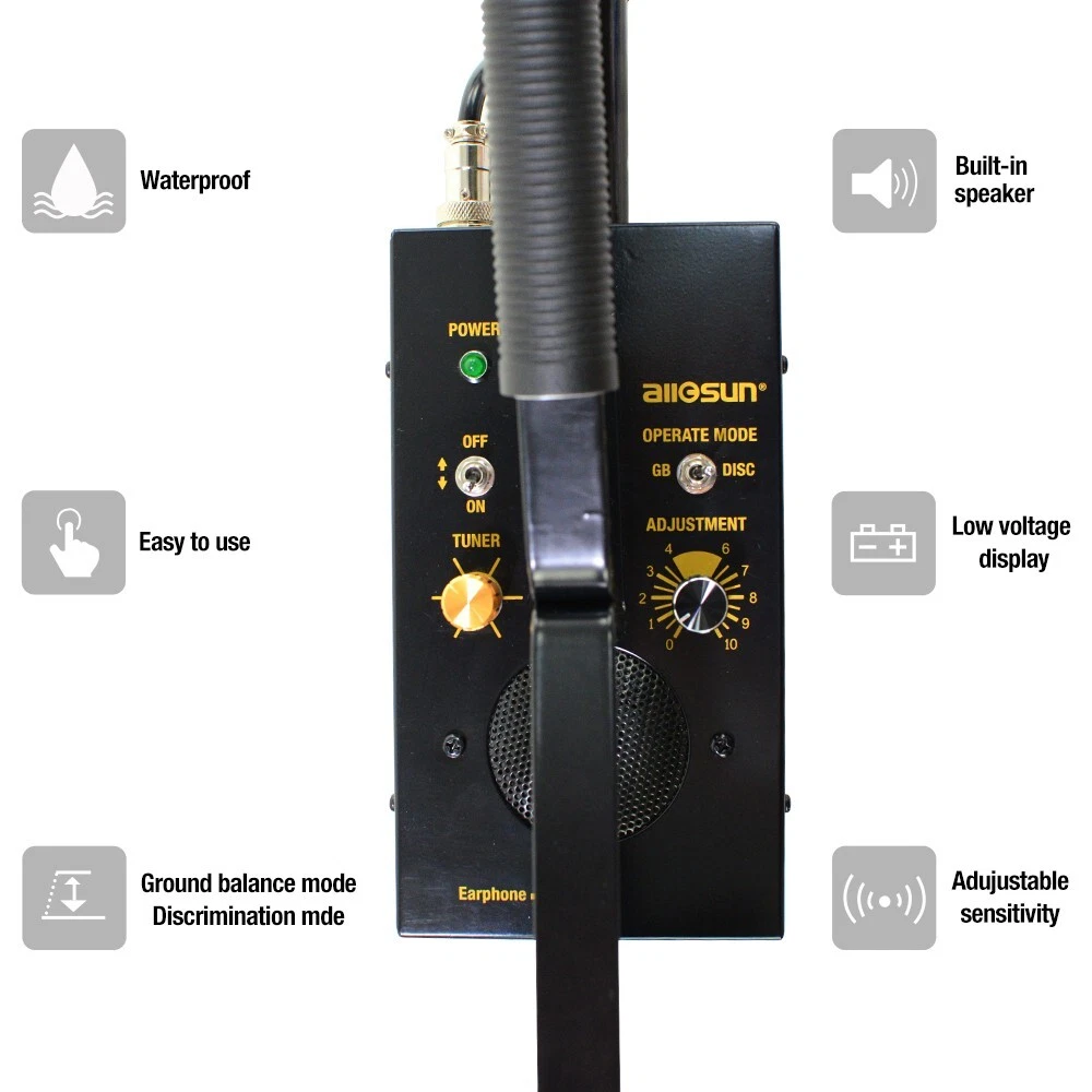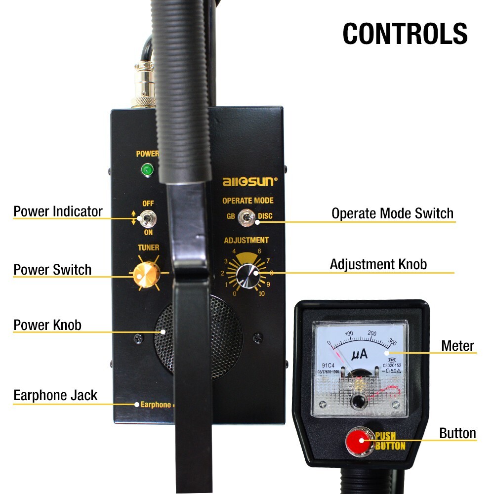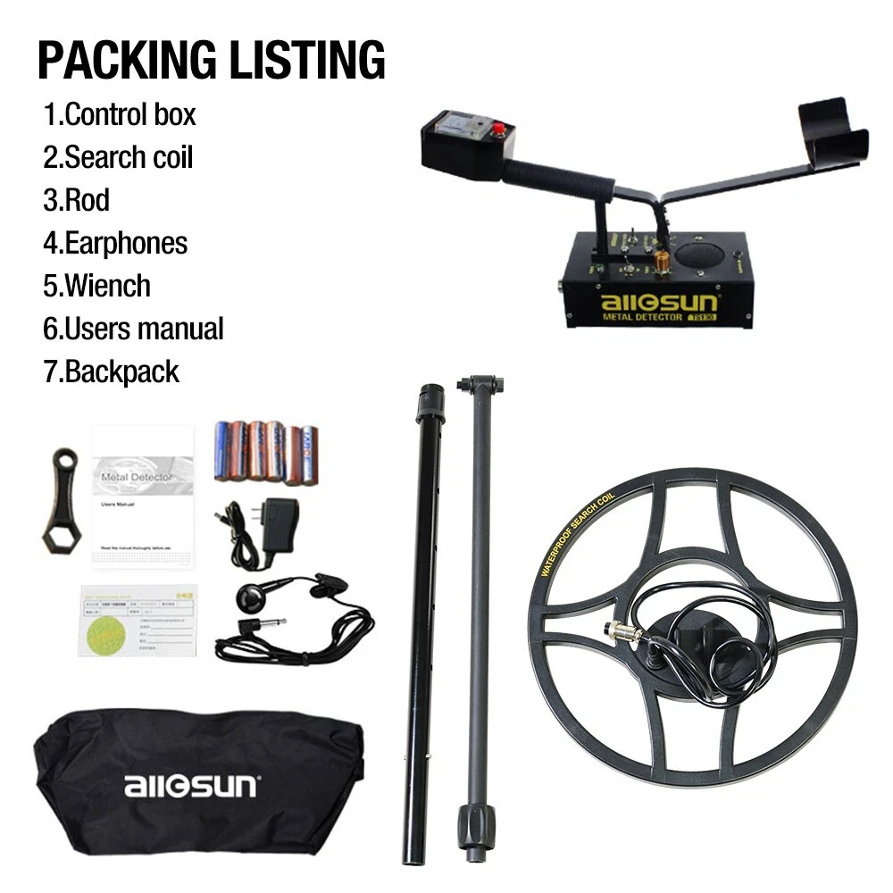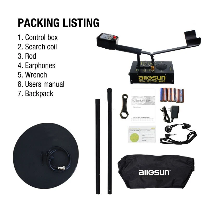 Special Offers Newly Listed All Auctions Buy It Now Contact Us Very thanks for choosing allsun Ground Search Metal Detector. The main products from allsun contain Multi-meter,Digital Multimeters,Digital Clamp meter,Metal Detectors,Distance Measures,Infrared Thermometer,Voltage, Battery Tester,Digital Scale and Multifunction Sensor all of which have an advantage in domestic and overseas markets. If you are now looking for a Ground Search Metal Detector, exactly, just choose it! I NTRODUCTION: Ground Search Metal Detector Item Specifics: Signal frequency:6.99KHz Audio frequency:450Hz Operating current: 6 x 1.5V AA battery(NOT INCLUDED) Power consumption: 0.6W Weight: about 4 kg Max detecting depth: 2 m (Experimental Environment For 60CM*60CM*1CM steel plate on the groud surface) About this item Easy operation: the pinpointing metal Detector is simple to use and lightweight enough to make it portable and convenient to carry on location hunting. Treasure hunt: search the backyard, beach, or park for all kinds of valuable metal from iron relics to Gold coins Find buried treasure: 2 detection modes (ground balance mode and discrimination mode) to filter out “Garbage” metals Built-in Speaker: the metal pin pointer Detector features a built-in Speaker for audio sound and adjust the volume of the Speaker and headphones. Max detecting depth: my testing result shows that the max detecting depth: 2 m. (* the detecting range Depends on the size of metal, the metal purity, solid quality and the operation of machine.) Operating Modes 1. Ground Balance Mode It is therefore recommended to use this mode regardless of where it is being operated. The instrument will give continuous sound when you move the search coil above the target object. Every type of metal can make the instrument's sound become louder and make the reading of the meter increase. 2. Discrimination Mode It allows you to distinguish ferrous metal from non-ferrous metal. By the sound and the reading of the meter, you could also select the metal target you want to find and that which you don't. The Discrimination mode does not have the function to exclude the "mineralisation reaction" and the disturbance from the ground, so you should keep a constant distance between the search coil and the ground while moving the search coil slowly. Never move the search coil quickly. The metal detector the winding in the search coil a concentric. The coil measures in diameter, at least fifteen inches, they actually work well, a little on the heavy side but again easy to use, do have good depth. Packing List of the Underground Metal Detector Shipping Returns Customer Services Copyright of XXXX. All rights reserved.