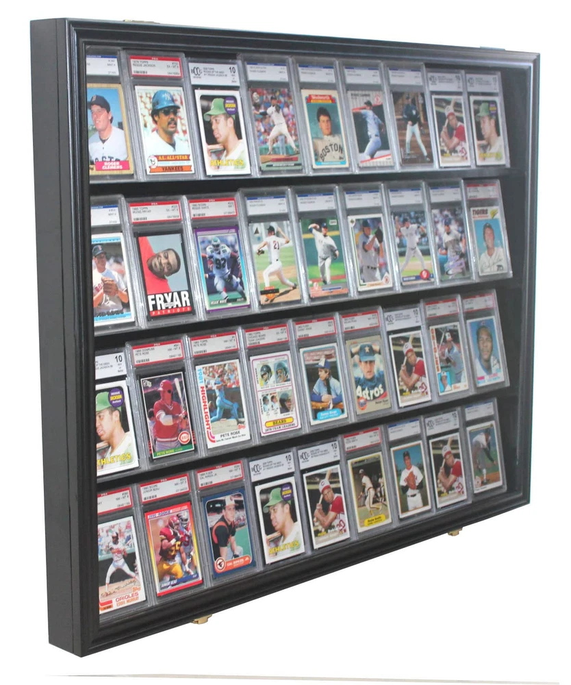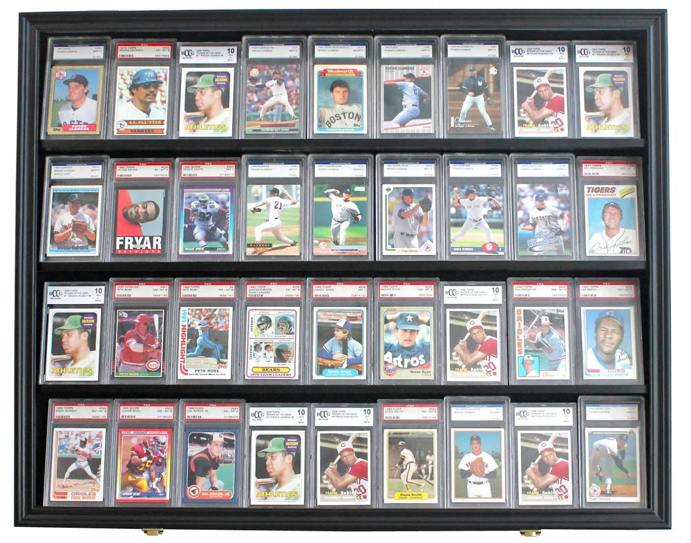 Black Finish. Cards NOT Included. Collector's choice display case for sports graded cards graded/ungraded up to 5.5" tall. . Please measure cards to make sure they are no more than 5.5" height. So, this would only fits graded Professional football, basketball, baseball, hockey trading cards in plastic cases that are no taller than 5.5". You can display 36 graded cards or 48 hard sleelves total. Dimensions: 30.5" W X 24.25" H X 2"D, baseball card display case is made of Grade A+ acrylic, with 96% transparency, 98% UV protection. It will protect the cards to fade while providing very transparent view for the best showing of the cards. The lockable anti-theft locks keep your sports cards memorabilia or collectibles from inquisitive hands. Metal brackets are already installed on the back for hanging. Wall hooks included. While this would be of great use if you are a card collector it can also be a great unique gift for someone who collects sports trading cards are an hobby.
