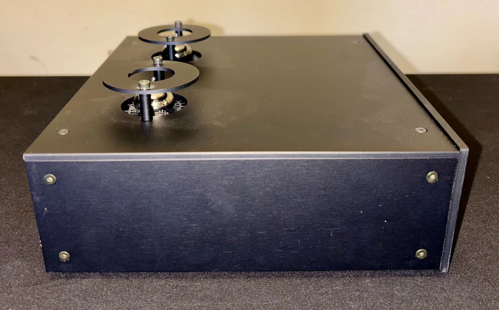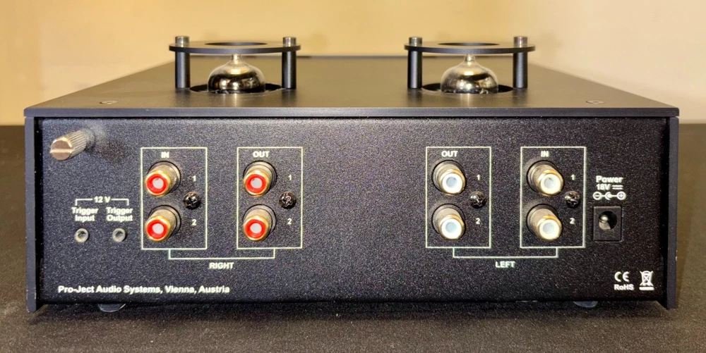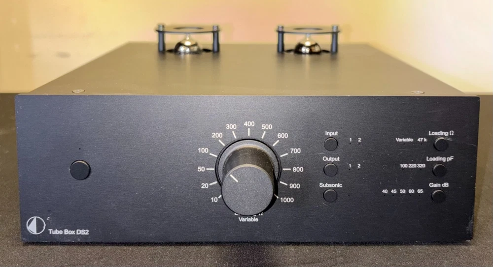 Pro-Ject Tube Box DS2 Phono Preamplifier (Black) Tubes: 2 x ECC83 (12AX7) Input impedance: Variable 10-1000 Ohm, fix 47 kOhm Gain MM / MC: 40 / 45 / 50 / 60 / 65 dB Output voltage typically: 500 mV/1kHz at 5mV/1kHz (at 40dB) RIAA curve accuracy: +/- 0.2dB/20Hz - 20kHz Inputs: 2 x Phono (RCA) Outputs: 2 x Line (RCA)