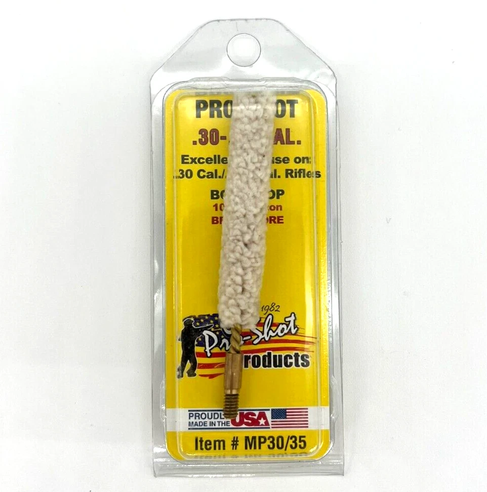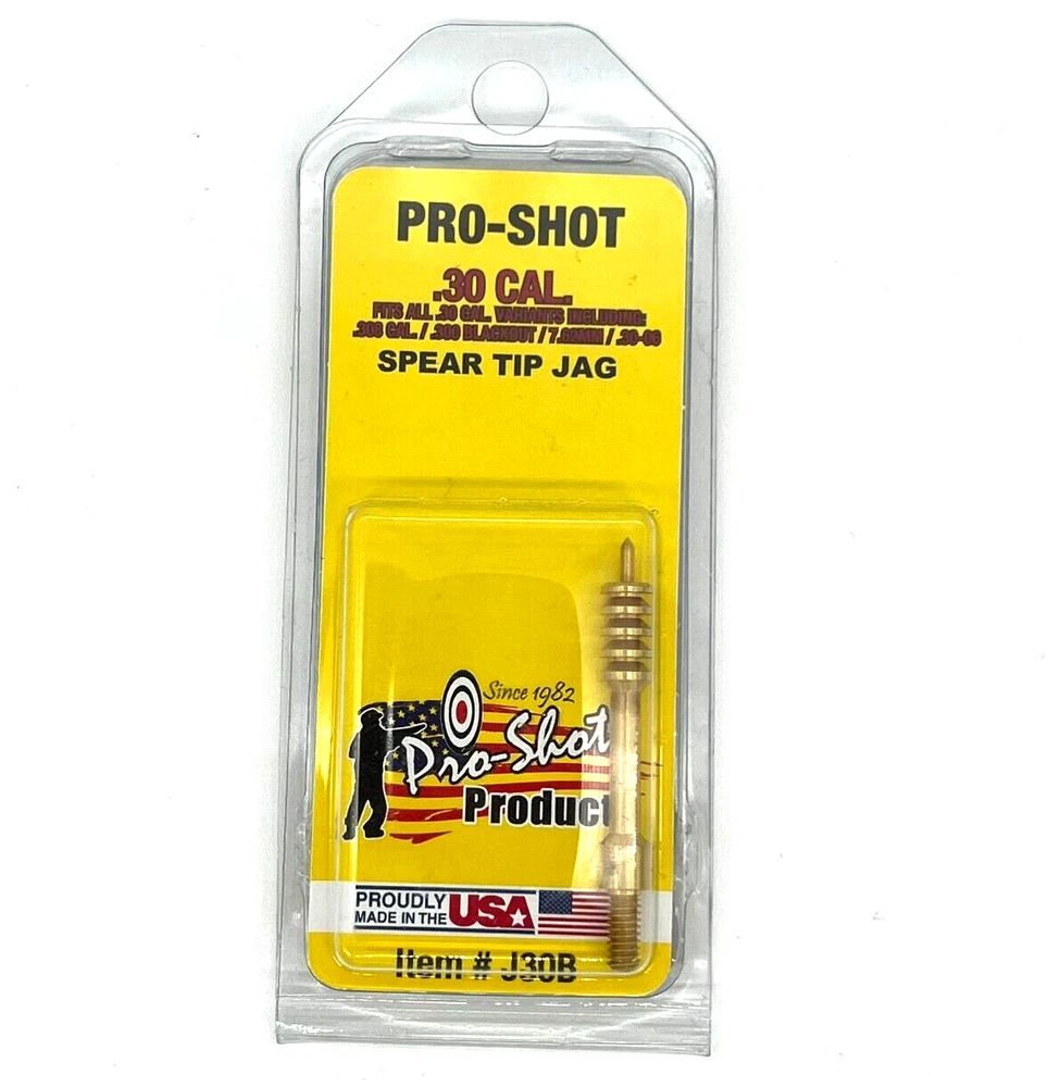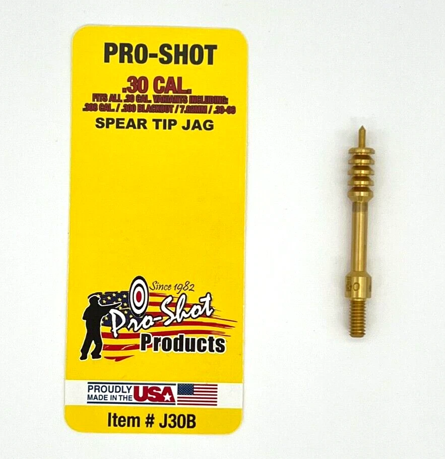 SET INCLUDES: (1) .30-.35 Cal. Cotton Bore Mop (1) Spear Tip .30 Cal. Jag Features: Bore Mop: Pro-Shot Exclusive Quick Clean/Mop Design 100% Cotton Thick Fill American Standard #8-32 Threads Made in USA Jag: Pro-Shot System - Precision Engineered Design, Fit, & Function Fits smoothly with Pro-Shot .27/U Cal. Cleaning Rods Precision #8-32 Threads Jag Stamped with size for easy identification Made in USA Thread Information: All Pro-Shot Brushes and Jags are Mfg. with American Standard Threading Jag: .17 and .20 Cal. - #5-40 thread Rifle and Pistol - #8-32 thread Shotgun - #5/16-27 thread More Information: .30-.35 Cal. Cotton Bore Mop - Fits: .30 Cal./7.62mm/.300 BLK/.303 Cal./.308 Cal./8mm/.338 Cal./ .35 Cal. 100% Cotton Bore mop with thick fill and brass core. Pro-Shot mops are made of the highest quality construction possible. Mops can be used for quick cleaning and bore lubrication. Mops are especially excellent when using oil for bore lubrication because they create foaming action that helps in the lubrication process. --- Spear Tip .30 Cal. Jag Pro-Shot’s Benchrest Quality spear tip brass jag keeps the cleaning patch in place running through the bore. The most efficient and effective way to clean a bore is with a jag draped with a patch that completely covers the bore. This reduces cleaning time and provides a superior clean barrel. Pro-Shot designs each jag to match up with our cleaning rods for a totally smooth fit. With our vast work and knowledge on manufacturing parts over the years, we developed what we like to call the Pro-Shot System. The Pro-Shot System is a simple superior solution: Use our cleaning rod, jag, and cleaning patches for a perfect fit every time you clean!