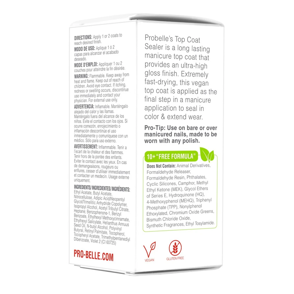 HIGH-GLOSS | FAST DRY | SEALS & PROTECTS An innovative top coat sealer with an ultra-high gloss finish. It provides a gel-like appearance to nails that extend the life of a manicure with special technology that cures for a super seal. Protective layer anchors lacquer to prevent chipping with an accelerated dry time. Perfect for all nail types. 9-Free: No Dibutyl Phthalate (DBP), Formaldehyde, Toluene, Formaldehyde Resin, Camphor, Triphenyl Phosphate (TPHP), Xylene, Paraben, Phthalate, or Animal Ingredients. 0.5 FL OZ | 15 ML Made in USA Directions: Apply 1 to 2 coats to reach the desired finish. Reapply twice a week if needed to revive shine. Instructions: Ethyl Acetate, Butyl Acetate, Nitrocellulose, Adipic Acid/neopentyl Glycol/trimellitic Anhydride Copolymer, Isopropyl Alcohol, Acetyl Tributyl Citrate, Heptane; Benzophenone-1, Ethylhexyl Methoxycinnamate, Ethylhexyl Salicylate, Helianthus Annuus Seed Oil, N-butyl Alcohol, Polyvinyl Butyral, Retinyl Palmitate, Tocopherol, Tocopheryl Acetate, Trimethylpentanediyl Dibenzoate, Violet 2 (CI 60725).