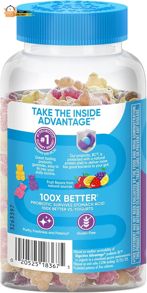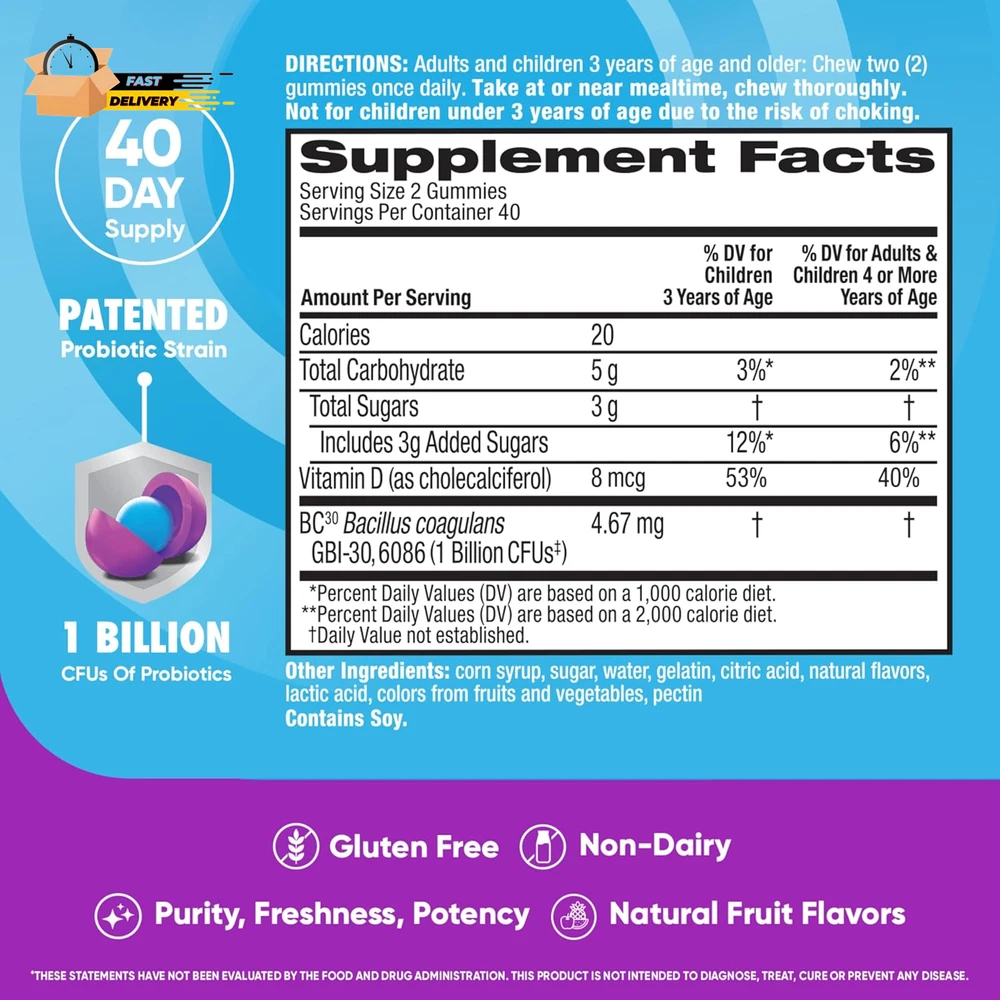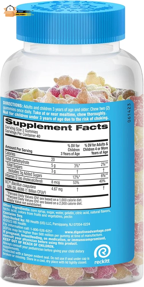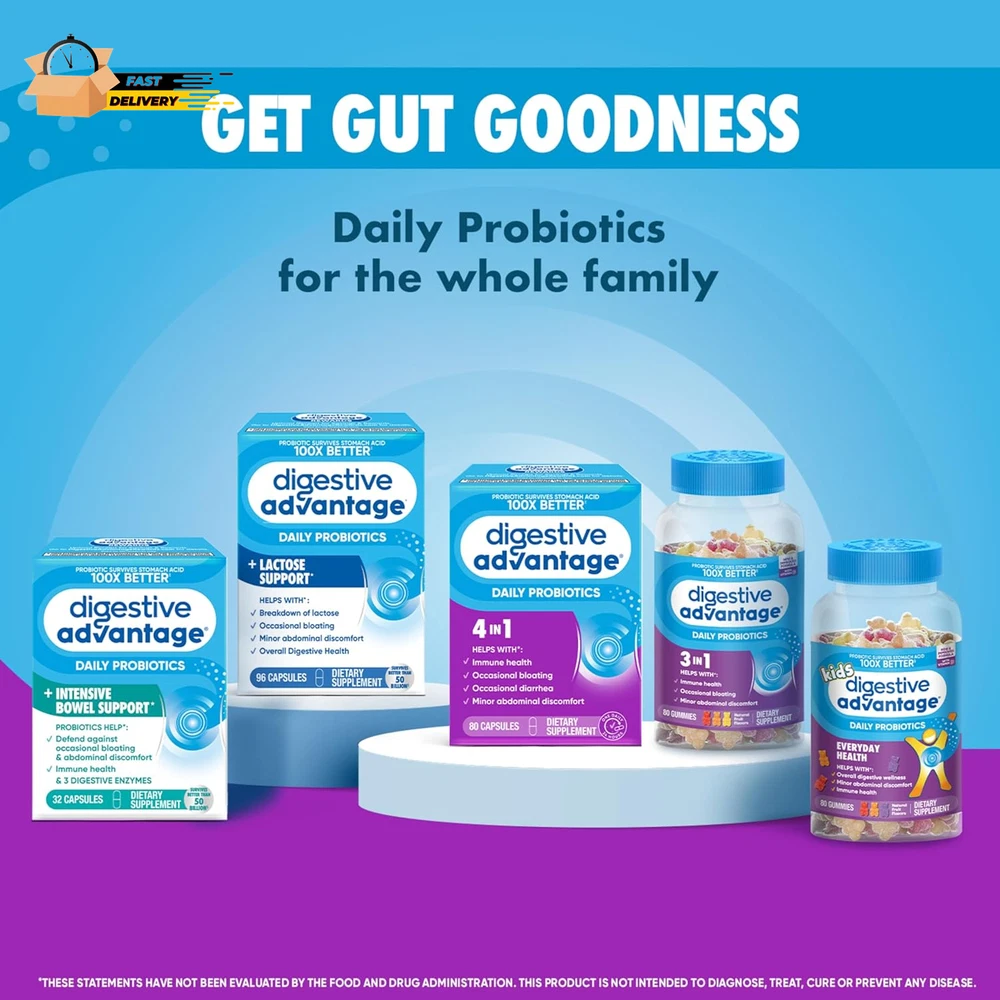 Store New Arrivals Add to Favorite View Feedback Contact Probiotics for Digestive Health, Probiotic Gummies & Vit D, Description Item model number ASA-117 Unit Count 80 Count Primary Supplement Type protein Is Discontinued By Manufacturer No Product Dimensions 3.06 x 3.06 x 5.51 inches; 11.68 ounces Country of Origin USA Item dimensions L x W x H 3.06 x 3.06 x 5.51 inches Product Benefits Immune Support,Digestive Health Item Weight 11.68 ounces Batteries 2 CR2 batteries required. Diet Type Gluten Free Special Ingredients Probiotic Flavor Natural Fruit Item Form Gummy DAILY PROBIOTIC GUMMIES FOR WOMEN & MEN: Digestive Advantage Daily Probiotics with Vit D are crafted to help support your digestive health and immune health.* DIGESTIVE HEALTH: These delicious probiotics for gut health help immune health, occasional bloating, and minor abdominal discomfort.* IMMUNE SUPPORT: 70% of your immune system is in your digestive tract. The good bacteria in Digestive Advantage Probiotic and Vitamin D helps support the immune cells in your gut. NUMBER 1 PROBIOTIC GUMMY BRAND1: Digestive Advantage is the #1 Probiotic Gummy brand 1. Don’t take our word for it, check out our 12k+ ratings and read our customer reviews. Based on unit sales 52W ending 12/31/22. HUNDRED TIMES BETTER: 1 Billion CFUs of patented BC-30 probiotics survives stomach acid 100X BETTER vs. yogurt. Based on median survivability of Digestive Advantage Probiotic BC30 vs. yogurts in a simulated gastric environment. BETTER THAN 50 BILLION: Our BC-30 Probiotic strain has a protective shell that makes it survive stomach acid better than products offering 50 Billion live cultures. PATENTED MEN & WOMEN PROBIOTIC: Our probiotic strain is protected with a natural protein shell to deliver more beneficial bacteria to your gut alive, to support gut health for women and men.* Digestive Advantage Daily Probiotic Gummies comes with Natural Fruit Flavors and are Gluten Free, Non-Dairy, and are guaranteed for Purity, Freshness, Potency. SCHIFF DIGESTIVE ADVANTAGE PROBIOTIC: Digestive Advantage prebiotic and probiotic fiber gummies, probiotic pills, probiotic gummies, and kids gummies are designed to target the source and support gut health for men and women.* *These statements have not been evaluated by the Food and Drug Administration. This product is not intended to diagnose, treat, cure or prevent any disease. "PROBIOTIC: Digestive Advantage Daily Probiotics for women & men are crafted to help support your digestive health and immune health.* PROBIOTIC GUMMIES 4in1: Our probiotics for digestive health help immune health, occasional bloating, and minor abdominal discomfort.* NUMBER 1 PROBIOTIC: Digestive Advantage is the number 1 probiotic gummy brand, based on unit sales 52W ending 12/31/22. BETTER THAN 50 BILLION: Our BC-30 Probiotics survive better than products offering 50 Billion live cultures. IMMUNE SUPPORT: 70% of your immune system is in your digestive tract. The good bacteria in Digestive Advantage Probiotic helps support the immune cells in your gut. PATENTED MEN & WOMEN PROBIOTIC: Our probiotic strain is protected with a natural protein shell to deliver more benefitial bacteria to your gut alive, to support gut health for women and men.* Digestive Advantage Daily Probiotic Gummies comes with Natural Fruit Flavors and are Gluten Free, Non-Dairy, and are guaranteed for Purity, Freshness, Potency. Digestive probiotics for women digestive health and probiotics for men gut support are made to support your overall health.* SCHIFF DIGESTIVE ADVANTAGE PROBIOTIC: Digestive Advantage prebiotic and probiotic fiber gummies, probiotic pills, probiotic gummies, and kids gummies are designed to target the source and support gut health for men and women.* *These statements have not been evaluated by the Food and Drug Administration. This product is not intended to diagnose, treat, cure or prevent any disease. " ABOUT US We offer the best prices around on high quality products. Our E-store includes media such as books, movies, music and games while offering electronics, toys, sporting apparel, clothing, tools, general home, garden items and more. SHIPPING We are always working hard to ensure your package arrives as soon as possible. Please understand that some factors like weather, high postal traffic, and the performance of shipping companies are outside of our control. We offer free shipping to the lower 48 states and ship within 2 business days of payment, usually sooner. We do not accept P.O. Boxes. Please provide a physical address. For shipping outside of the continental USA, we only use eBay's Global Shipping Program.The item is shipped to KY and then sent to the rest of the world. International customers are responsible for all duties and taxes. Continue to check out in order to calculate costs for shipping the item to your country. Messages regarding eBay's Global Shipping Program MUST be directed at eBay EXCLUSIVELY. RETURNS We offer a 30-Day Return Policy on items which you are not completely satisfied with. You have the option for a full-refund or an exchange of the item. No returns are available on items shipped outside of the USA. PAYMENT We accept PayPal. CONTACT US This page content is yet to come Please ad us to your favorite seller and visit again later Thank You CUSTOMER SATISFACTION We try our very best to make sure every customer is completely satisfied. If there's a problem, message us! We're happy to help. WE ACCEPT Copyright © 2021 AutoDS. | All Rights Reserved