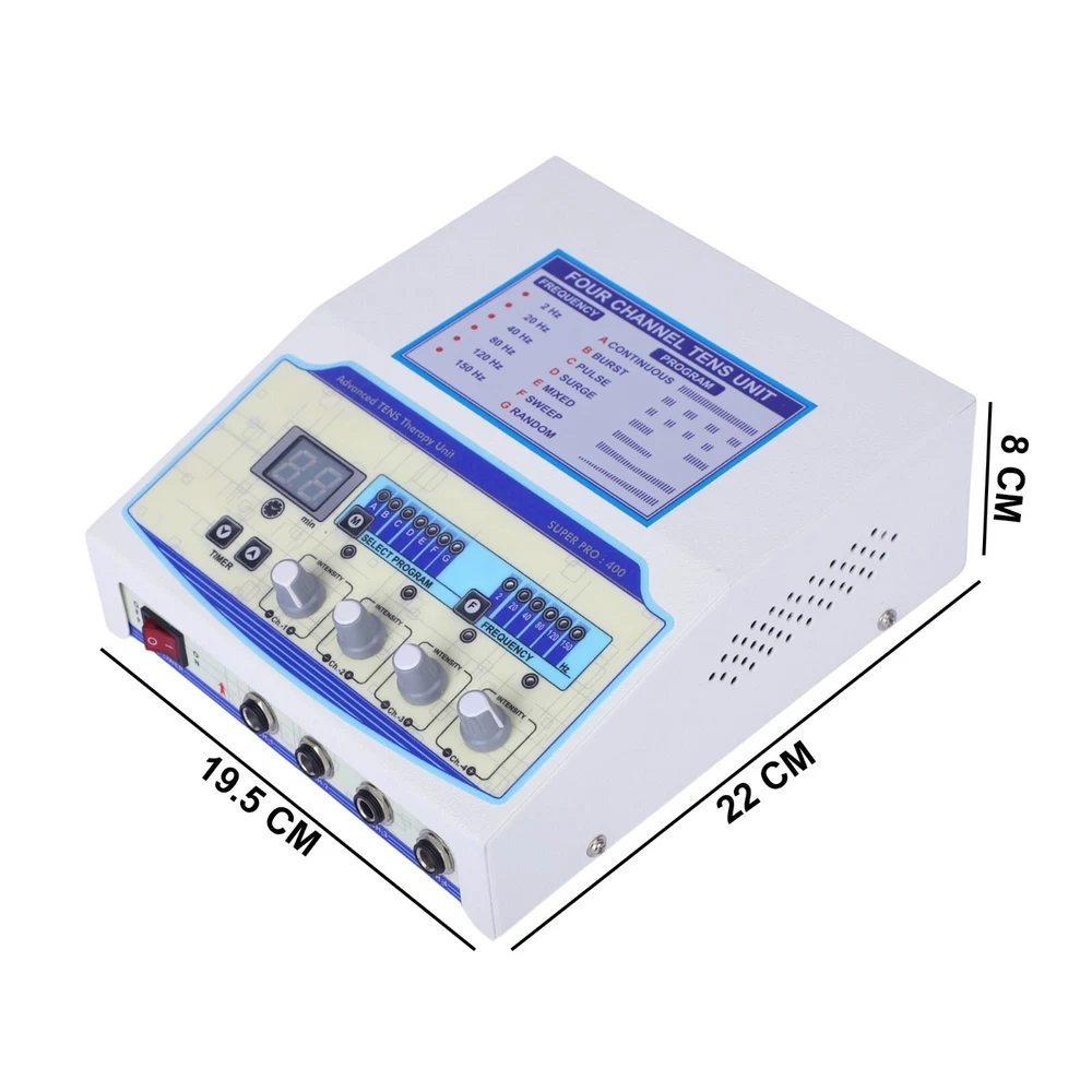 We sell only Quality Equipment We are professional company deals in Healthcare equipment for the last 15 years Fast Shipping Through DHL Express Pain free... Stress free... On the Road to Faster Recovery Revolutionary Devices in Pain Management and Rehabilitation Professional use 4 channel Electrotherapy 4 channel Multi Therapy Unit SALIENT FEATURES OF THE UNIT Four independent output channel with indicator 0-80 mA pulse Amplitude on each channel 60 Minutes digital timer with start / pause key LED display for pulse mode and pulse frequency In use indicator Audio buzzer at end of treatment & for safety output control Light weight for carry purpose Mode Selection: CONT. , Burst, Pulse, Mixed, SURGE , SWEEP, Random Frequency : 2 Hz, 20 Hz, 40 Hz, 80 Hz, 120 Hz and 150 Hz Applications Low back pain Cervical spasms/pain Shoulder pain Hip strain Foot or ankle pain Wrist strengthening Intrinsic strengthening Grip strengthening Quadriceps strengthening Anterior shoulder subluxation Upper trap spasm Shoulder weakness Tibialis strengthening ACL reconstruction Fibromyalgia Package Includes : Carbon Pads resuable : 08 Nos. Self Adhesive Pads : 08 Nos. Lead Wires : 04 Nos. AC Cord : 01 No. Instruction Manual : 01 No. Power supply : 110V/220V 50/60 Hz Power cable connector /socket provided for different countries Order safe item from us: The following FDA Disclaimer is required for all eBay listing in Healthcare category and is included for REFERENCE: The sale of this item may be subject to regulation by the U.S. Food and Drug Administration and state and local regulatory agencies. If so, do not bid on this item unless you are an authorized purchaser. If the item is subject to FDA regulation, we will verify your status as an authorized purchaser of this item before shipping of the item. Taxes, Customs & Duties: Custom duty / VAT charges / Import Tax does not includes in the price if any application at final destination i.e. buyer responsibility) or you may kindly give us some suggestions about that, we promise to do our best to help you! We will make you sure that you will receive the product in Good Condition (FeedBack) Your *feedback is important for us to grow our business on eBay, so please do leave feedback, *Thank you.*