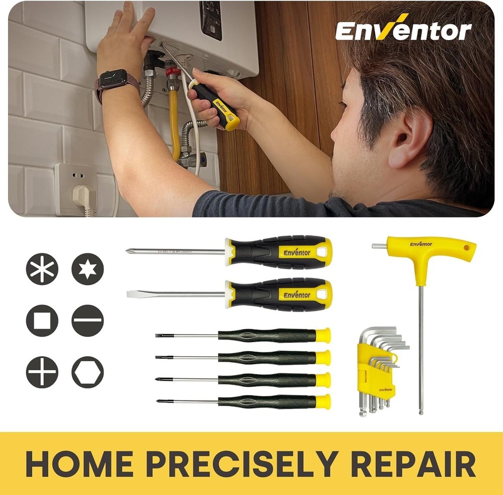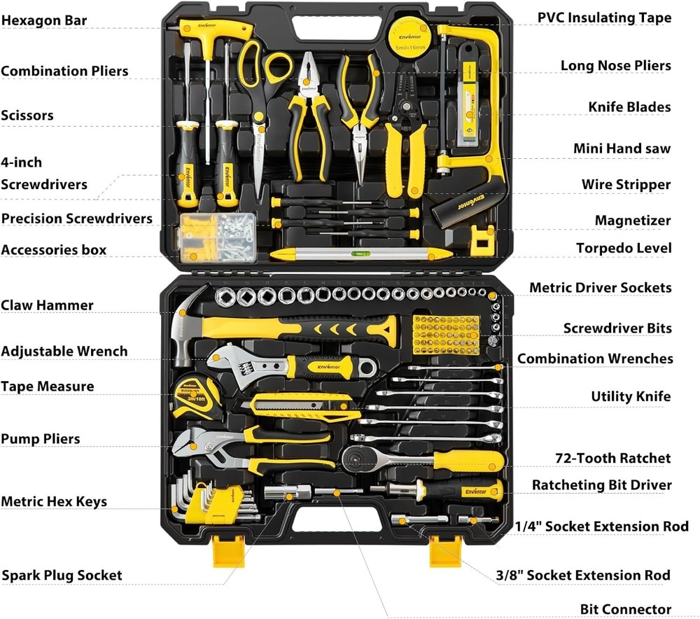 Profesional Juego de Herramientas para Reparacion Mecanica con Caja 220 Piezas Descripción Item model number SGRD003 Part Number SGRD003 Batteries Required? No Unit Count 1.0 Count Power Source hand_powered Item Package Quantity 1 Country of Origin China Item Weight 13.38 pounds Batteries Included? No Size Large tool set-220PCS Package Dimensions 17.13 x 13.54 x 3.94 inches Included Components function(f) {var _np=(window.P._namespace("DetailPageProductOverviewTemplatesJava"));if(_np.guardFatal){_np.guardFatal(f)(_np);}else{f(_np);}}(function(P) { P.when('A').execute(function(A){ A.on('a:truncate:po-attribute-truncate-1:updated', function(data) { var isTruncated = !data.truncateInstance.getIfTextFits(); var seeMoreElement = document.getElementById('po-attribute-see-more-id-1'); if(seeMoreElement) { seeMoreElement.style.display = isTruncated ? '' : 'none'; } }) }); })); 5* hex key wrench (2,3,4,5,6), 1* torpedo level, 24* socket, 3* extension bar, 1* accessories box, 110* accessories See more Si tiene algun problema con su orden envienos un mensaje, todos los mensajes son contestados antes de 24 horas. Gracias If you have any issue with your order send us a message, we answer all messages within 24 hours. Thank you KIT DE HERRAMIENTAS PARA EL HOGAR PARA TODO USO: El juego de herramientas manuales multiusos ENVENTOR contiene un juego de trinquete de 24 dientes de calidad profesional de 220 piezas, destornillador de precisión, llave hexagonal, alicates, llave inglesa, martillo de garra, cinta métrica, cuchillo multiusos, alicates para bomba de agua, cortadores de alambre, tijeras, arco de sierra manual, una gama completa de enchufes de tamaño métrico de 1/4 de pulgada y 3/8 de pulgada, pelacables y más. Ideal para reparaciones automotrices, mecánicas y domésticas. ALTA CALIDAD Y DURABILIDAD: Estos juegos de herramientas de reparación de automóviles para el hogar están forjados con acero de alta resistencia para mayor durabilidad, mientras que el acabado cromado le da al producto un acabado brillante. El mango de la herramienta está hecho de plástico de doble inmersión incrustado en un mango de material de PVC de diseño ergonómico. FÁCIL DE LLEVAR Y ALMACENAR: Viene en una práctica caja de herramientas de plástico para un fácil almacenamiento y portabilidad. Su interior resistente y su organizador mantienen las herramientas en su lugar para que no tenga que preocuparse por encontrarlas en una pila desordenada. Tamaño de la caja de almacenamiento: 17"*3.8"*12.5". Peso de la caja de almacenamiento: 12 lb.