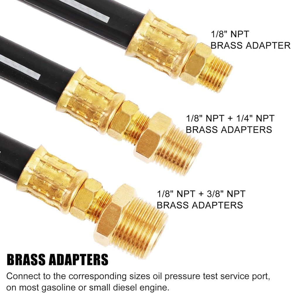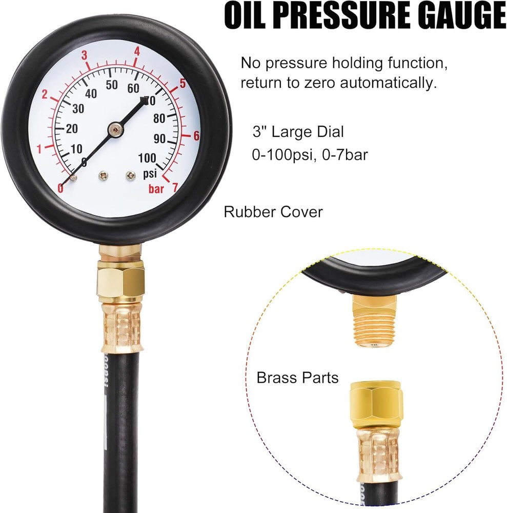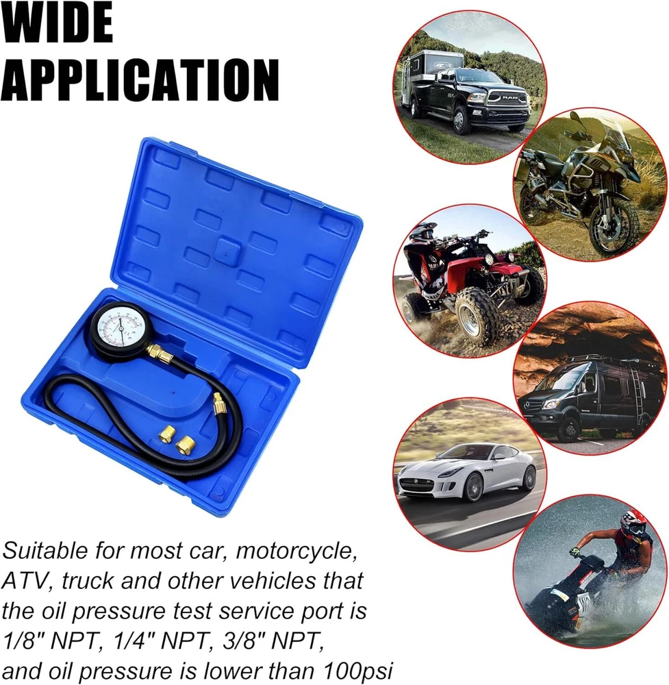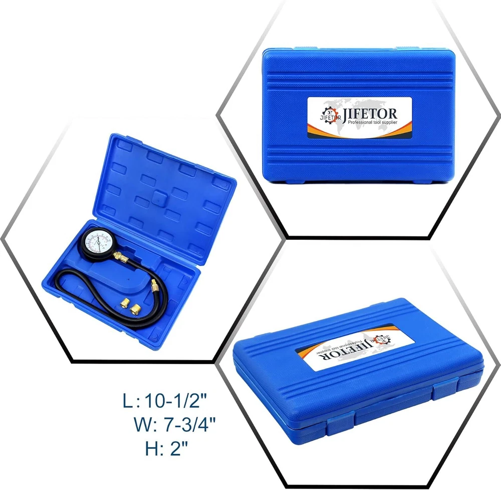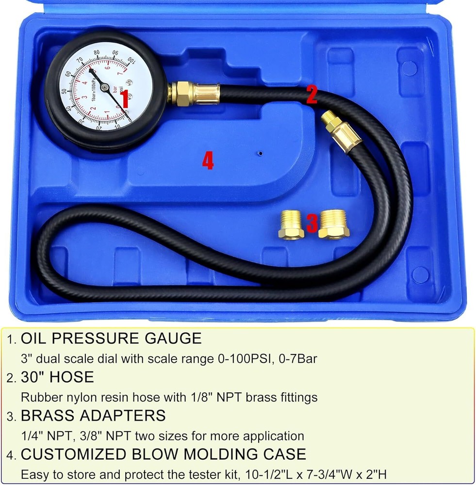 Oil Pressure Tester Kit Professional Engine Diagnostic Test 100psi Pressure Gaug Oil Pressure Test and Diagnostic: JIFETOR engine oil pressure tester kit is used for measuring oil pressure on lubrication system quickly and accurately. The gauge readings assist to diagnose if there are following problems: blocking oil strainer or oil filter, broken pressure-limiting valve spring, poorly working oil pump, low/high oil viscosity, blocking lubrication oil channel, blocking oil filter core and by-pass valve is difficult to open etc Fitment Type: The oil pressure test tool includes 3 sizes (1/8 inch, 1/4 inch, 3/8 inch National (American) Pipe Thread) selectable brass adapters, can be connected to the corresponding sizes oil pressure test service port, on most gasoline or small diesel engine, includes car, motorcycle, ATV, truck and so on, which oil pressure not exceeds 100 pounds per square inch Pressure Gauge and Hose: Pressure gauge adopts rubber cover protected 3 inch large dial. 0-100 pounds per square inch and 0-7 bar small scale range with big dial, very easy to read. No pressure holding function, return to zero automatically. The 30 inch long rubber nylon resin hose, is equipped with a 1/8 inch National (American) Pipe Thread brass adapter, can be connected to 1/4 inch and 3/8 inch adapters directly. Max working pressure: 300 pounds per square inch Easy to Operate: When you want to test the oil pressure by this engine oil pressure diagnostic gauge, disassemble the oil pressure sensor first, then screw on the oil pressure gauge, start the vehicle to operate it at a specified speed, the reading in the pressure gauge is the oil pressure of lubrication system. Please refer to equipment manufacturer's operation instruction and compare to the manufacturer's recommended readings Blow-Molded Case: This oil pressure tester gauge set includes 1 piece oil pressure gauge with hose and 2 pieces adapters. Easily accessed and organized in a sturdy wearproof plastic case for easy transportation, simple storage, and quick identification. Locking buckles for added security and molded handle for comfortable travel Shipping We offer FREE shipping on all orders! We ship within Three business days of payment, usually sooner. Local pickups and combined shipping options are not provided at this time. Return You can return a product for up to 30 days from the date you purchased it. Any product you return must be in the same condition you received it and in the original packaging. Please keep the receipt. Payment We accept payment by any of the following methods: PayPal Please pay as soon as possible after winning an auction, as that will allow us to post your item to you sooner! Feedback Customer satisfaction is very important to us. If you have any problem with your order, please contact us and we will do our best to make you satisfied. Contact Us If you have any queries, please contact us via ebay. We usually respond within 24 hours on weekdays. Please visit our eBay store to check out other items for sale! Thank you for shopping at our store.