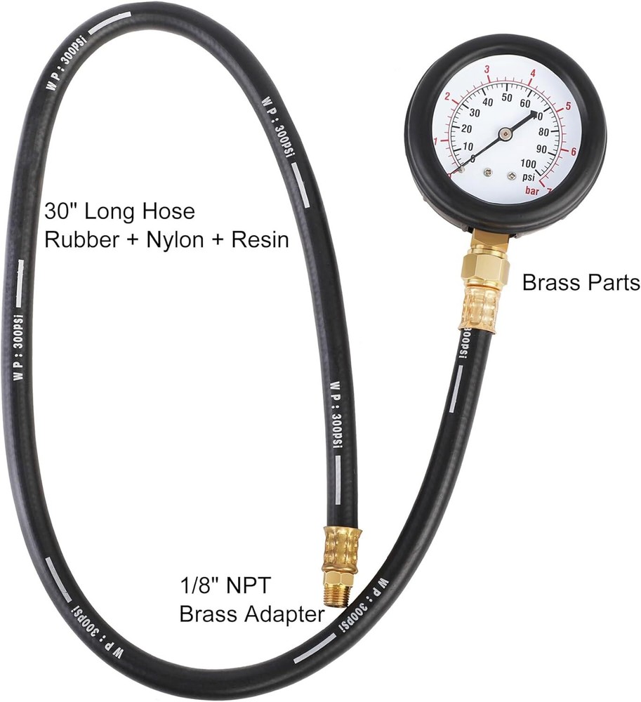Oil Pressure Tester Kit Professional Engine Diagnostic Test 100psi Pressure Gaug Oil Pressure Test and Diagnostic: JIFETOR engine oil pressure tester kit is used for measuring oil pressure on lubrication system quickly and accurately. The gauge readings assist to diagnose if there are following problems: blocking oil strainer or oil filter, broken pressure-limiting valve spring, poorly working oil pump, low/high oil viscosity, blocking lubrication oil channel, blocking oil filter core and by-pass valve is difficult to open etc Fitment Type: The oil pressure test tool includes 3 sizes (1/8 inch, 1/4 inch, 3/8 inch National (American) Pipe Thread) selectable brass adapters, can be connected to the corresponding sizes oil pressure test service port, on most gasoline or small diesel engine, includes car, motorcycle, ATV, truck and so on, which oil pressure not exceeds 100 pounds per square inch Pressure Gauge and Hose: Pressure gauge adopts rubber cover protected 3 inch large dial. 0-100 pounds per square inch and 0-7 bar small scale range with big dial, very easy to read. No pressure holding function, return to zero automatically. The 30 inch long rubber nylon resin hose, is equipped with a 1/8 inch National (American) Pipe Thread brass adapter, can be connected to 1/4 inch and 3/8 inch adapters directly. Max working pressure: 300 pounds per square inch Easy to Operate: When you want to test the oil pressure by this engine oil pressure diagnostic gauge, disassemble the oil pressure sensor first, then screw on the oil pressure gauge, start the vehicle to operate it at a specified speed, the reading in the pressure gauge is the oil pressure of lubrication system. Please refer to equipment manufacturer's operation instruction and compare to the manufacturer's recommended readings Shipping We offer FREE shipping on all orders! We ship within Three business days of payment, usually sooner. We use a selection of shipping services such as UPS, FedEx, USPS etc. We only ship to the lower 48 states, no APO/FPO addresses or PO Boxes allowed. Local pickups and combined shipping options are not provided at this time. Return You can return a product for up to 30 days from the date you purchased it. Any product you return must be in the same condition you received it and in the original packaging. Please keep the receipt. Customer satisfaction is very important to us. If you have any problem with your order, please contact us and we will do our best to make you satisfied. Contact Us If you have any queries, please contact us via ebay. We usually respond within 24 hours on weekdays. Please visit our eBay store to check out other items for sale! Thank you for shopping at our store.