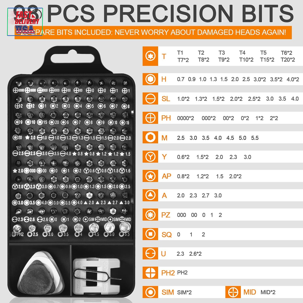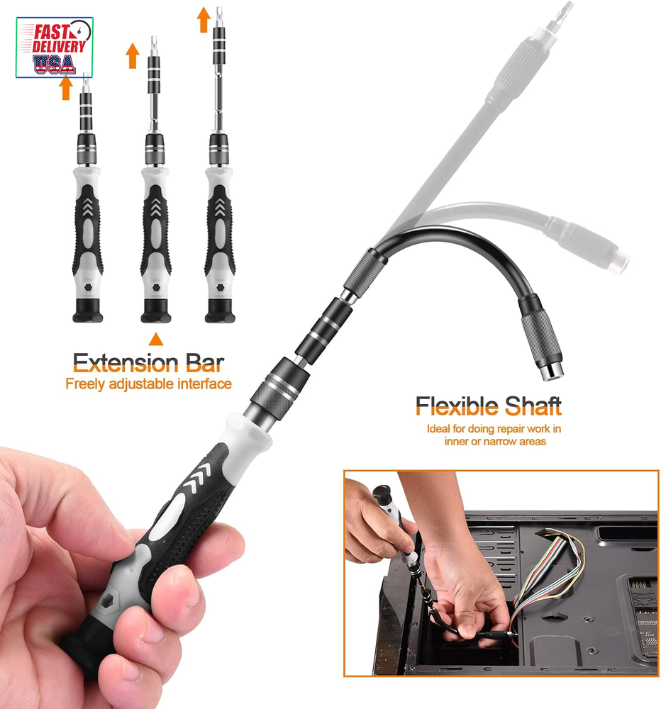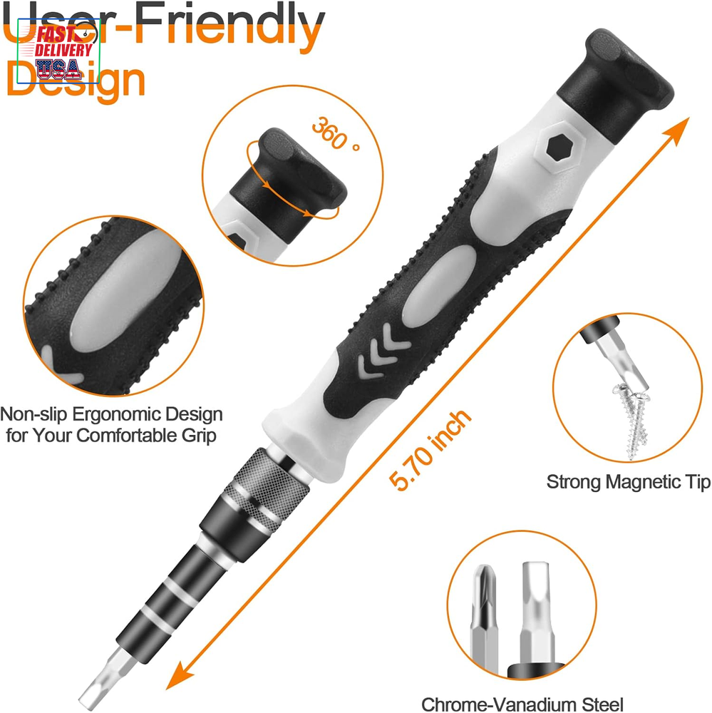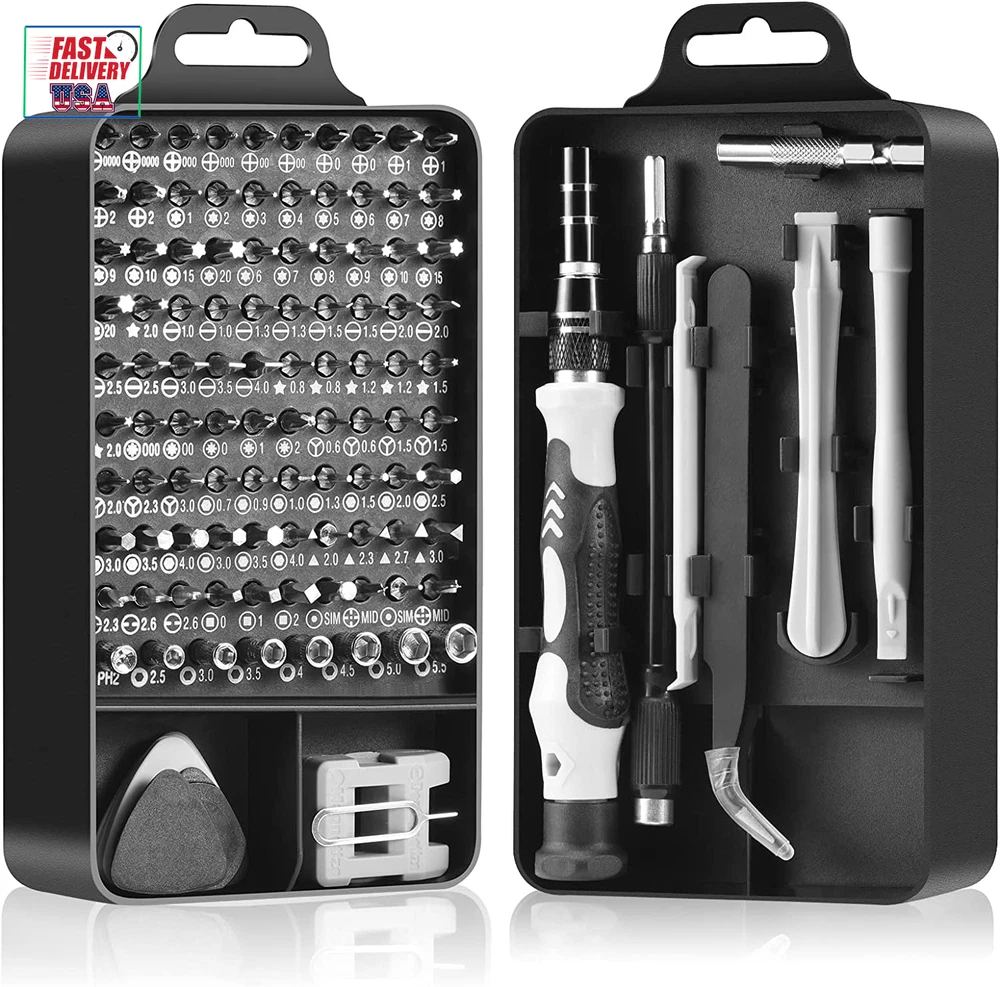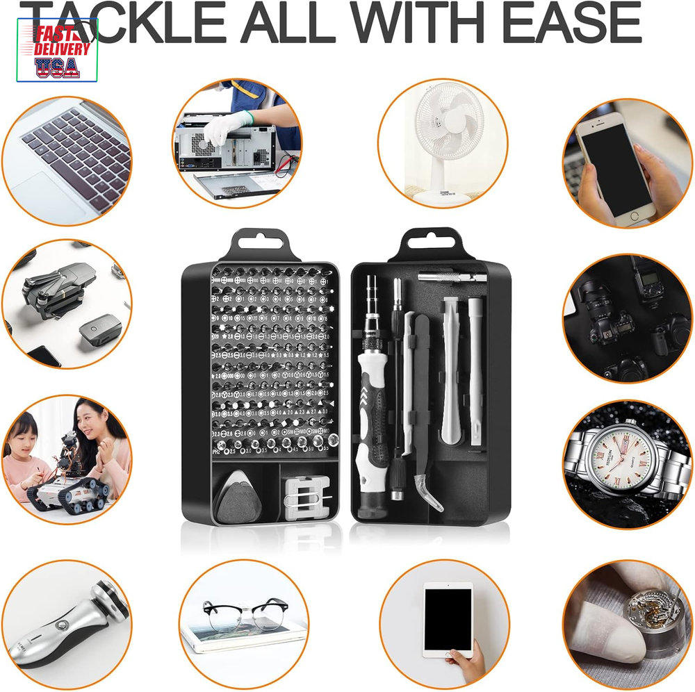 Store New Arrivals Add to Favorite View Feedback Contact Precision Screwdriver Set, Professional Grade 115 in 1 Magnetic Repair Tool Kit for Electronics, Computer, Iphone, Laptop, Game Console, Watch, Eyeglasses, Modding, and DIY Projects Description Item model number Classic 115 in 1 Style Manual Number of Items 115 Power Source Hand Powered Pattern Solid Country of Origin China Batteries Included? No Head Size 5.7 Measurement System Metric Usage Professional Batteries Required? No Finish Chrome Material Chrome Vanadium Steel Model Name Classic 115 in 1 Item Package Quantity 1 Item dimensions L x W x H 6.7 x 3.5 x 2.1 inches Handle/Lever Placement Ergonomic Handle Item Weight 15.1 ounces Head Style Phillips, Triangle, Pozidriv, Socket, Hexagon, Torx, U-Type, Square, Pentalobe, Y-Type, Schlitz Special Features Portable, Easy to Install, Magnetic, Adjustable Special Feature Portable, Easy to Install, Magnetic, Adjustable Part Number Classic 115 in 1 Color Black Shape Square Recommended Uses For Product laptops, phones, computers, glasses, game consoles, drones, and other electronics Included Components Depth Rod, Handles, Comes as a Combo Set, Case, Screwdriver Bits Product Dimensions 6.7 x 3.5 x 2.1 inches Size Small 【ALWAYS CHOOSE THE CLASSIC】 The 115 in 1 Precision Screwdriver Kit is the most original and classic electronics repair tool kit, containing 98 screwdriver heads and 17 accessories. The electronic multi-screwdriver basically covers all the tools for electronics and small repairs - perfect for laptops, phones, computers, glasses, game consoles, drones, and other electronics. 【TACKLE ALL WITH EASE】 The laptop screwdriver kit features a rotatable cap, ergonomic handle design, and a non-slip grip that provides comfort for extended use. The strong magnetic tip makes it easy to pick up and hold screws, and the flexible extension tool is perfect for those hard-to-reach screws. The magnetic driver kit also includes magnetic bit holder, tweezers, opening tool kit, SIM card removal tool, suction cup, and more. 【RELIABLE MATERIAL】 This magnetic replaceable screwdriver is crafted from high-quality CR-V steel, which boasts impressive strength, precision, and durability without damaging devices. Every bit is designed using thousands of refined repair data and undergoes a high-temperature treatment process to ensure stability and resistance to stripping, guaranteeing long-lasting use. 【PRACTICAL & COST-EFFECTIVE】 This computer screwdriver repair kit is equipped with 29 spare bits for frequently used models - such as phillips, slotted, torx, Y-type and hexagon, which reduces the trouble to find a new bit or replace a new screwdriver set if the bit is lost or damaged, making the lifespan of this electronics repair toolkit longer and save your money! 【PORTABLE & RELIABLE】 This mini screwdriver set has a compact size of 6.7 x 3.5 x 2.1 inches, making it the ultimate tool kit for computer enthusiasts on the go! The classic ABS case features a secure stay-shut latch, ensuring complete protection and organization of your tools. Plus, with Necamocu's long-term assurance, you can shop with complete peace of mind. Don't miss out on this must-have tool kit for your tech arsenal! Product Description Bit Included Specification Triangle 2.0, 2.3, 2.7, 3.0 Pozidriv PZ000, PZ00, PZ0, PZ1, PZ2 Mini Hexagon Socket M2.5, M3.0, M3.5, M4.0, M4.5, M5.0, M5.5 Phillips PH0000*2, PH000*2, PH00*2, PH0*2, PH1*2, PH2*2 Hexagon H0.7, H0.9, H1.0, H1.3, H1.5, H2.0, H2.5, H3.0*2, H3.5*2, H4.0*2 Torx T1, T2, T3, T4, T5, T6*2, T7*2, T8*2, T9*2, T10*2, T15*2, T20*2 U-Type U2.3, U2.6*2 Square SQ1, SQ1, SQ2 Pentalobe 0.8*2, 1.2*2, 1.5, 2.0*2 Y-Type Y0.6*2, Y1.5*2, Y2.0, Y2.3, Y3.0 Schlitz SL1.0*2, SL1.3*2, SL1.5*2, SL2.0*2, SL2.5*2, SL3.0, SL3.5, SL4.0 Special Type SIM*2, MID*2, PH2 Socket Save Space & Keep Your Tools Organized Tired of bulky toolboxes taking up valuable storage space? Our compact screwdriver set is the solution! With a sleek and lightweight design, this set won't take up much room in your toolbox or on your workbench. Save space and stay organized with our screwdriver set. Perfect Gift for Tech Lovers Looking for a practical and thoughtful gift for the DIY enthusiast in your life? Look no further than our screwdriver set! With a variety of tips to fit all types of screws and a compact carrying case, this set is sure to be a hit. When in doute, always choose the classic! Take Your Repairs Anywhere Our small and lightweight screwdriver set is perfect for repairs on-the-go. This set has everything you need in a compact carrying case. Never be caught without the right tool again – choose our portable screwdriver set for all your repair needs. ABOUT US We offer the best prices around on high quality products. Our E-store includes media such as books, movies, music and games while offering electronics, toys, sporting apparel, clothing, tools, general home, garden items and more. SHIPPING We are always working hard to ensure your package arrives as soon as possible. Please understand that some factors like weather, high postal traffic, and the performance of shipping companies are outside of our control. We offer free shipping to the lower 48 states and ship within 2 business days of payment, usually sooner. We do not accept P.O. Boxes. Please provide a physical address. For shipping outside of the continental USA, we only use eBay's Global Shipping Program.The item is shipped to KY and then sent to the rest of the world. International customers are responsible for all duties and taxes. Continue to check out in order to calculate costs for shipping the item to your country. Messages regarding eBay's Global Shipping Program MUST be directed at eBay EXCLUSIVELY. RETURNS We offer a 30-Day Return Policy on items which you are not completely satisfied with. You have the option for a full-refund or an exchange of the item. No returns are available on items shipped outside of the USA. PAYMENT We accep