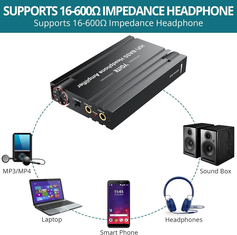 Professional 16-600Ω Headphone Amplifier with Bass Boost, Portable HiFi Earph...