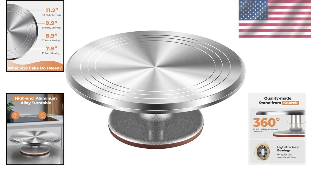 Professional Cake Decorating Turntable ‹ › ‹ › ‹ › ‹ › ‹ › ‹ › ‹ › ‹ › Professional Cake Decorating Turntable Features: Heavy-duty Construction: Crafted from durable ALUMINUM ALLOY, renowned for its strength and reliability, capable of withstanding frequent use. Smooth Rotation: Built-in hidden ball bearings ensure a fluid 360° rotation in either direction, catering to both left-handed and right-handed decorators. Non-slip Surface: Features a 12-inch non-slip surface and rubber feet to keep your cake firmly in place, providing stability during decorating. Guiding Lines: Equipped with guiding lines for accurate placement of cakes or cake boards, enhancing your decorating precision. Versatile Tool: Perfect for baking classes, cake decorating workshops, and as a thoughtful gift for various occasions. Easy to Use & Clean: Effortless to clean after use, compatible with a variety of decorating tools (not included) for creating exquisite cakes and desserts. Benefits: Guarantees longevity and consistent performance for all your baking needs. Ensures ease of use with its smooth rotation and non-slip surface, raising your decorating game. Ideal for family bonding time or creative baking classes, enriching relationships through shared experiences. Enhances your cake designing skills as you practice and perfect your techniques. Effortlessly create stunning cakes that will impress at any gathering or celebration. Why choose our Professional Cake Decorating Turntable? Transform your cake decorating experience with a turntable that combines strength, stability, and ease of use. Made from high-quality aluminum alloy, it ensures long-lasting durability, while the innovative design with ball bearings allows for smooth and controlled rotations. This versatile baking tool not only simplifies the process of decorating but also enhances the joy of creativity and the art of cake making. Whether you’re a seasoned baker or just starting out, this is the perfect addition to your kitchen, offering both functionality and elegance. Experience perfection in your baking endeavors and create memories that last by crafting stunning desserts with ease. Order your Professional Cake Decorating Turntable today and elevate your baking journey to new heights! Shipping Free & Fast Shipping - We offer free shipping to most of the USA with a normal delivery time of 3-10 business days. However, due to various situations, additional delivery time (up to 3 weeks) may be required for some items. Alternative Carriers - We may use alternative carriers (e.g. USPS, FedEx, UPS, etc.) to ensure your package arrives safely and on time. Due to the use of multiple carriers, we are unable to provide a tracking number automatically. Handling Time - Orders are processed and shipped within 1-5 business days of receiving cleared payment. Shipping Restrictions - Shipping to Alaska, Hawaii, Puerto Rico, Guam, and other US territories may incur shipping charges or delivery restrictions. Please contact us before ordering, or your order can be refunded/cancelled. State Restrictions - There may be restrictions based on your state of purchase. For example, certain items may not be shipped to California due to state regulations. Contact for Tracking Updates - If you require tracking updates or have any concerns about the delivery of your order, please feel free to contact us, and we will be happy to assist you. Return 30-Day Hassle-Free Returns - We want you to be completely satisfied with your purchase. If you are not, you can return the item within 30 days of receiving it for a full refund or exchange. Easy Return Process - To start a return, simply contact us and we will provide you with a prepaid return shipping label and detailed instructions. Restocking Fee - There are no restocking fees for returns. However, the buyer is responsible for return shipping costs if the return is not due to a seller's error. Refund Processing Time - Refunds will be processed within 5 business days of receiving the returned item in its condition. Payment We accept all major credit cards, PayPal, and Apple Pay for your convenience. Your payment information is secure and encrypted to ensure a safe and seamless transaction. Please complete your payment within 3 days of purchase to avoid any delays in shipping. Feedback Your feedback is extremely important to us. We strive to provide the best products and customer service possible. If you are satisfied with your purchase, please take a moment to leave us a positive review. If you have any concerns or issues with your order, please contact us before leaving negative feedback. We are committed to resolving any problems and ensuring your satisfaction. Contact Us If you have any questions or concerns, please feel free to out to our customer support team. You can contact us through the eBay messaging system. We are available Monday to Friday, 9:00 am to 5:00 pm EST, and we will do our best to respond to your inquiry within 24 hours. Buy it now and enjoy a pleasant shopping experience! Unit Quantity: 12 Material: Aluminum,Aluminum Alloy Features: Rotating,Non-slip,Smooth Rotation,Guiding lines for positioning Occasion: All Occasions,Mother's Day,Wedding,Parties Type: Cake Stand Color: Silver Finish: Brushed Number of Tiers: 1 Shape: Round Style: Modern Item Diameter: 12 in Item Depth: 3.77 in Item Weight: 5.19 lb Care Instructions: Easy to Clean