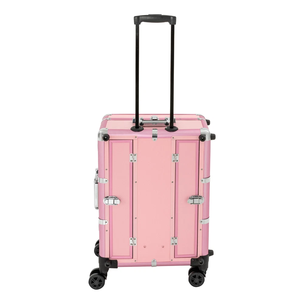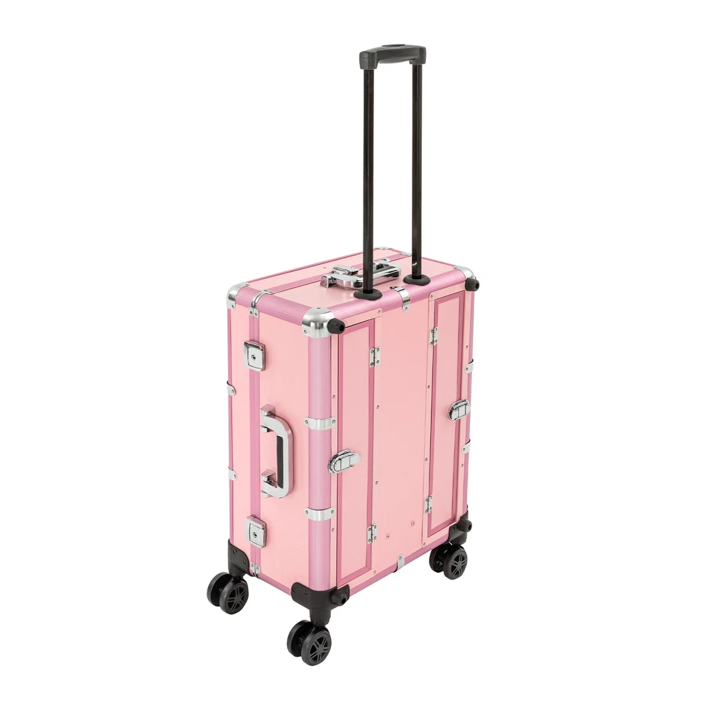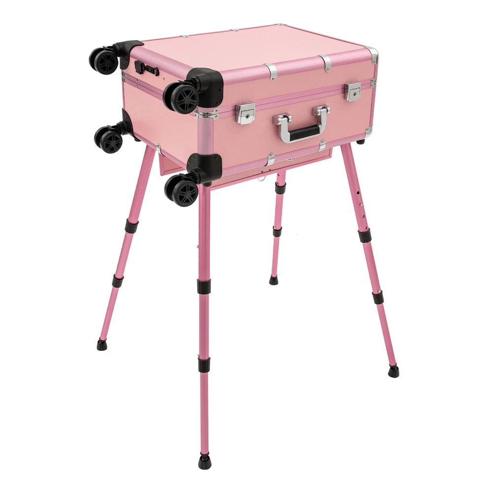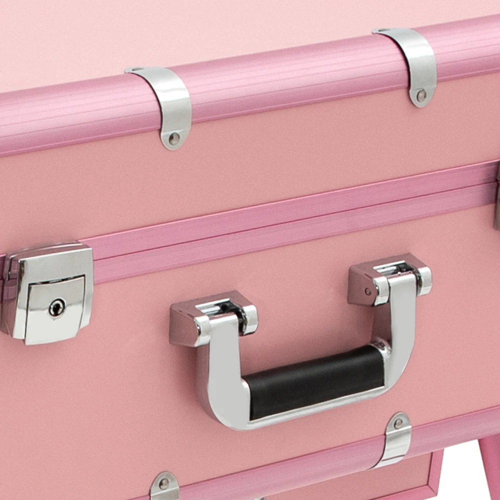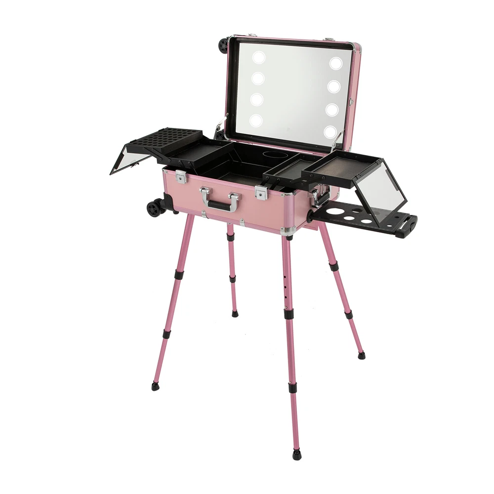 Professional Cosmetic Travel Case Vanity Organizer Rolling Makeup Train Case Box Professional Cosmetic Travel Case Vanity Organizer Rolling Makeup Train Case Description If you are a make-up artist and embroiderer who often needs to go out to work, you will need our makeup train case, combining the suitcase with the four legs, which is very convenient. Our makeup train case with high durability, 4 universal wheels, a large capacity, built-in LED 3-color lights, and a chargeable design will be your excellent makeup assistant when outgoing. Key Features Long Service Life: With the high-quality aluminum alloy and decorative high-pressure laminate, this product is anti-corrosion, flame-resistant , and rustproof and is not easily deformed, thus ensuring a long service life. Large Capacity: The 3-tier design with 5 collapsible&detachable inner boxes and a makeup brush holder can orderly sort and store your makeup/tools while well protecting them from scratches because of PU&MDF lining. And the retractable side tray can hold your hairdryer, flat iron, curling iron, etc. Excellent Load-bearing Capacity: The four supporting feet at the bottom and the aluminum alloy frame provide the make-up case with a maximum weight-bearing capacity of 110.23 lbs. You can place all kinds of hairdressing and beauty tools on it with confidence. Professional Make-up Assistant: The 8 LED lights(each 2.17" in diameter) with adjustable brightness and 3 light colors(warm, natural, and cold light) provide an ideal view for your different makeup needs without worrying about unwanted glare/shadows while protecting your eyes, together with the high-transparency resin mirror, helping you achieve flawless professional makeup. You can long press the button on the mirror to adjust the brightness and short press it to change the light color. Adjustable Height: With the 4-gear height adjustable quadripod(32.3 inches), you can find the height that suits you best to have enjoyable makeup without back pain . Built-in Retractable Quardipod: The built-in retractable quardipod can be stretched when needed or folded when not in use, enabling quick switching between the two usage modes without disassembly. The adjustable foot pads of the quardipod adapt to uneven ground. Thoughtful Design: The 12V rechargeable jack, external power supply jack, and power jack with a dustproof cover on the case will bring more convenience to your operation. Stylish Appearance: The rectangular frame with simple&elegant lines and lively pink embellished with a little black&silver gives this product a stylish look, which is a brilliant view when you are carrying it outside. Ideal Gift: Its exquisite design and large capacity make this product a great gift to your mother, girlfriend, sisters, wife, and loved ones. They would be fond of it. Easy to Move&Carry: The 4 nylon universal wheels ensure silent and smooth rolling and its detachable design allows for convenient replacement. Along with the telescopic pull rod and 2 comfortable handles, you can carry this product with less effort. Protective Shipping: In order to prevent the product from being damaged and bumped during transportation, we fill the package with anti-collision foam to protect your products to the maximum extent possible. Specifications Alloy Cladding Corners: The alloy cladding corners with a round design can not only protect your case from Verdana but also better care for your skin. Flat Built-in Bulb: This design makes the bulbs not easy to break. When the case is closed, it does not occupy the interior space of the case. Non-slip Feet: The non-slip feet enhance the stability of the product without slipping and bring you a better user experience. Clear Inner Box Lid: The clear inner box lid with a latch lock allows you to view the inside items and avoids them from falling. Locks and Latch: The two locks on the side and the latch on the top are solid and durable to effectively protect the inside items from losing. Application Professional makeup artists, hairdressers, beauticians, manicurists, beauty lovers, etc. can use this product to store cosmetics and makeup tools. It is ideal for makeup contests, wedding makeup scenarios, travel makeup, outdoor shooting, cinemas, dressing rooms, crew, tourism, beauty salons, and more. How to Use 1. Open the bottom plate buckle. 2. Extract the quardipod and clamp it in place. 3. Adjust the suitable length. 4. Place the product upright. 5. Open the box. 6. Open the lock inside the box and pull out the small box inside. 7. Connect the power supply as needed and start using it. Specification Color: Pink Shape: Rectangular Material: Aluminum Alloy, Decorative High-pressure Laminate, Resin Wheel Material: Nylon Surface Treatment: Oxidation Plug: US Standard Mounting Type: Free Standing Light Color Type: Warm Light, Neutral Light, Cold Light Number of Wheels: 4 Voltage: 12V Bulb Type: 8*5W LED Bulbs (Included) Max. Load-bearing Capacity: 50kg/110.23lbs Gross Weight: 14kg/30.86lbs Net Weight: 12kg/26.46lbs Each Light Source Diameter: 5.5cm/2.17inch Mirror Size(L*W): 49*36cm/19.3*14inch Each Tray Size: 16.5*26.5*3cm/6.5*10.4*1.2inch Top Cover Size(L*W): 52*40cm/20.5*15.7inch Overall Height: 133cm/52.4inch Supporting Leg Max. Height: 82cm/32.3inch Tray Distance From Floor: 96cm/37.8in Package Size: 67.5*51*29cm/26.57*20.08*11.42inch Package Included 1 x Makeup Train Case 2 x Power Cords 1x USB Cable 2 x Keys Notes Please do not use high-voltage plugs as they may burn out the product. This product is an 8-light model without audio and Bluetooth functions. The support legs need to be tightened slightly before being supported. The service wear of the case is a normal phenomenon. In the process of daily use, please try to avoid excessive Verdana and drop to extend the lifespan of the product. Please use soft tools and water to clean. Please keep away from corrosive liquids. Please avoid long-term exposure to the sun. Please clear the wheels in time to maintain smoo