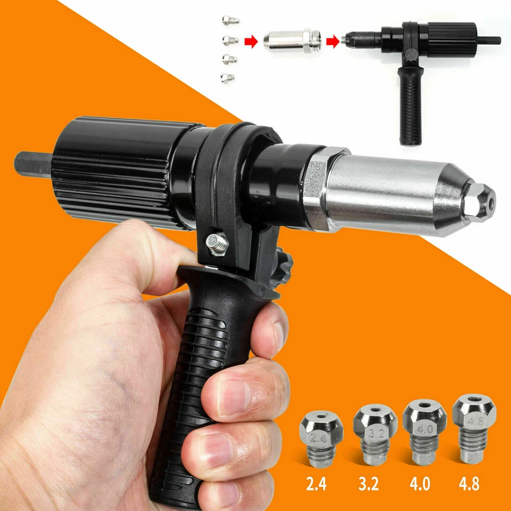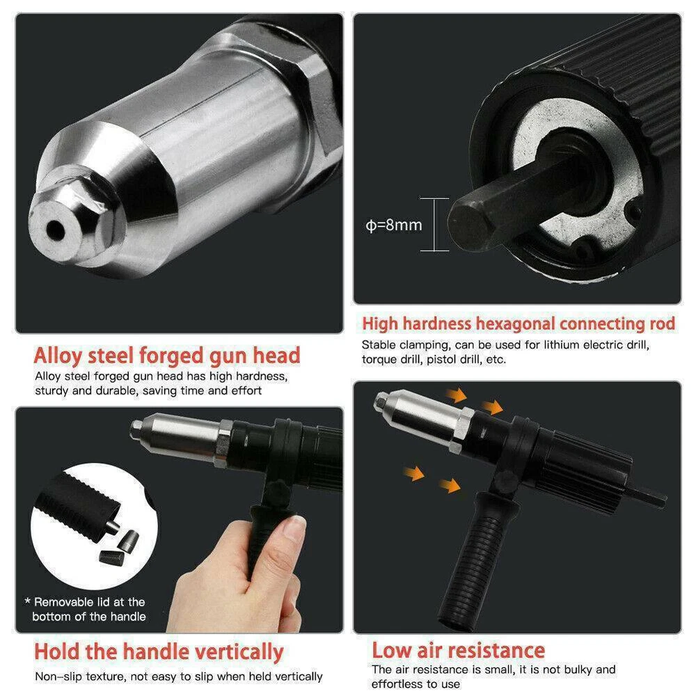 Features: 100% brand new and high quality. The adapter tap screw is connected to the electric drill,and the electric rivet gun is quickly transformed.It is easy to install. Alloy steel forged pipe head,durable. Light and portable and riveting smoothly and firmly. Pulling rivet quickly, not easy to skid. Wide range of applications:production of doors and windows,electrical air conditioners,riveting of aluminum alloys,automobile manufacturing and production,etc. Specifications: Type:Rivet Gun Adaptor Color: Black Material:metal Size:Rivet gun adaptor length 173mm Package included: 1x rivet gun adaptor 1x handle 1x wrench 4x rivet head (Only the above package content, other products are not included.) Note: Light shooting and different displays may cause the color of the item in the picture a little different from the real thing. The measurement allowed error is +/- 1-3cm.
