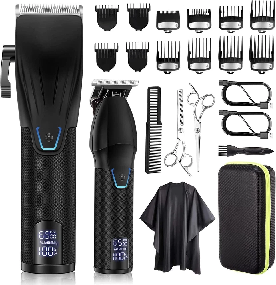 COMPLETE MENS GROOMING KIT: This professional hair cutting kit features a full size hair clipper with 8 metal guide combs, a detailed hair trimmer with 4 guide combs, EVA storage case, 2 scissors, cleaning brush, barber comb,cape, 2 charging cables. Suttik complete hair clippers set has everything you need for a successful haircut at home or salon. SMOOTH CUT: Suttik hair clippers adopts self-sharpening precision ground blades that can cut through all hair types and stay sharp longer. This clippers and trimmers set with powerful heavy duty motor is available in a variety of styles to meet your home hair cutting and personalized needs. BATTERY LIFE & LCD DISPLAY: Built-in rechargeable large capacity and premium battery, the hair clipper can work for 150 minutes after 2.5 hours charging, the hair trimmer can work for 180 minutes after 2.5 hours charging. Incorporated LCD screen displays the battery status and rotational speed. DETAIL TRIMMER: This hair trimmer is equipped with a precision T-shaped blade that can be near zero gapped distance. Ideal for cleaning up around necklines, sideburns and beard. CONVENIENT STORAGE: With this high quality EVA storage case, you can easily organize your barber tools after each haircut. Lightweight and compact to fit in your backpack, or luggage for improved traveling protection. 100% SATISFACTION GUARANTEE: Purchase our hair clipper with no-risk, any problems of our hair clipper set within 30 days, replacement or refund will be provided.Please contact us if you have any problem,we will surely provide you 100% satisfaction solution. Product Description Suttik Professional Hair Clippers and Trimmers Set Here is good news for you! Those who are stuck at home, can’t find a salon nearby, or who need a professional premium hair clippers set for barbers or anyone who want to cut hair by themselves. This Suttik professional cordless hair clippers set is a must have, it contains everything you need to have a professional cut right in the comfort of your own home or salon. This high-end hair clippers allow men to blend barbershop-quality taper fades easily as well as achieve a variety of cuts and styles. Warm Tips: Please switch off the hair clipper before charging and connect to the power supply Never charge the product above 104 degrees Fahrenheit heat source or below 32 degrees Fahrenheit environment. Only the professional are allowed to replace the battery with the same type if it is necessary. If the battery is completely used up, the indicator light will not light up immediately, but light up after a few minutes. Barber Clippers Professional Set: What will you get? 1*Hair Clipper (no oil) 1*Hair Trimmer 2*USB Charge Cable (no adapter) 12*Clipper Guards 1*Long Comb 1*Apron 2* Scissors 1*Storage Carrying Case 1*Cleaning Brush Specification: Power: 10W Cordless: Yes Charging Time for Hair Clipper: 3 hours Working Time for Hair Clipper: 2.5 hours Charging Time for Hair Trimmer: 3 hours Working Time for Hair Trimmer: 3 hours 4 Speed Option for Hair Clipper: 5000-6500 RPM 3 Speed Option for Hair Trimmer: 5500-6500 RPM Professional Hair Clippers for Barber This complete barber clippers and trimmers set meets all your styling needs, you can easily create a variety of fashion hairstyles. Sharp Carbon Steel Blade Designed with a high quality carbon steel blade, this sharp & durable head will offer you fast, smooth, and precise hair cutting. Excellent Battery Performance Cordless hair clipper is equipped with a rechargeable battery, that gives you 2.5 hours of non-stop operational capacity when fully charged. EVA Storage Carrying Case Barber clippers case made of premium EVA material, with good shock resistance and waterproof. It provides a full range of protection for haircut kit. Smart LCD Display Incorporated built-in digital display to show the remaining power as well as charging status and rotational speed indicators. USB Universal Charging The rechargeable clipper has a long-lasting battery life and can be charged by USB or adapters for ultimate convenience.