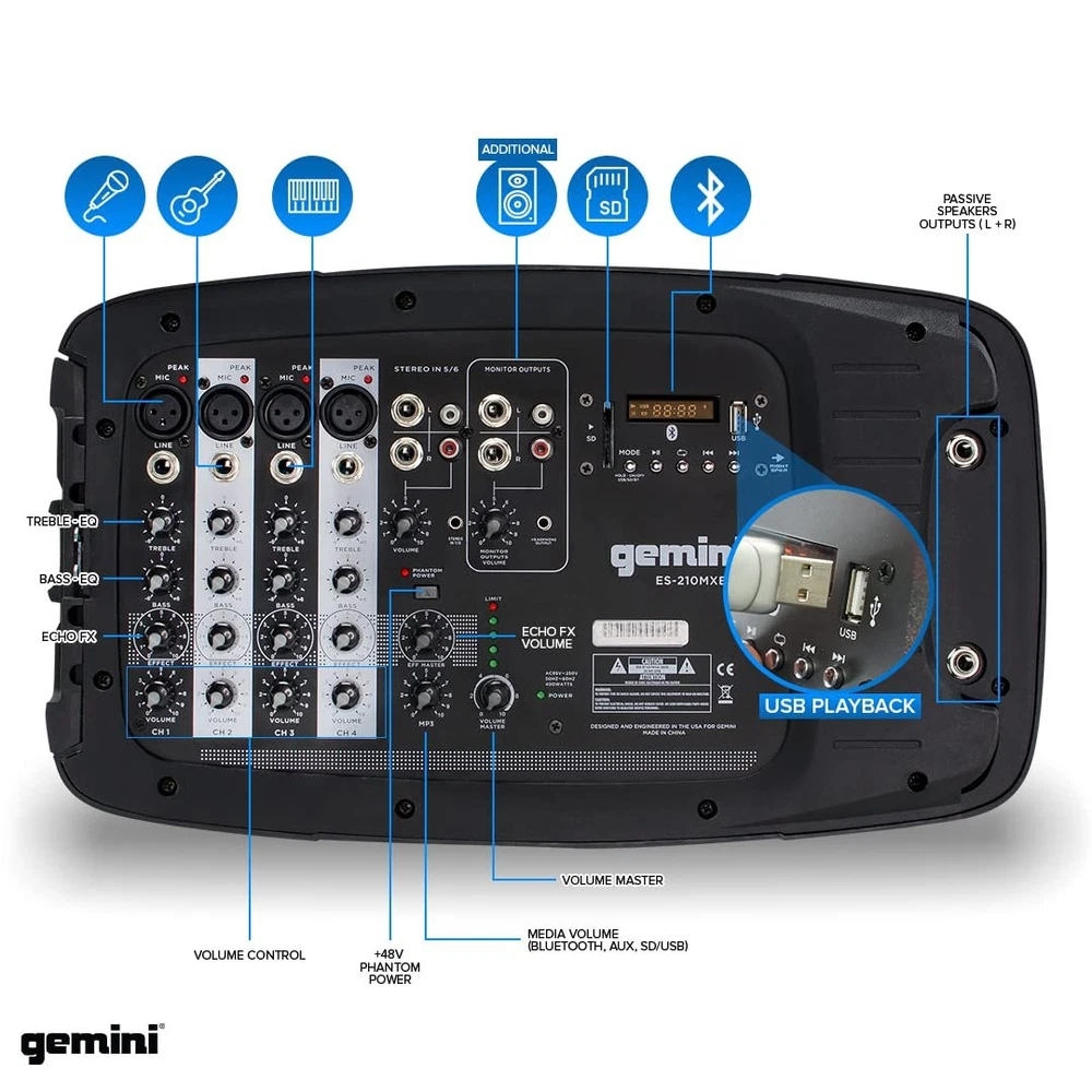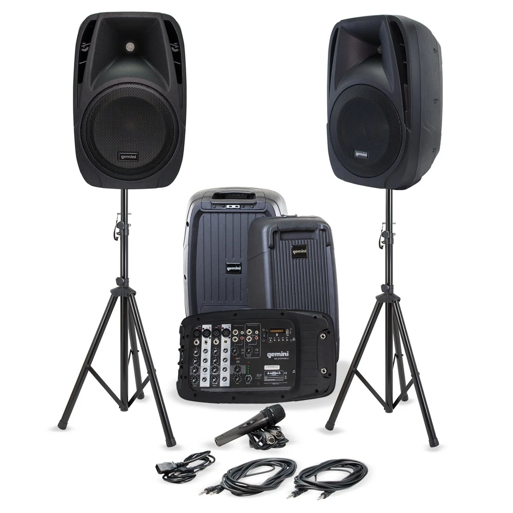 Professional PA System with 8-Channel Mixer - Gemini Sound Portable Dual 10" Speakers, 600W Amp, Bluetooth, USB/SD, Includes 2 Speaker Stands, Mic, and Durable Design for DJs, Musicians, and Events HIGH-QUALITY SOUND ENGINEERING: Experience exceptional audio with the system's 600W peak Class D amplifier and dual 10" woofers. Each note and vocal is projected with crystal-clear quality, making it ideal for DJs, musicians, and podcasters who demand superior sound in their performances and recordings. ADVANCED CONNECTIVITY OPTIONS: Stream your music effortlessly with integrated Bluetooth technology. The system also offers USB and SD card inputs for versatile playback options. Perfect for quickly connecting your devices and immersing yourself in a seamless audio experience, whether at a gig or recording a podcast. CUSTOMIZABLE 6-CHANNEL MIXER: Tailor your sound to perfection with the built-in mixer. It offers individual bass, treble, and volume adjustments, along with integrated digital echo effects, enabling you to fine-tune your audio with precision. This feature is a boon for both beginners and experienced audio enthusiasts, providing the flexibility needed for a range of scenarios. ROBUST AND PORTABLE DESIGN: Designed for the active performer, this PA system combines durability with portability. Its rugged construction ensures it stands up to the rigors of the road, while the ergonomic handles facilitate easy transport. Whether moving from gig to gig or setting up for a local event, this system is built to travel. VERSATILE PERFORMANCE APPLICATIONS: Not just for music, this system excels in a variety of settings - from enhancing live band performances to public speaking at conferences. Its adaptability makes it suitable for indoor and outdoor events, ensuring top-notch sound quality wherever you need it.