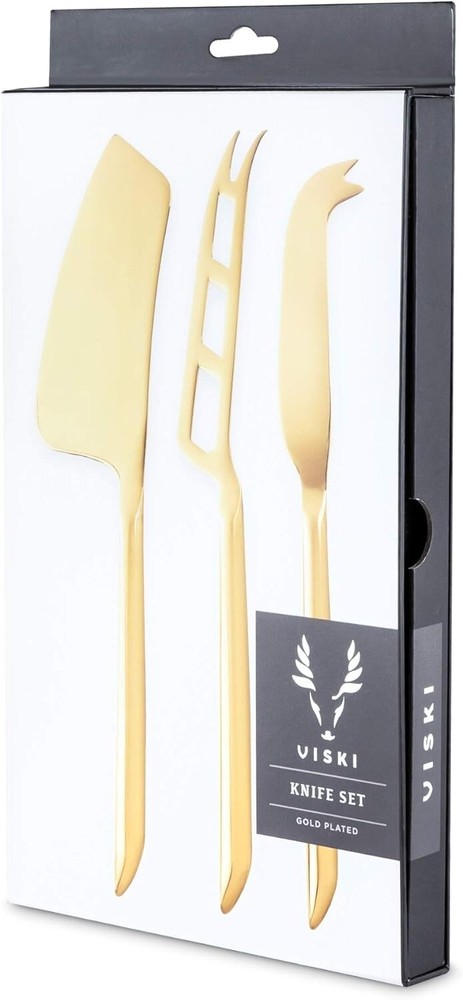This professional-quality 3-piece gold cheese knife set is an ideal housewarming gift for adults. The set includes a knife, cheese knife, fork-tipped spear knife, soft cheese spreader, and mini-cleaver, all made of stainless steel with a gold finish. The set features forged construction and a modern style, with a glossy finish. It is dishwasher safe, but hand washing is recommended for care. This set is perfect for serving cheese and makes for a stylish addition to any kitchen or dining collection.