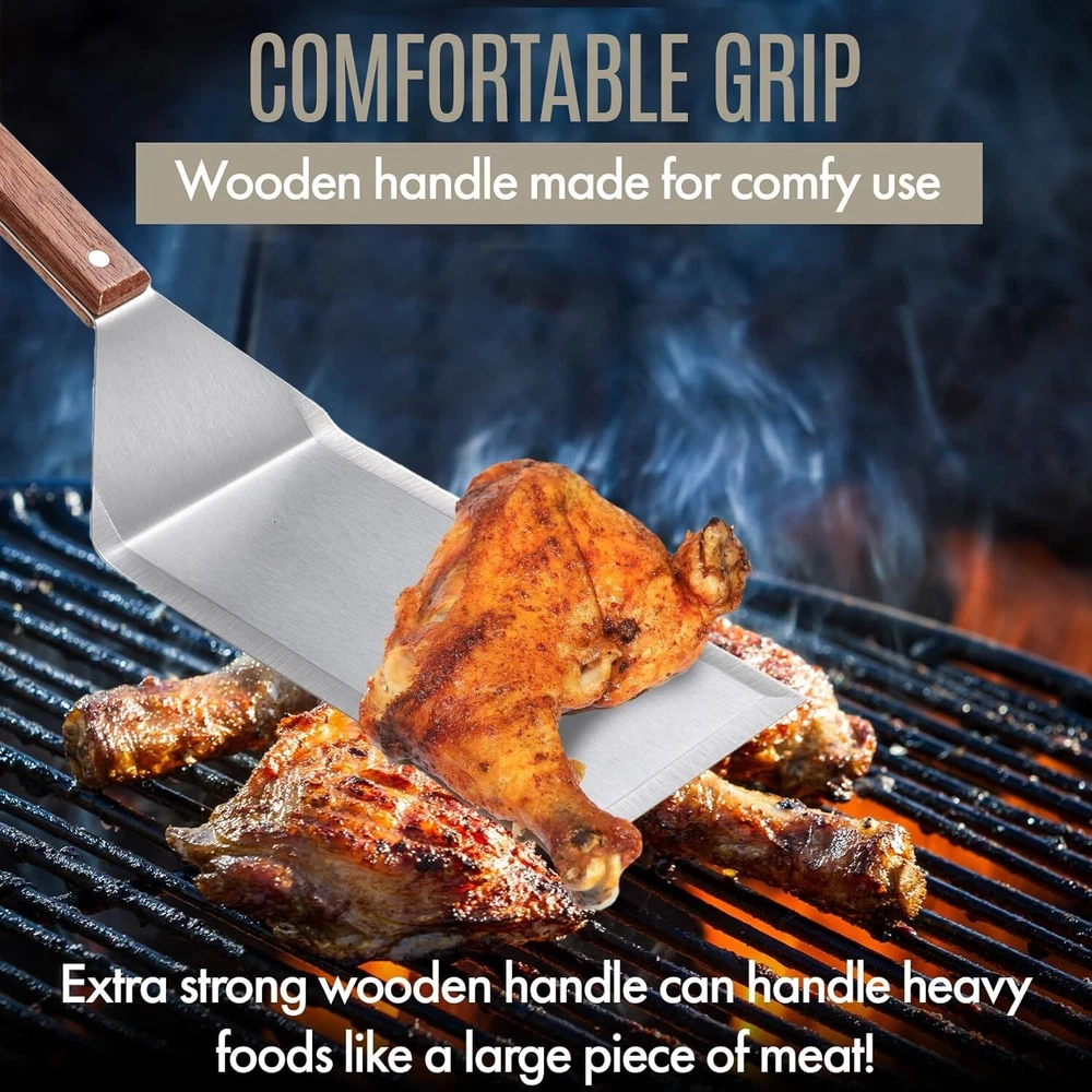 Professional Stainless Steel Grill Spatula with Wood Handle for Skillets, Thick Stainless Steel Blade Griddles & Pancake Flipper for Burgers, Omelet, and Versatile for Culinary Task, 8 x 4 inches ✅ SUPERIOR QUALITY: Stainless steel spatulas are sturdy and great for tasks that require strength, such as flipping pancakes or burgers on a grill. However, they are not flexible like silicone or rubber spatulas. Our wide meat spatula features an 8 x 4-inch flipper to offer ample space for holding more food at once, making it an excellent choice for professional and home use. ✅HEAVY-DUTY STAINLESS STEEL & WOODEN: This wide spatula is stainless steel and features an ergonomically designed wooden handle. The smooth silicone surface and flexible edges of our spatulas make them perfect for scraping, mixing, and spreading. Whether you're flipping pancakes, scrambling eggs, or sautéing veggies, these spatulas will glide effortlessly over any surface without scratching your cookware. ✅BEVELLED-EDGE AND SAFE TO USE DESIGN: This stainless-steel wide spatula with a wooden handle comfortably fits your hand for balance control. The sharp, beveled edge of this grilling spatula helps stir food more efficiently without bending or breaking. This innovative feature allows for precise scraping and effortless flipping, ensuring you get every last bit of food from your cookware without scratching or damaging its surface. ✅DURABLE AND MULTIFUNCTIONAL: Our spatula turner is a versatile kitchen companion. Perfect for grilling, BBQ, and as a griddle accessory for cast iron or flat-top cooking. The beveled edges of our oversized spatula seamlessly slide for quick and easy flipping of a burger, cutting pizza, or serving meat and cakes. Whether you're a grilling novice or a seasoned professional, this spatula is the ideal griddle grilling accessory for backyard BBQs and more. ✅PRACTICAL & IDEAL GIFT OPTION: Whether you're shopping for a culinary enthusiast or upgrading your own kitchen tool. 's metal spatula makes an excellent gift idea for a Birthday, Graduation, Anniversary, Holiday, Father’s Day, Housewarming, and so much more. This wide spatula for grills is dishwasher-safe and features hooks for hanging, storing, and drying. offset flat diner griddle rib grilling