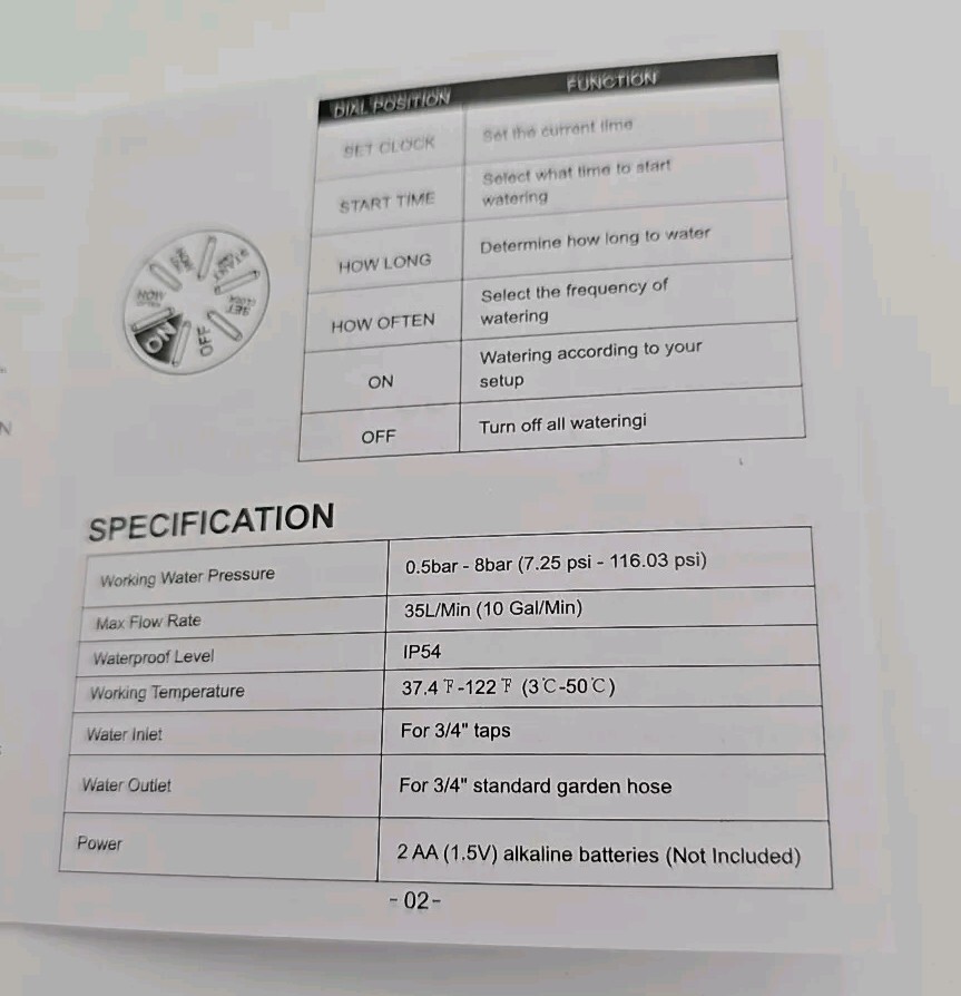 Type:Sprinkler TimerManufacturer Warranty:naBattery Type:2x 1.5 V AA Batteries (Not Included)Brand:Unbrandedgtin13:Does not applyIndoor/Outdoor:OutdoorNumber of Zones:1MPN:Does Not ApplyWatering Duration:naUPC:Does not applyPower Source:BatterySet Includes:FittingsThreaded Connection:naFeatures:LC-DisplayWatering Frequency:naNumber of Watering Programs:1Model:naSuitable For:Lawn IrrigationNumber of Outlets:1