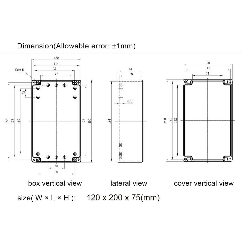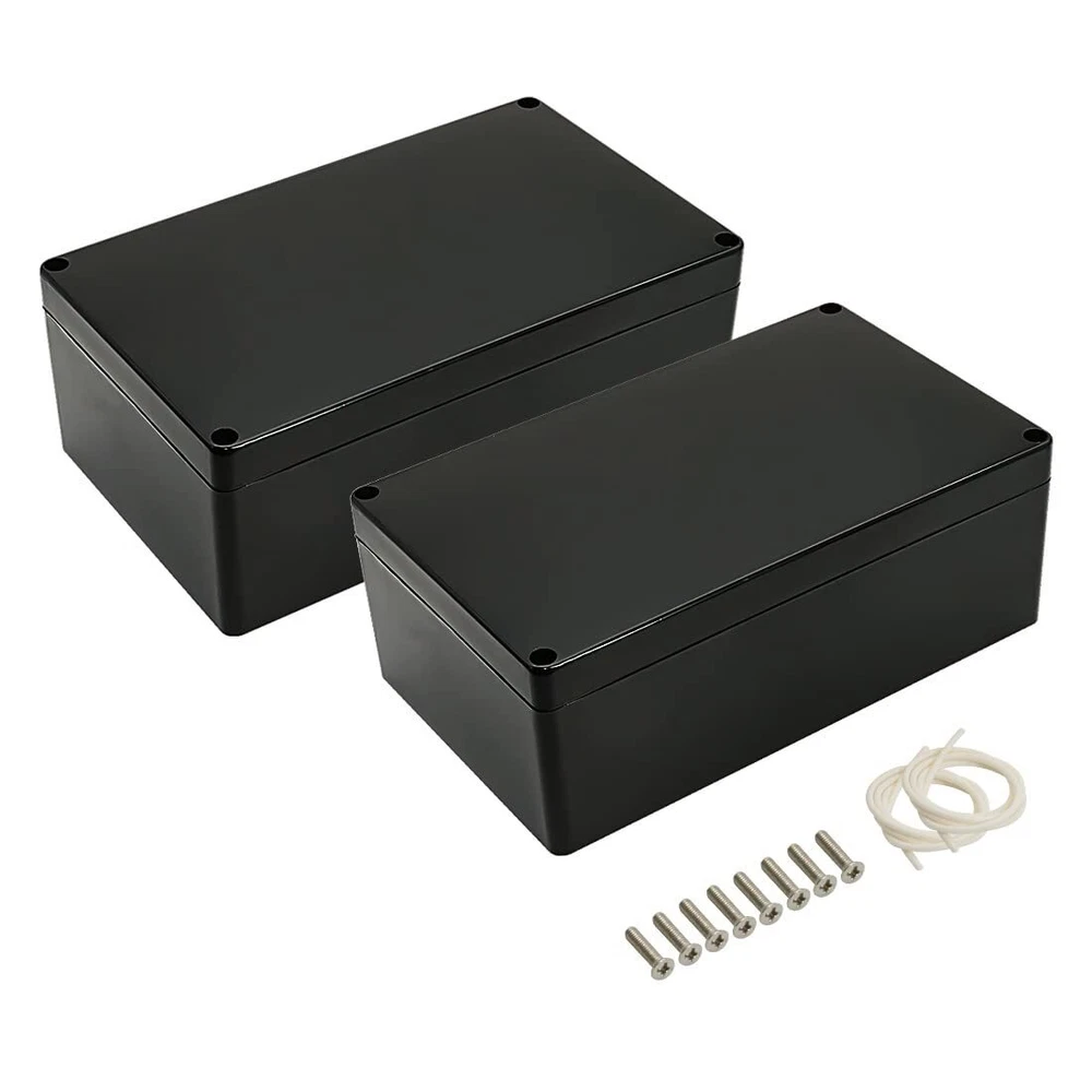 Junction box IP65 Waterproof: project box is designed to provide protection against moisture, water, and dust.Equipped with rubber grommet sealing tightly to ensure electrical components dry and effective in wet or harsh environments. High-quality Material: ABS plastic junction boxes are able to withstand impact, heat, and various weather conditions. Lightweight and durability make them easy to drill, modify and serve for long time. Versatile Enclosure: These electrical boxes are well-suited for indoor and outdoor LED displays, control panels, solar power systems,surveillance cameras, security systems etc. Also a convenient solution for DIY projects and hobbyists. Outer Size: 7.87 x 4.72 x 2.95inch(200 x 120 x 75mm) ;Inner Size: 7.6 x 4.45 x 2.67inch(193 x 113 x 68mm) - - *Tips: in order to confirm the detailed installation dimensions, please refer to our detail image, which shows specific internal dimensions of the product. (Allowable Error: 2mm),Thickness: 0.12in/3mm Package Content: 2 x Junction Box; 2 x Rubber Grommet; 4 x Metal Screws each