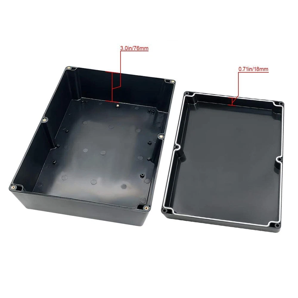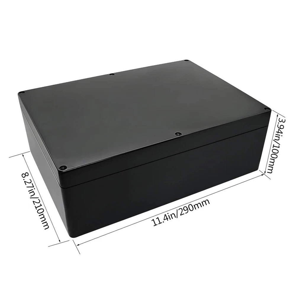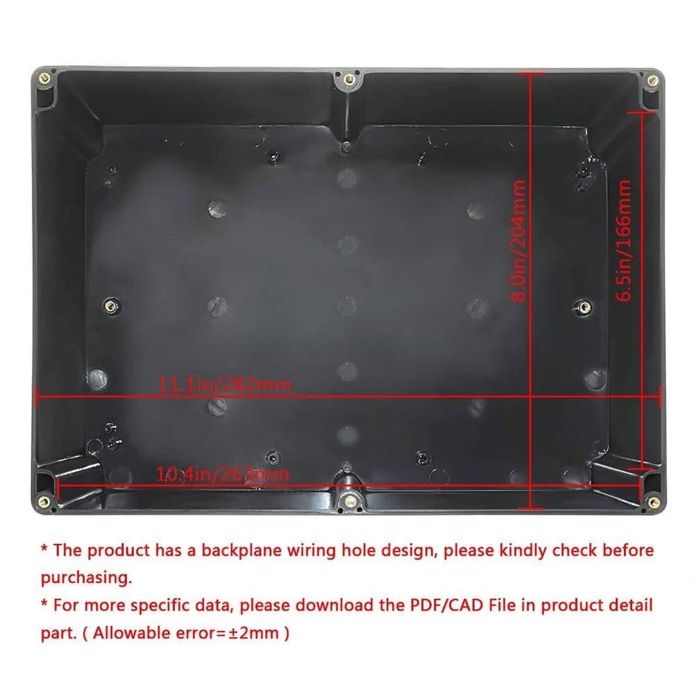 Description: This ABS project box brings a better customizable experience. 1.Made of ABS material. Sturdy and terrific for making those DIY projects. Easy to drill and shape openings for many items like meters, sockets, LEDs and so on. 2.Many screw holes inside in various places. If wanted to make one to go in it, such as attaching a board, there would be no problem mounting it. 3.100% brand new and high quality. Specifications: Product Name: Junction Box Outer Size of the project box(Approx.): 11.41" x 8.26" x 3.93" (290 x 210 x 100 mm) Inner Size of the project box(Approx.): 11.1" x 8.1" x 3.7"(281 x 205 x 93mm)(L*W*H)- - (Allowable Error: 2mm) Main Color: White Main Material: ABS Waterproof Rating: IP65 Package Include: 1 x Junction Box 1 x Rubber Grommet 6 x Screws(Not Rustproof) IP65 Waterproof: project box is designed to provide protection against moisture, water, and dust.Equipped with rubber grommet sealing tightly to ensure electrical components dry and effective in wet or harsh environments. High-quality Material: ABS plastic junction boxes are able to withstand impact, heat, and various weather conditions. Lightweight and durability make them easy to drill, modify and serve for long time. Versatile Enclosure: These electrical boxes are well-suited for indoor and outdoor LED displays, control panels, solar power systems,surveillance cameras, security systems etc. Also a convenient solution for DIY projects and hobbyists. Outer Size of electrical enclosure:11.41" x 8.26" x 3.93" (290 x 210 x 100 mm); Inner Size of electrical enclosure: 11.1" x 8.1" x 3.7"(281 x 205 x 93mm)(L*W*H)- -*Tips: in order to confirm the detailed installation dimensions, please refer to our detail image, which shows specific internal dimensions of the product. (Allowable Error: ±2mm) Package Content: 1x Junction Box ; 1x Rubber grommet for cover; 6x Metal Screws