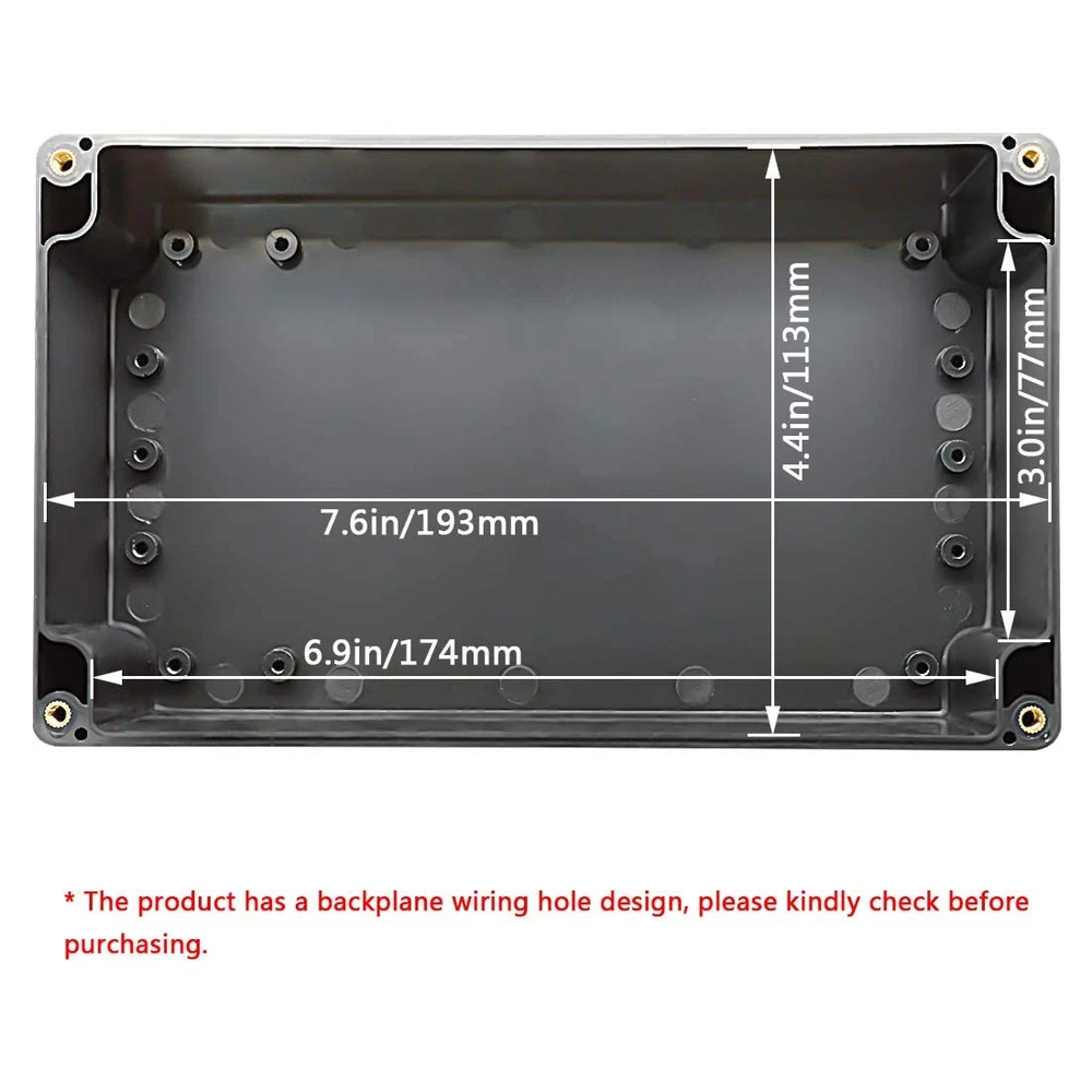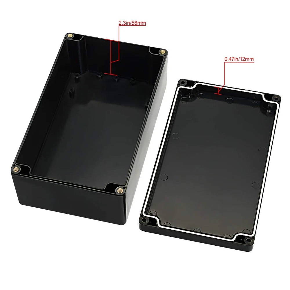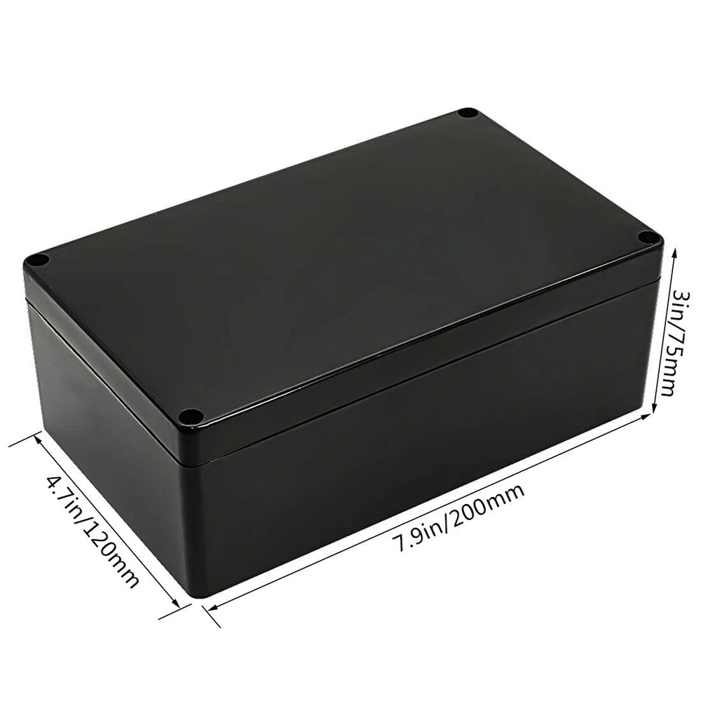 IP65 Waterproof: LeMotech project box is designed to provide protection against moisture, water, and dust.Equipped with rubber grommet sealing tightly to ensure electrical components dry and effective in wet or harsh environments. High-quality Material: ABS plastic junction boxes are able to withstand impact, heat, and various weather conditions. Lightweight and durability make them easy to drill, modify and serve for long time. Versatile Enclosure: These electrical boxes are well-suited for indoor and outdoor LED displays, control panels, solar power systems,surveillance cameras, security systems etc. Also a convenient solution for DIY projects and hobbyists. Outer Size:7.87x 4.72x 2.95inch(200 x 120 x 75mm);Inner Size: 7.6x 4.45x 2.67inch(193 x 113 x 68mm)- - *Tips: in order to confirm the detailed installation dimensions, please refer to our detail image, which shows specific internal dimensions of the product. (Allowable Error: 2mm),Thickness: 0.12in/3mm Package Content: 1 x Junction Box, 1 x Rubber Grommet ,4 x Metal Screws Product Description Dustproof & IP65 Waterproof Junction Box for Your DIY Projects IP65 Waterproof Keep components inside dry and safe. Not afraid of housing the project outdoor. Dustproof With rubber gasket to seal the whole box. Prevent dust or any dirt from causing damage to internal facilities. Shock Resistance Durable and Sturdy box is the base of everything. It is made of ABS plastic and has a better serve time. Multiple Applications Designed to hide, preserve and shield your various sockets, plug-ins, power cords and other vulnerable equipment from the effects of various environment. LeMotech is dedicate to offer project boxes to protect all the electronics inside them for customers' excellent ideas. Black ABS Plastic Junction Box Coming with one IP65 waterproof black project box and 4 screws. Waterproof Rubber Gasket Rubber gasket is waterproof and dustproof. Will do a better job to keep your electronic projects in a clean and dry environment. Backplane Wiring Hole Inside with backplane wiring hole to be more convenient to install circuit board, DIN rail or panel. Copper Nut Copper screw hole to make sure the box can have a better sealing.