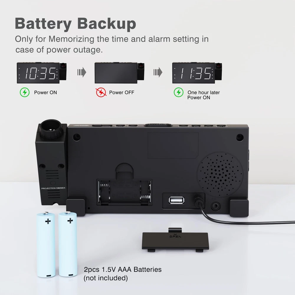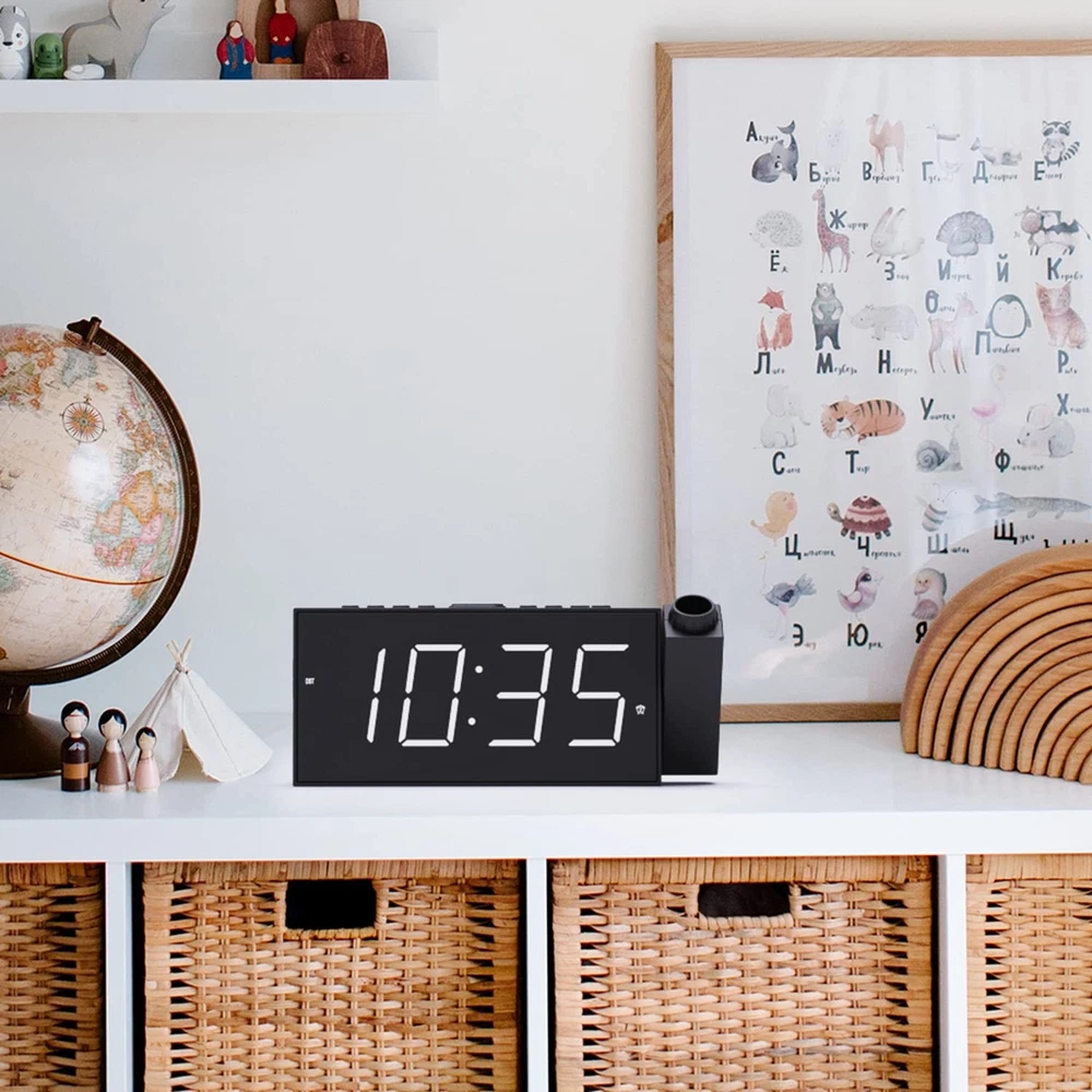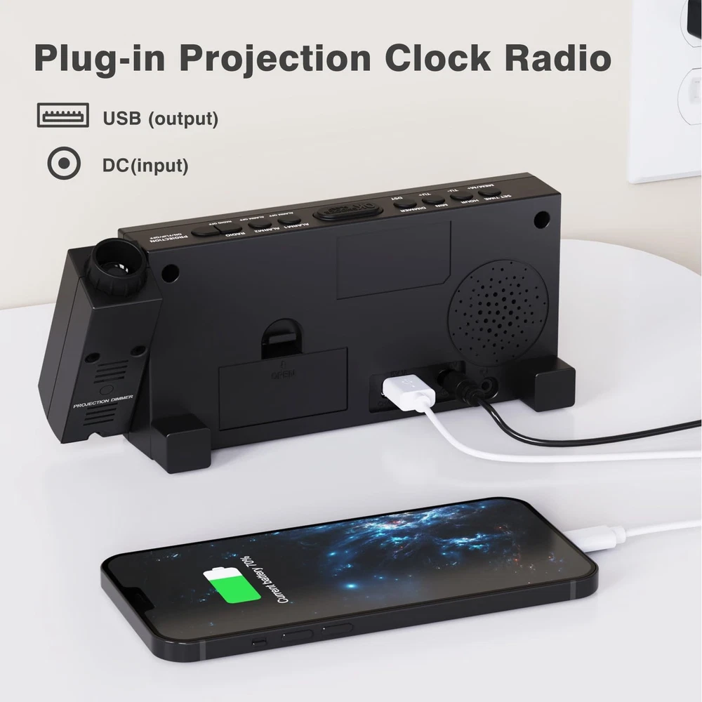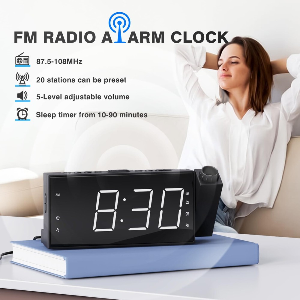 Project time on wall or ceiling With 350-degree swivel,this clock projects the time right onto your wall or ceiling for easy,stress free viewing - all you have to do is open your eyes.Turn on or off as needed. The best thing is that you can project the time really easy.Just repeatedly press โProjectionโbutton and it will appear vividly on your wall. Not Too Faint,Not Too Bright--Just Right Optional 5 brightness settings ensure you can easily read the display during the day or night, without being distracted while trying to fall asleep. Auto/Manual Scan FM Radio Built-in FM tuner lets you choose from a wide variety of radio, talk, and music programming. allow you to Preset 20 radio stations you can turn on your favorite radio programs next time without extra manual selection. Charge While You Listen--or While You Sleep Your iPad, iPhone and your smartphone will charge while docked to help you avoid a drained battery,whether you're listening or not.Wake up with a smile and your mobile devices always fully charged! Important: Q:What should I do if this projection numbers on the ceiling is fuzzy? A:Please rotate the focus ring for proper angle to adjust it from fuzzy image to be clear as you desire. Q:Why projection time is reversed? A:please press the PROJECTION button once again to flip the projection Q:How to turn off the alarm? when alarm sounds: Press once ALARM OFF button to turn off alarm today To cancel alarm, hold press ALARM OFF button until the alarm icon disappear from the display ๐๐๐ ๐๐น๐ผ๐ฐ๐ธ ๐ฅ๐ฎ๐ฑ๐ถ๐ผ ๐๐ถ๐๐ต ๐ฎ๐ฌ ๐ฃ๐ฟ๐ฒ๐๐ฒ๐ ๐ฆ๐๐ฎ๐๐ถ๐ผ๐ป๐ ๐ฎ๐ป๐ฑ ๐๐ฑ๐ท๐๐๐๐ฎ๐ฏ๐น๐ฒ ๐๐ผ๐น๐๐บ๐ฒ--Enjoy a digital FM radio on this clock radio with 20 preset stations (87.5โ108 MHz). Whether you love music, talk shows, or need traffic updates, this radio alarm clock has you covered. Convenient side volume buttons make it easy to adjust the sound to your ideal level. ๐ ๐๐น๐ฒ๐ฎ๐ฟ ๐ง๐ถ๐บ๐ฒ ๐ฃ๐ฟ๐ผ๐ท๐ฒ๐ฐ๐๐ถ๐ผ๐ป--The 180ยฐ adjustable projector on this projection alarm clock allows you to project the time onto your wall or ceiling, so you can see it clearly even while lying in bed. You can rotate the projection, flip the orientation, and adjust the focus for a crisp and easy - to - read display. ๐ ๐๐ฎ๐ฟ๐ด๐ฒ, ๐๐ฎ๐๐ - ๐๐ผ - ๐ฅ๐ฒ๐ฎ๐ฑ ๐๐๐ ๐๐ถ๐๐ฝ๐น๐ฎ๐ ๐๐ถ๐๐ต ๐๐ฑ๐ท๐๐๐๐ฎ๐ฏ๐น๐ฒ ๐๐ฟ๐ถ๐ด๐ต๐๐ป๐ฒ๐๐--The 7 - inch ultra - large LED screen of this projection alarm clock makes it possible for you to see the time from a distance, without needing glasses or contacts. Plus, choose from 5 dimming levels to adjust the brightness for day or night use, creating a peaceful sleep environment. ๐ ๐๐๐ฎ๐น ๐๐น๐ฎ๐ฟ๐บ๐ ๐๐ถ๐๐ต ๐๐ถ๐ณ๐ณ๐ฒ๐ฟ๐ฒ๐ป๐ ๐ฆ๐ผ๐๐ป๐ฑ--Set two alarms on this radio alarm clock โ wake up to your choice of a buzzer or radio. With adjustable alarm volume levels (from level 1 to 5), including a super - loud 106dB setting for heavy sleepers, you won't miss your wake - up time again. Plus, the sleep timer option lets you set your radio on this clock radio to turn off automatically after 10 to 90 minutes. ๐ ๐ฃ๐ผ๐๐ฒ๐ฟ ๐๐ฎ๐ฐ๐ธ๐๐ฝ & ๐จ๐ฆ๐ ๐๐ต๐ฎ๐ฟ๐ด๐ถ๐ป๐ด--This projection alarm clock plugs into sockets for consistent power. Battery backup keeps your time, alarm, and radio settings saved during power outages. Additionally, the built - in USB charging port lets you charge your phone overnight โ wake up with your device powered. ๐ ๐ฃ๐ฒ๐ฎ๐ฐ๐ฒ ๐ผ๐ณ ๐ ๐ถ๐ป๐ฑ ๐๐๐ฎ๐ฟ๐ฎ๐ป๐๐ฒ๐ฒ๐ฑ โ one-year warranty, 30-day free return, and 24-hour customer support. Sleep better knowing weโre always here for you.