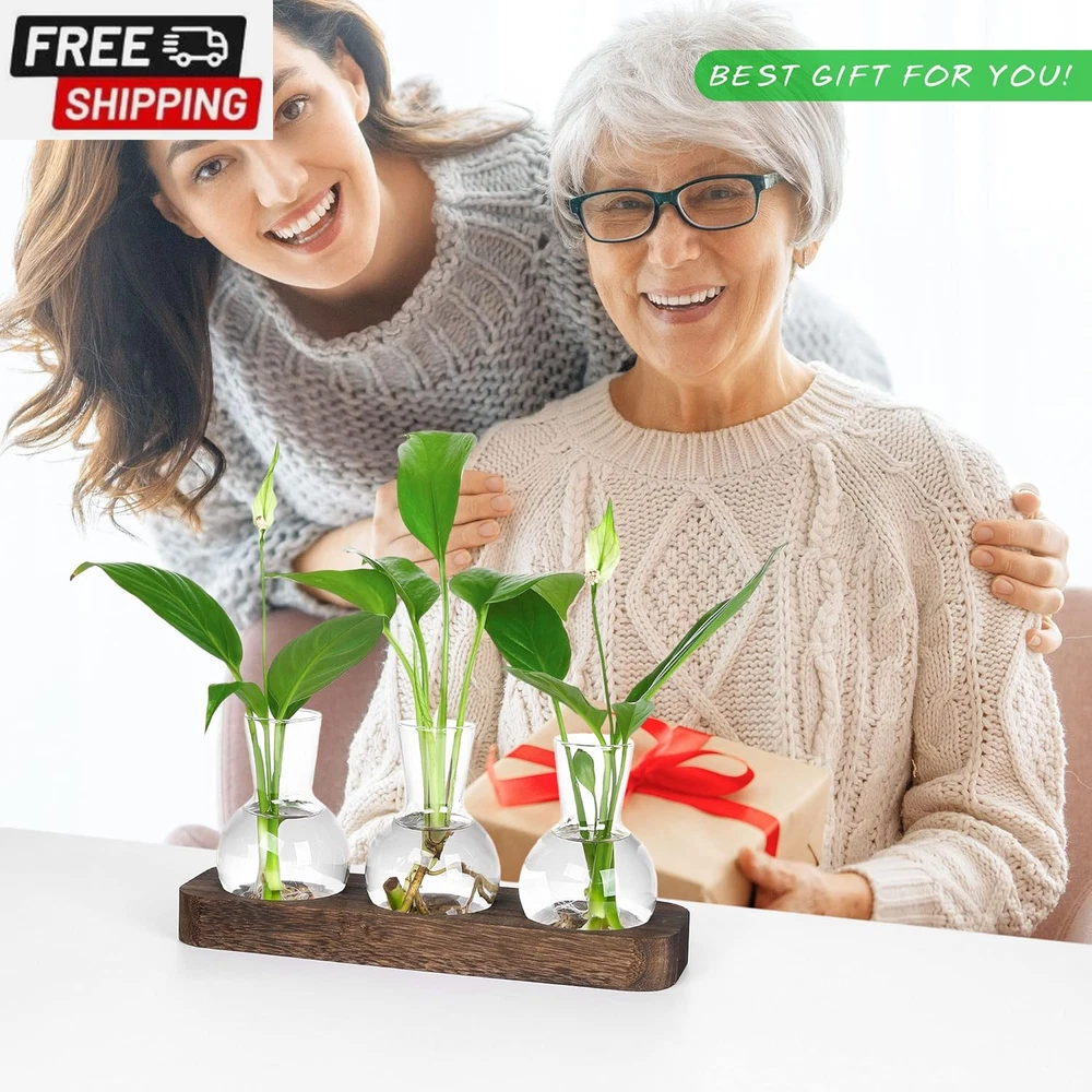 Propagation Stations,Plant Propagation Vase,Desk Plant Terrarium with Retro Wooden Stand,Plant Lover Gifts for Women for Hydroponics Plants Home Garden Wedding Decor(3 Vase) 【Plant Propagation Stations】This desktop propagation vases for plants is perfect for hydroponics, air plants, and flowers, and it also helps purify the air and create a relaxing atmosphere. Who likes plants and enjoy life will love it at a glance. 【Stylish Design】The groove design of the wooden tray is combined with a flat bottomed light bulb vase. Compared to other wall mounted bulb vases, it does not restrict plant growth and is easier to carry and exchange water. 【Retro Home Office Decor】Simple and elegant style plant propagation suit any style room. Add nice touch to your house, put it on window sill, coffee table, living room, ding room, kitchen, dormitory and bedroom. It will be more beautiful and eye-catching if you fill the bottle with colored water or some cobbles. 【Best gifts for women plant lovers】Mother's Day, birthday, Christmas, Valentine’s Day, Thanksgiving gift ideas. Nice present to your nature-loving, gardeners. Sweet wedding party, anniversary, and special occasions decoration gifts. 【Size】Wooden tray: 9.5'' L x 2.8'' W x 1'' H, Vase: 2.8"D x 3.9"H; Opening Diameter is 1.4". No need to install, can be used directly, the product should be placed in the no-sunlight to use.Note: Can not be placed in the sun! 【Service Guarantee】Customers First. We are responsible for any damage during transportation. If you have any questions, contact us through Amazon please. We will serve you wholeheartedly until you are satisfied. Product Description YIBOT Bring green into your life It really is cute,The glass is very clear and sit perfectly into the grooves in the wood base, which adds to the appeal, and the dark wood base has a rustic classiness to it. Gifts for Women This is an perfect desktop glass bulb vase for plant's propagations and cuttings, use to propagate baby plants. It is suitable for display fresh flower, hydroponics plants. Make a great gift for the plant-lover in your life. YIBOT Plants Propagation Stations Plant Terrarium With Wooden Stand Package Contents: 3x Glass Vase 1 x Wooden Tray 3 bottle wooden tray size: 9.5'' L x 2.8'' W x 1'' H Vase: 2.8"D x 4"H Material: Wood, Glass Note: No plants or other decorative objects included in this item! Note: Can not be placed in the sun! Best Gift for Plant lover Desktop Propagation station with retro style great for floral arrangement, home or office decoration as well as various gift ideas. Plant Gifts for Plant Lovers Women Best gifts for women plant lovers,suitable for various festivals such as: Mother's Day, birthday, Christmas, Valentine’s Day, Thanksgiving gift ideas. Shipping Fast shipping is very important for us. Our standard US shipping service is FREE. Your order will be shipped within 2-3 business days upon full payment received. Your order will be delivered within 2-3 business days after the handling time. We only ship to the confirmed PayPal address. We reserve the right to cancel any order for any reason at any time. We are not responsible for undeliverable addresses. Returns and payment We offer a 30 days return policy from checkout winning date. We allow only PayPal as payment method FeedBack Your feedback very important to us, after you get your package and you are satisfied with our service please leave us positive feedback If you have any problem with your order / any questions please before leave any type of feedback For any questions, using eBay contact system Please visit our eBay store to check out other items for sale! Thank you for shopping at our store.