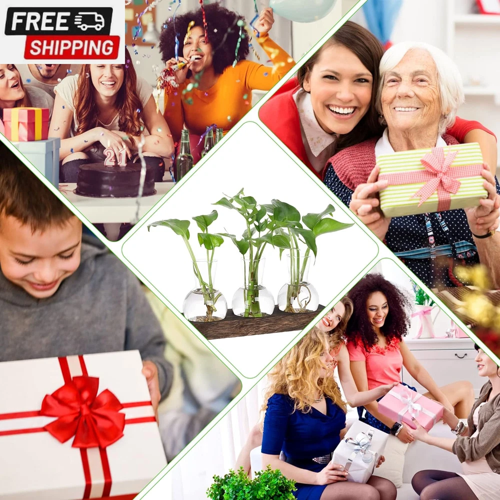 Propagation Stations,Plant Terrarium with Retro Wooden Stand,Unique Gardening Birthday Gifts for Women Plant Lovers,Hydroponics Plants Home Office Garden Decor-3 Bulb Glass Vases 【Plant Propagation Stations】This desktop propagation vases for plants is perfect for hydroponics, air plants, and flowers, and it also helps purify the air and create a relaxing atmosphere. Who likes plants and enjoy life will love it at a glance. 【Stylish Design】The groove design of the wooden tray is combined with a flat bottomed light bulb vase. Compared to other wall mounted bulb vases, it does not restrict plant growth and is easier to carry and exchange water. 【Retro Home Office Decor】Simple and elegant style plant propagation suit any style room. Add nice touch to your house, put it on window sill, coffee table, living room, ding room, kitchen, dormitory and bedroom. It will be more beautiful and eye-catching if you fill the bottle with colored water or some cobbles. 【Best gifts for women plant lovers】Mother's Day, birthday, Christmas, Valentine’s Day, Thanksgiving gift ideas. Nice present to your nature-loving, gardeners. Sweet wedding party, anniversary, and special occasions decoration gifts. 【Size】Wooden tray: 9.5'' L x 2.8'' W x 1'' H, Vase: 2.8"D x 3.9"H; Opening Diameter is 1.4". No need to install, can be used directly, the product should be placed in the no-sunlight to use.Note: Can not be placed in the sun! 【Service Guarantee】Customers First. We are responsible for any damage during transportation. If you have any questions, contact us through Amazon please. We will serve you wholeheartedly until you are satisfied. Product Description YIBOT Bring green into your life It really is cute,The glass is very clear and sit perfectly into the grooves in the wood base, which adds to the appeal, and the dark wood base has a rustic classiness to it. Gifts for Women This is an perfect desktop glass bulb vase for plant's propagations and cuttings, use to propagate baby plants. It is suitable for display fresh flower, hydroponics plants. Make a great gift for the plant-lover in your life. YIBOT Plants Propagation Stations Plant Terrarium With Wooden Stand Package Contents: 3x Glass Vase 1 x Wooden Tray 3 bottle wooden tray size: 9.5'' L x 2.8'' W x 1'' H Vase: 2.8"D x 4"H Material: Wood, Glass Note: No plants or other decorative objects included in this item! Note: Can not be placed in the sun! Best Gift for Plant lover Desktop Propagation station with retro style great for floral arrangement, home or office decoration as well as various gift ideas. Plant Gifts for Plant Lovers Women Best gifts for women plant lovers,suitable for various festivals such as: Mother's Day, birthday, Christmas, Valentine’s Day, Thanksgiving gift ideas. Shipping Fast shipping is very important for us. Our standard US shipping service is FREE. Your order will be shipped within 2-3 business days upon full payment received. Your order will be delivered within 2-3 business days after the handling time. We only ship to the confirmed PayPal address. We reserve the right to cancel any order for any reason at any time. We are not responsible for undeliverable addresses. Returns and payment We offer a 30 days return policy from checkout winning date. We allow only PayPal as payment method FeedBack Your feedback very important to us, after you get your package and you are satisfied with our service please leave us positive feedback If you have any problem with your order / any questions please before leave any type of feedback For any questions, using eBay contact system Please visit our eBay store to check out other items for sale! Thank you for shopping at our store.