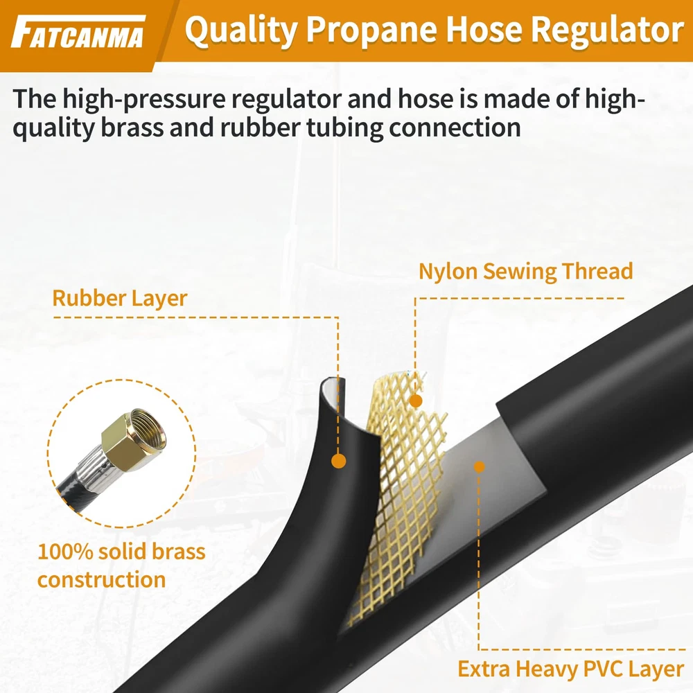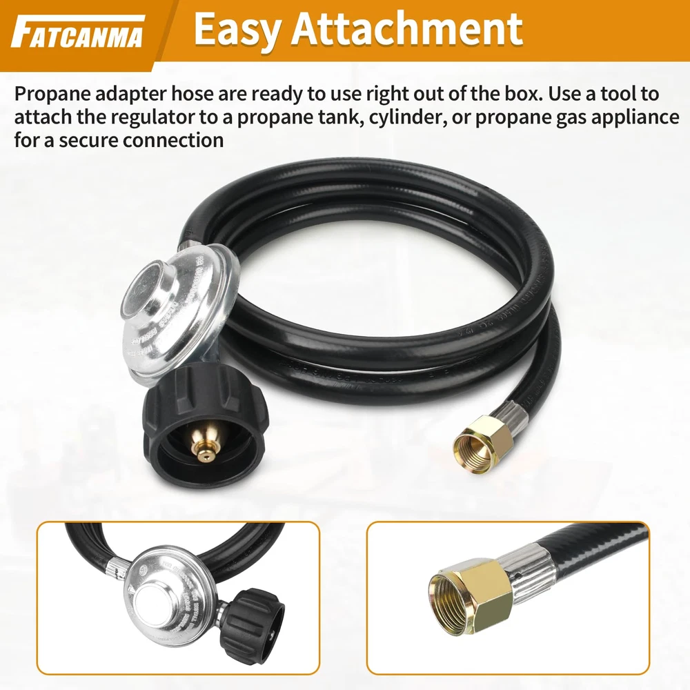 Propane Hose Apply: Gas grill regulator and hose Compatible with most heater, fire pit, lp generator, lantern, two burner camping stove, side burner, Fits for Weber, Char-broil, Nexgrill, Monument, Dyna-Glo, Brinkmann grill and other outdoor propane grills with 3/8" male flare fittings Gas Grill Hose: fits all appliances with a Type 1 (QCC-1) connector. 3/8" female flare, nut thread 5/8"-18UNF, 5/16" diameter propane adapter hose Quality Propane Hose Regulator: The QCC1 low pressure regulator and hose is made of high-quality brass and rubber tubing connection, which ensures a stable connection and a leak-free experience, and has the characteristics of long service life Easy to Use: Propane adapter hose are ready to use right out of the box. Use a tool to attach the regulator to a propane tank, cylinder, or propane gas appliance for a secure connection Note: Please confirm the model and size before purchasing.If you have any questions about this Propane Hose and Regulator, whether it is pre-sales or after-sales, please feel free to contact us through Amazon support for greater assistance