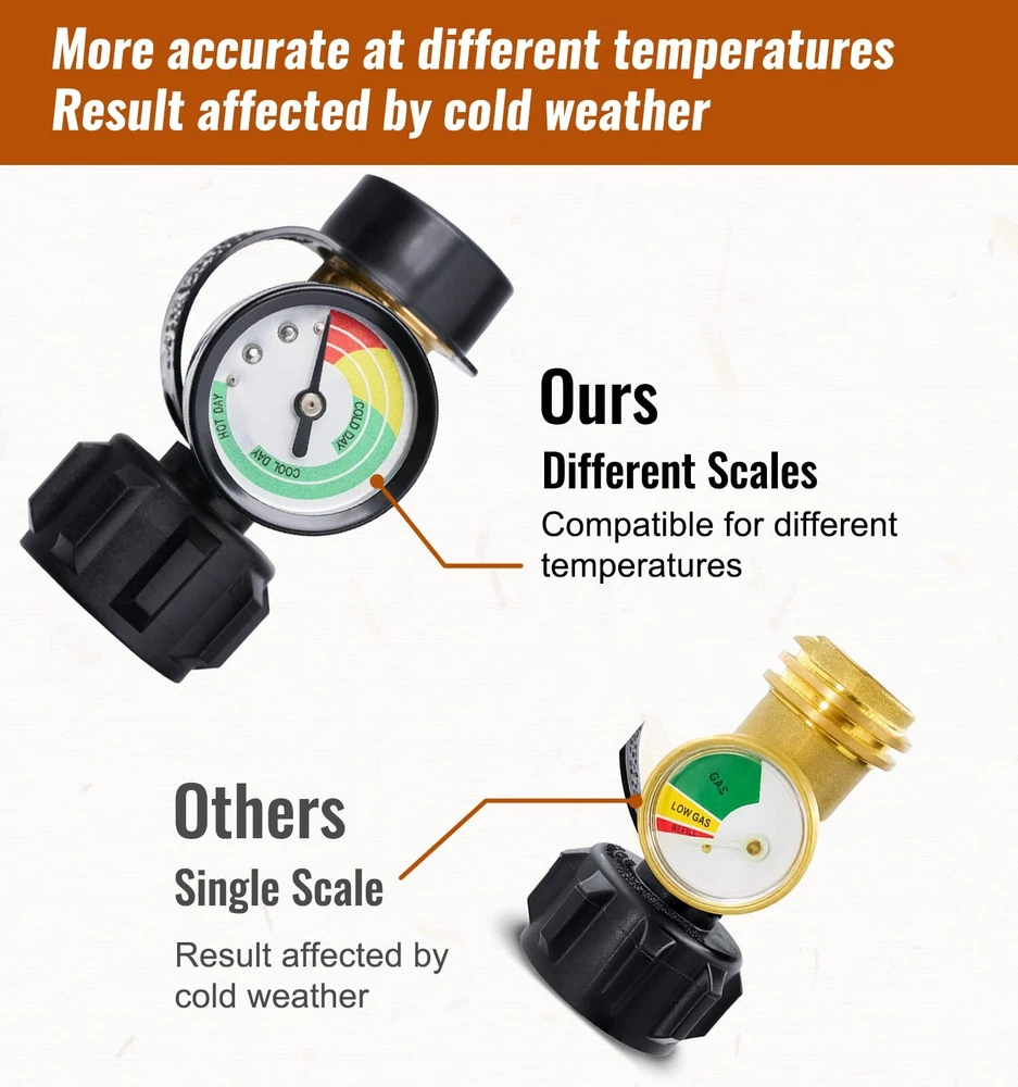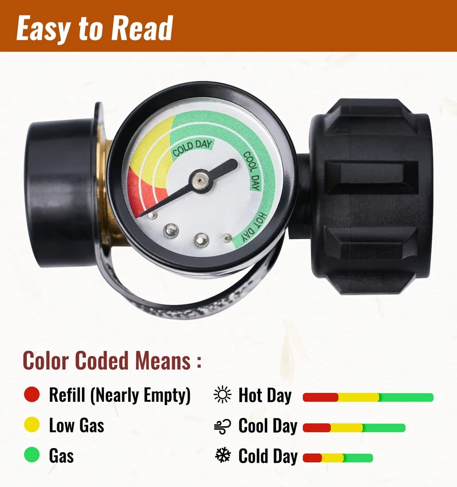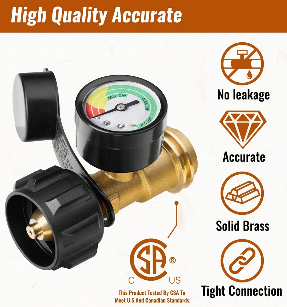 propane tank gauge, universal for grill, heater RV camper and more equipment Specifications Inlet: QCC-1 Outlet: QCC-1 Thread and Female P.O.L. Gas Type: Propane Material: Brass Package Includes: 1 Propane Tank Gauge Feature High quality and accurately standardized brass fittings can better prevent air leakage Excellent sealing quality is promised for your safety. propane regulator has excess flow protection and will automatically shut off, easy to install your propane bottle and propane appliance. Coming with dust cover. WIDELY SUITED - with all appliances with a QCC1 / type1 connection and 5 lb to 40 lb propane tanks, and can be worked with propane tank cylinders, propane regulator with hose and propane adapter MONITOR LEVELS - Use different progress bar to know exactly how much gas is left in the cylinder based on the ambient temperature and know exactly when to refill or replace it. HIGH QUALITY - Pass CSA certificate, providing safety and no leakage. Heavy duty 100% solid brass construction withstands weather, scratching, denting and corroding. EASY TO INSTALL - No tools required and easy to install with the hand-tightening knob, and larger color-coding is easy to read. SAFE - The needle in the green zone means there is plenty of gas, yellow means there is not enough gas, and red means the gas is almost depleted. By checking the air pressure, the propane tank gauge measures the remaining volume of propane. This propane gauge can also be used to observe leaks.