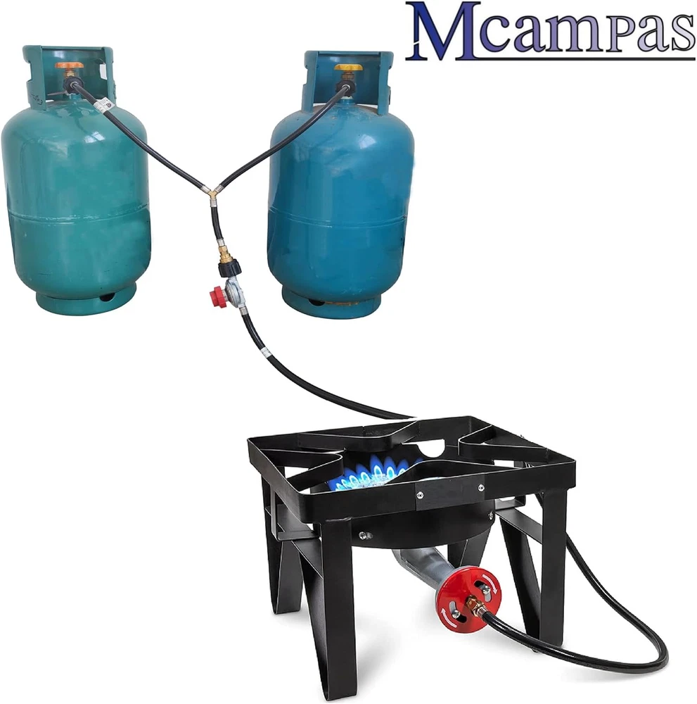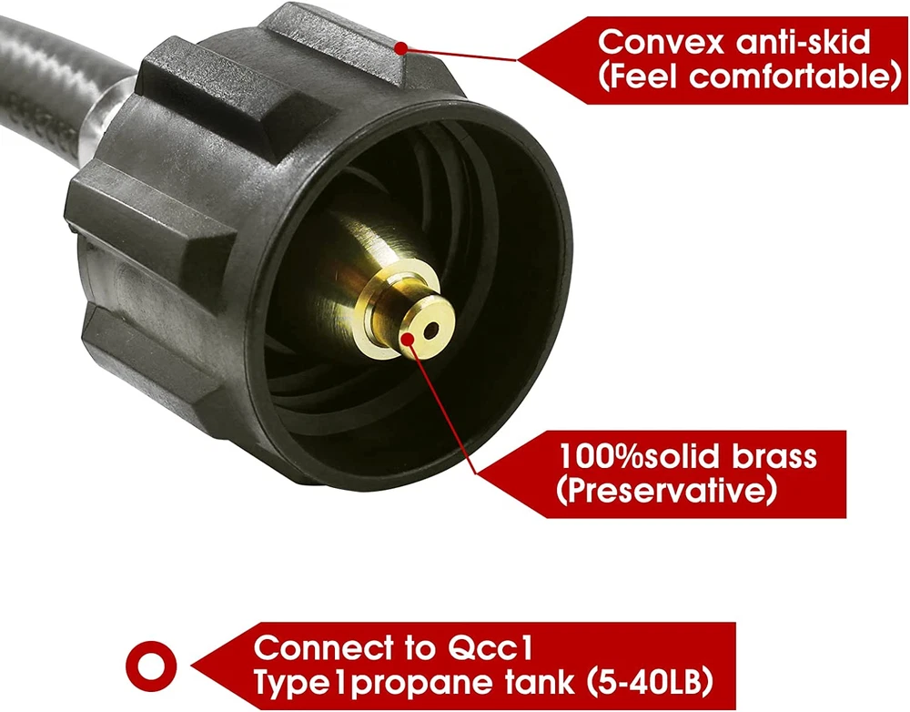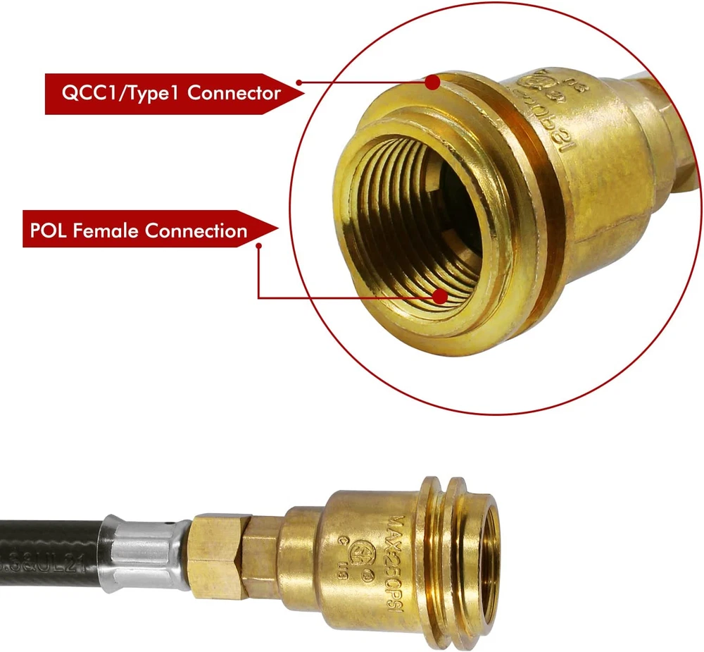 Universal Standard Specifications : Inlet is ACME nut 2 way QCC1/Type1 Tank propane gas fittings, Outlet is QCC1 Nut propane gas fitting adapter. Converter connected to 2 Lp propane gas tank hook up at the same time Features and Benefits: Y- Splitter propane hose converter adapter has CSA certified ,The lengths of the hoses on both sides of the splitter are 15.75 inch (400 mm ) respectively; The outlet branch pipe long 4.5 inch (100 mm); the maximum working pressure is 350 PSI; and it is suitable for 5 lb - 40 lb tanks. One device can connect two propane tanks at the same time. Outstanding Design : the outlet branch fitting is end outer QCC1/Typ1 male thread with inner POL female therad fitting adapter; which can be used to connect POL valve and QCC1 connector propane hose regulator Premium Quality: the dual propane tank connection kit is made of high-quality rubber, and 2 way splitter adapters are made of solid brass,built-in over-current and over-heat protection design; easy installation ,noot tools you can connect two propane tank equipment at the same time ; which can extend the use time. Don't worry that the propane will be used up quickly during use, and the operation is simple and convenient Wide range of applications: suitable for propane system RV trailers, fishing gear, turkey fryers, barbecues, lanterns, heaters, camping stoves, portable barbecues, desktop barbecues, camping stove,outdoor propane burner gas cooker, forge burner, heating needs or outdoor barbecues, etc
