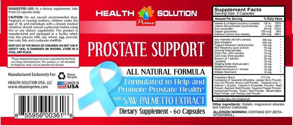 PROSTATE SUPPORT SAW PALMETTO EXTRACT Formulated to Help and Promote Prostate Health Dietary Supplement Made in USA 1 Bottle 60 Capsules BENEFITS: Boost testosterone levels Improve prostate health Increase urinary tract function Increase muscle mass Maximize kidney health Reduce hair loss Increase libido Saw Palmetto As men grow older , many experience declining prostate health that significantly affects their lifestyle and well-being. One of the most common conditions threatening the prostate gland is benign prostatic problems. This swelling of the prostate gland can lead to myriad symptoms such as increased urinary frequency, weak urinary stream, and difficulty initiating urination. For more than a century, Saw Palmetto (Sabal serrulata) has been recognized for its ability to relieve swelling of the prostate gland. In fact, saw palmetto is one of the most popular plant-derived remedies for benign prostatic problems. Doctors in Germany, Austria, and Italy use saw palmetto, along with other plant extracts like Pygeum and Nettle Root , as a first-line support for enlargement of the prostate gland. Benefits for Prostate Health Benign prostatic hypertrophy is a common condition that becomes increasingly prevalent in aging men. BPH affects 8% of all men at the age of 40, 60% of men in their seventies, and 90% of men in their eighties. One fourth of these men will develop moderate-to-severe lower urinary tract symptoms that will greatly affect their quality of life. The prostate gland’s sole function is to secrete fluid containing substances needed for reproduction. Research has shown that saw palmetto is an effective inhibitor of activity in prostate gland tissue. Extensive research supports saw palmetto’s benefits for prostate health, greater improvement of urinary tract symptoms and urinary flow measures. Furthermore, the experimental group saw a decrease in episodes of nighttime urination and an improvement in peak urinary flow. Preventing and Managing Hair Loss Supplementation with saw palmetto may prove useful in preventing and managing hair loss. It has been estimated that there are between 100,000 and 150,000 hairs on the human scalp. On average, between 50 and 150 hairs may be lost each day. Baldness occurs when this hair loss occurs at an abnormally high rate or when hair replacement occurs at an abnormally slow rate. Summary For over 200 years, saw palmetto has been used to prevent and improve the symptoms associated with prostate health in men. Growing evidence indicates that supplementing with saw palmetto may also positively modulate the complex system of metabolism in men and women alike. Saw palmetto’s effects on metabolism may have important implications for health restoration programs as well as for supporting healthy hair growth and preventing hair loss. Supplement Facts Serving Size: 3 Capsules Amount per serving % Daily Value Vitamin E (d-Alpha tocopheryl acetate) 130 IU 100% Vitamin B6 (pyridoxine hydrochloride) 5mg 250% Zinc (picolinate) 50mg 333% Copper (gluconate) 750 mcg 38% Selenium (amino acid chelate) 200 mcg 286% Saw Palmetto (40-45% extract) 300 mg Beta-Sitosterol 450 mg Pygeum Africanum (herb powder) 150 mg Red Raspberry (juice extract) 75 mg Graviola (herb powder) 75 mg Green Tea (50% extract) 75 mg Cat’s Claw (herb powder) 45 mg Broccoli (4:1 extract) 30 mg Lycopene 15 mg Stinging Nettle (herb powder) 30 mg Maitake Mushroom 15 mg Reishi Mushroom 4:1 Extract 15 mg Shitake Mushroom 15 mg Proprietary Blend Consisting of: Quercelin Dihydrate, Juniper Berry Powder, Uva Ursi Powder, Buchu Leaf Powder, Glutamic Acid, Lalanine, L-Glycine, Calcium D-Glucarate, Pumpkin Seed Powder, Burdock Root Powder, Cayenne Pepper Powder,Goldenseal Powder, Gravel Root Powder, Marshmallow Root Powder, Parsley Leaf Powder Other ingredients: Gelatin, magnesium stearate and Calcium Carbonate. ALLERGEN WARNING : CONTAINS SOY (BETA- SITOSTEROL) SUGGESTED USE : As a dietary supplement, take three (3) capsules daily. CAUTION : Do not exceed recommended dose. Pregnant or nursing mothers, children under the age of 18, and individuals with a known medical condition should consult a physician before using this or any dietary supplement. This product is manufactured and packaged in a facility which may also process milk, soy, wheat, egg, peanuts,tree nuts,Fish, and crustacean shelfish. KEEP OUT OF THE REACH OF CHILDREN. DO NOT USE IF SAFETY SEAL IS DAMAGED OR MISSING. STORE IN A COOL, DRY PLACE *These statements have not been evaluated by the Food and Drug Administration. This product is not intended to diagnose, treat, or prevent any disease. PREMIUM QUALITY PRODUCT