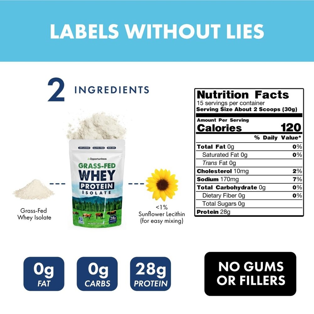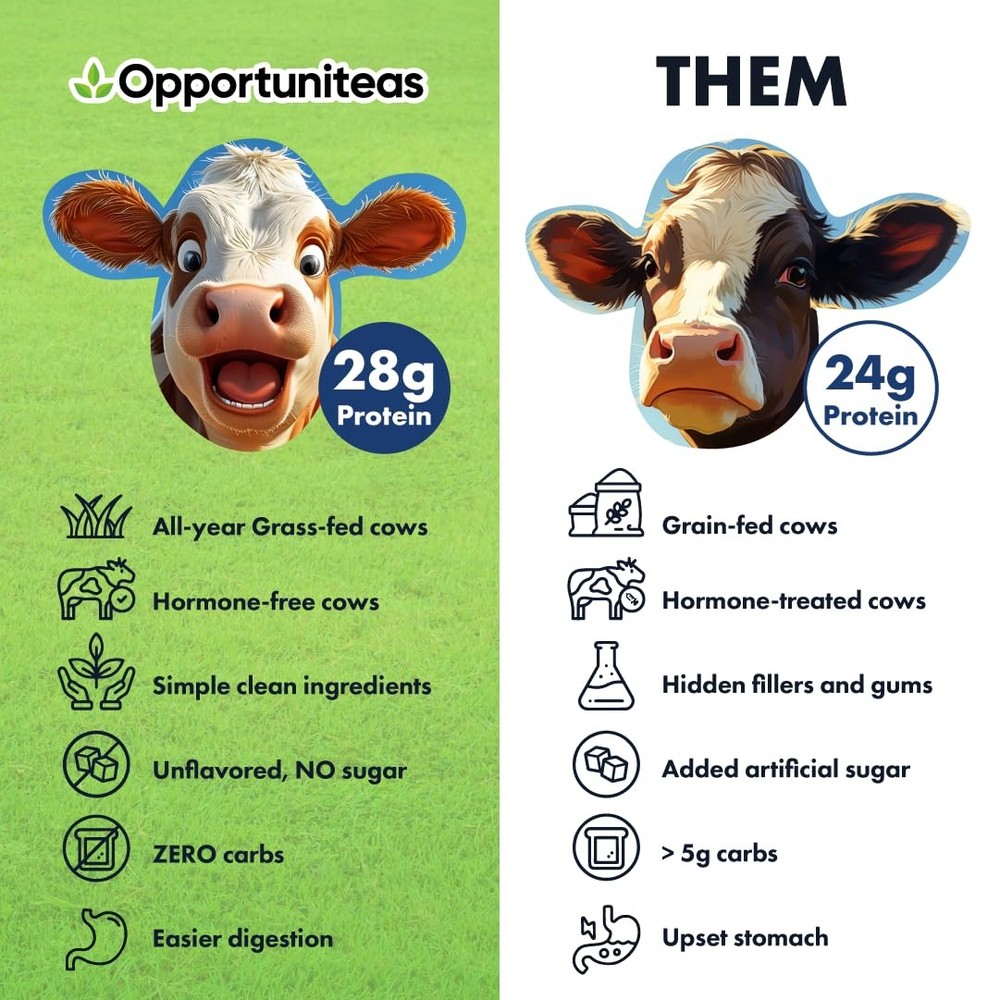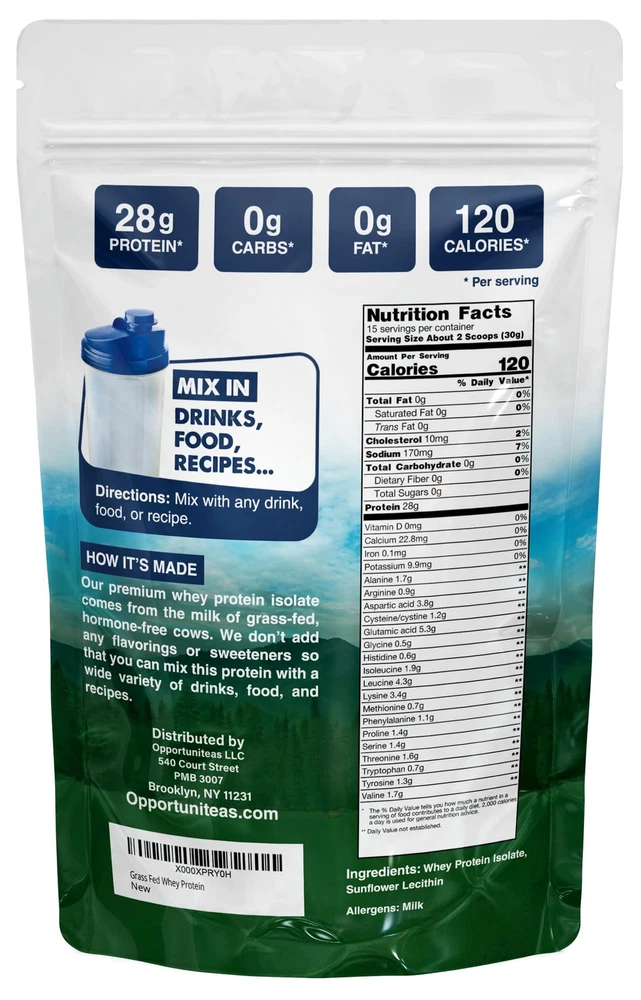 MADE FROM HAPPY GRASS-FED, HORMONE-FREE COWS - Whey protein derived from conventional dairy farming may contain harmful substances since the cows can be subject to hormonal and antibiotic use, which may be stored in the human body and can affect the overall nutritional composition of the whey. Our whey comes from completely hormone-free cows, who get to freely graze on pasture at least 350 days a year, producing high-quality, more nutrient-dense whey isolate protein. LOW-LACTOSE, UN-DENATURED, WITHOUT SUGAR OR PRESERVATIVES - Our unflavored 100% grass fed whey protein isolate powder is low lactose, un-denatured (pure, with properly functioning proteins without any structural deformation, intact with all bioavailable nutrients and constituents), it does not have any added sugar, sweeteners, preservatives, colors, or flavorings. Low-temperature drying techniques give it a better taste and texture compared to ordinary whey protein. NO UPSET STOMACH – Simple ingredients means no upset stomach! Our ingredient list is 99% pure isolate protein powder and less than 1% non-GMO sunflower lecithin for easy mixing. You're getting the essential nutrients your body needs to thrive without any artificial fillers or flavors to get in the way. 28 GRAMS OF DELICIOUS ISOLATE WHEY PROTEIN - Opportuniteas offers the highest protein concentrations ensuring you get the protein your muscles need. Isolate Whey is processed to reduce its fat and lactose content, leaving mainly protein. If you are striving to build lean muscle, recover faster, or simply live a healthier lifestyle, this is for you. Don't worry about clumps; mix it in hot or cold drinks, or add it to your cooking or baking recipes. Enjoy it and elevate your well-being. MADE THE RIGHT WAY - At Opportuniteas we make effective, transparent, and affordable products you can confidently recommend to your family. We are committed to making a positive impact on people and our planet. As a proud member of the 1% for the Planet network we donate 1% of our profits to help solve our planet’s most pressing issues. If you don't love our product, we offer a no-questions-asked full refund.